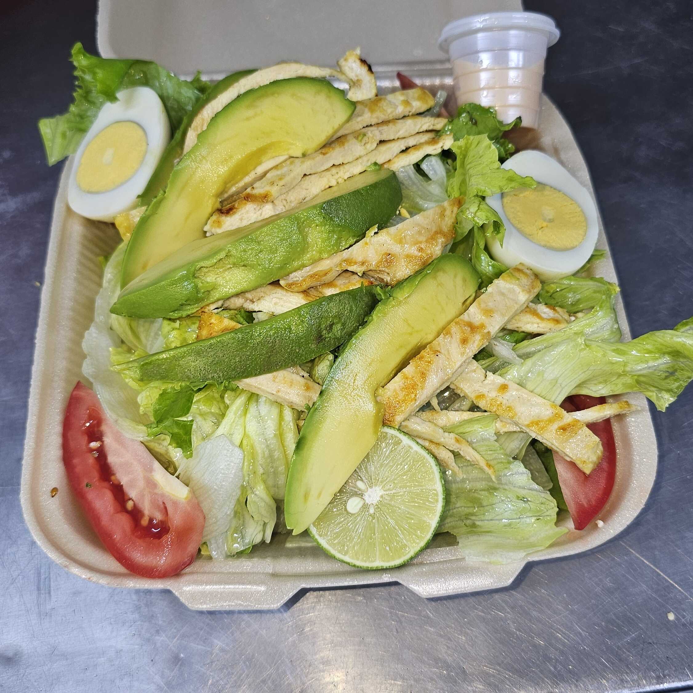 Ingredientes altamente seleccionados lechuga (romana e italiana) , jitomate, aguacate, huevo duro, pollo deshebrado, queso chihuahua, jamón de olivo sal limón aderezo de la casa.