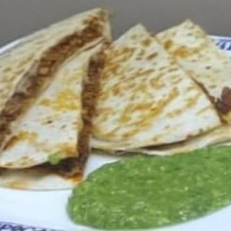 4 tortillas de harina con queso manchego y bistec, acompañadas con una porcion de guacamole
