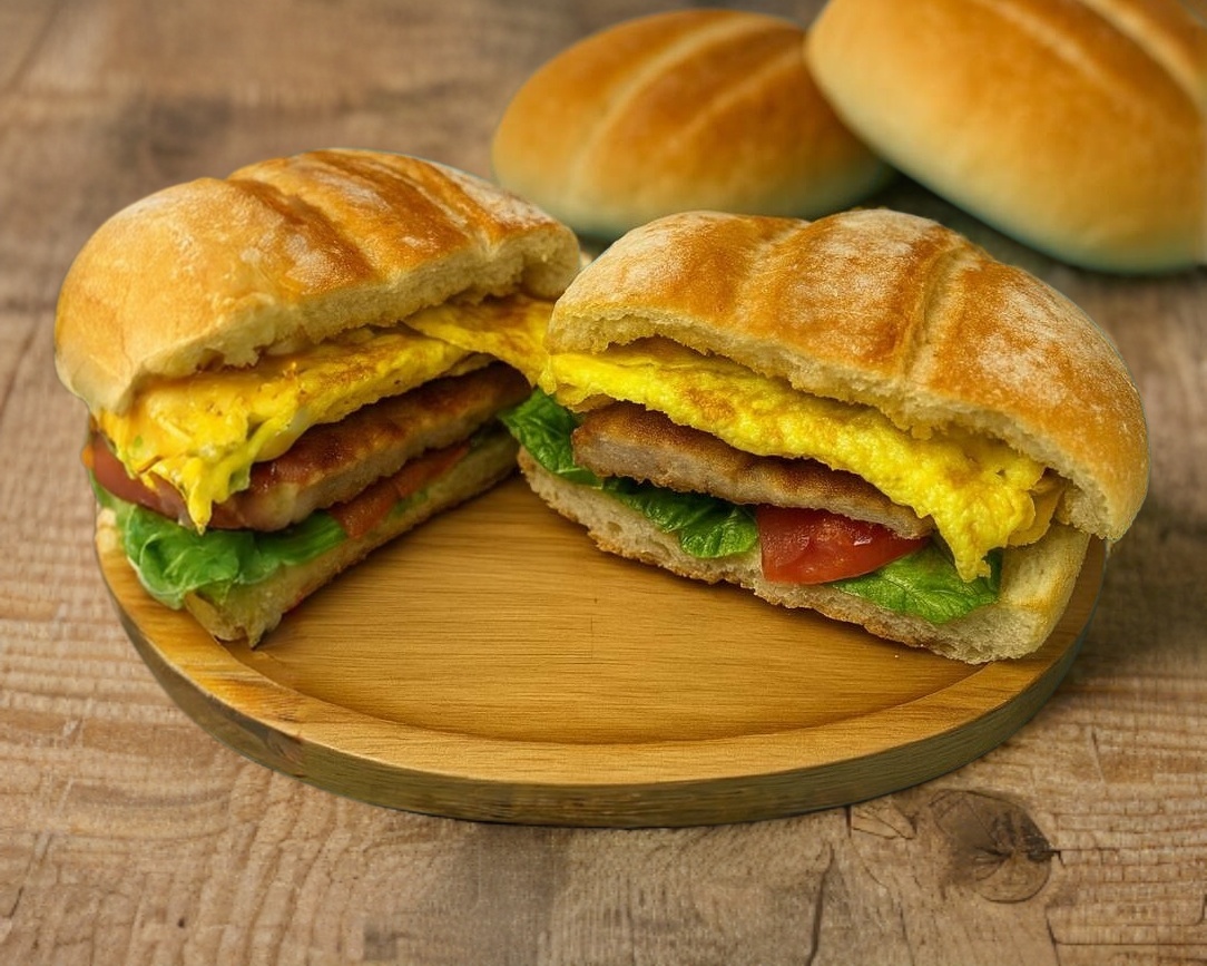 Croissant recién horneado relleno de huevo, queso amarillo y tocino crujiente. Calientito, suave y perfecto.