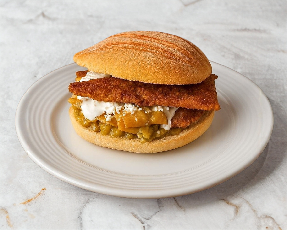 Pan de telera dorada, rellena de milanesa empanizada crujiente, acompañada de chilaquiles verdes con crema y queso. El equilibrio perfecto entre lo crocante y lo cremoso.