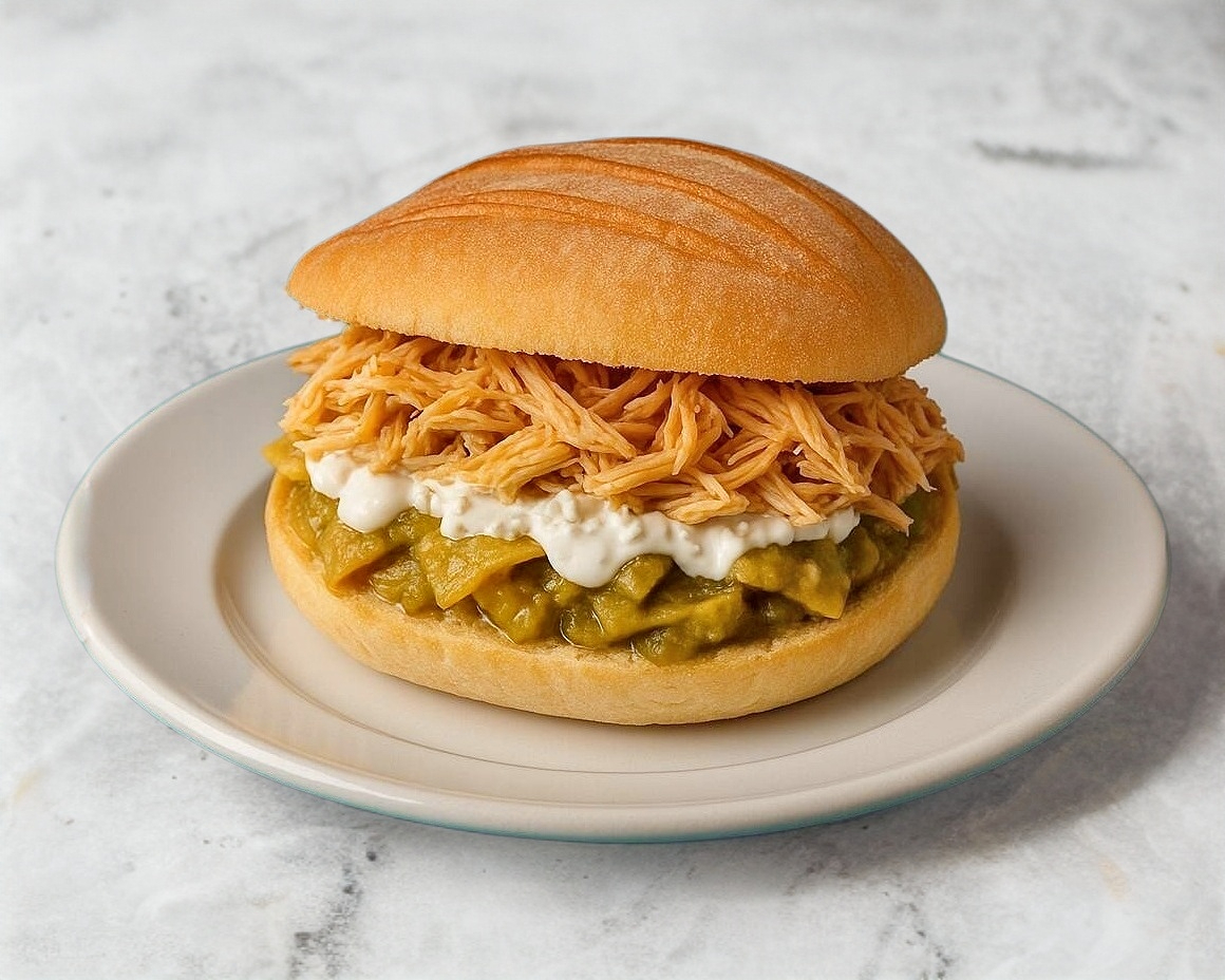 Telera rellena de pollo deshebrado jugoso, combinada con chilaquiles verdes bañados en salsa, crema y queso fresco. Una explosión de sabor mexicano en cada mordida.
