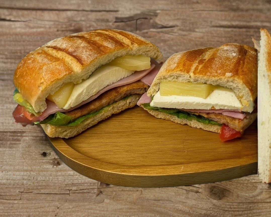 ¿Antojo tropical? Esta torta trae milanesa, jamón, piña dorada, triple queso y verduras en pan de telera. ¡Una explosión de sabor que no falla!