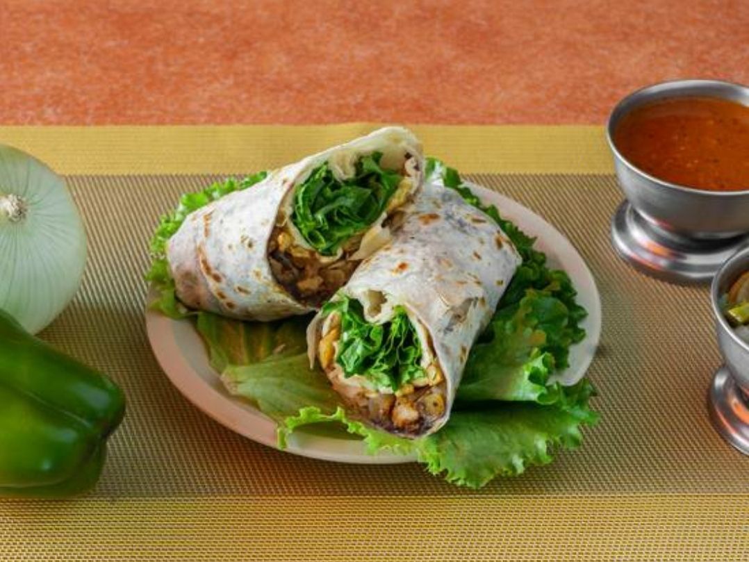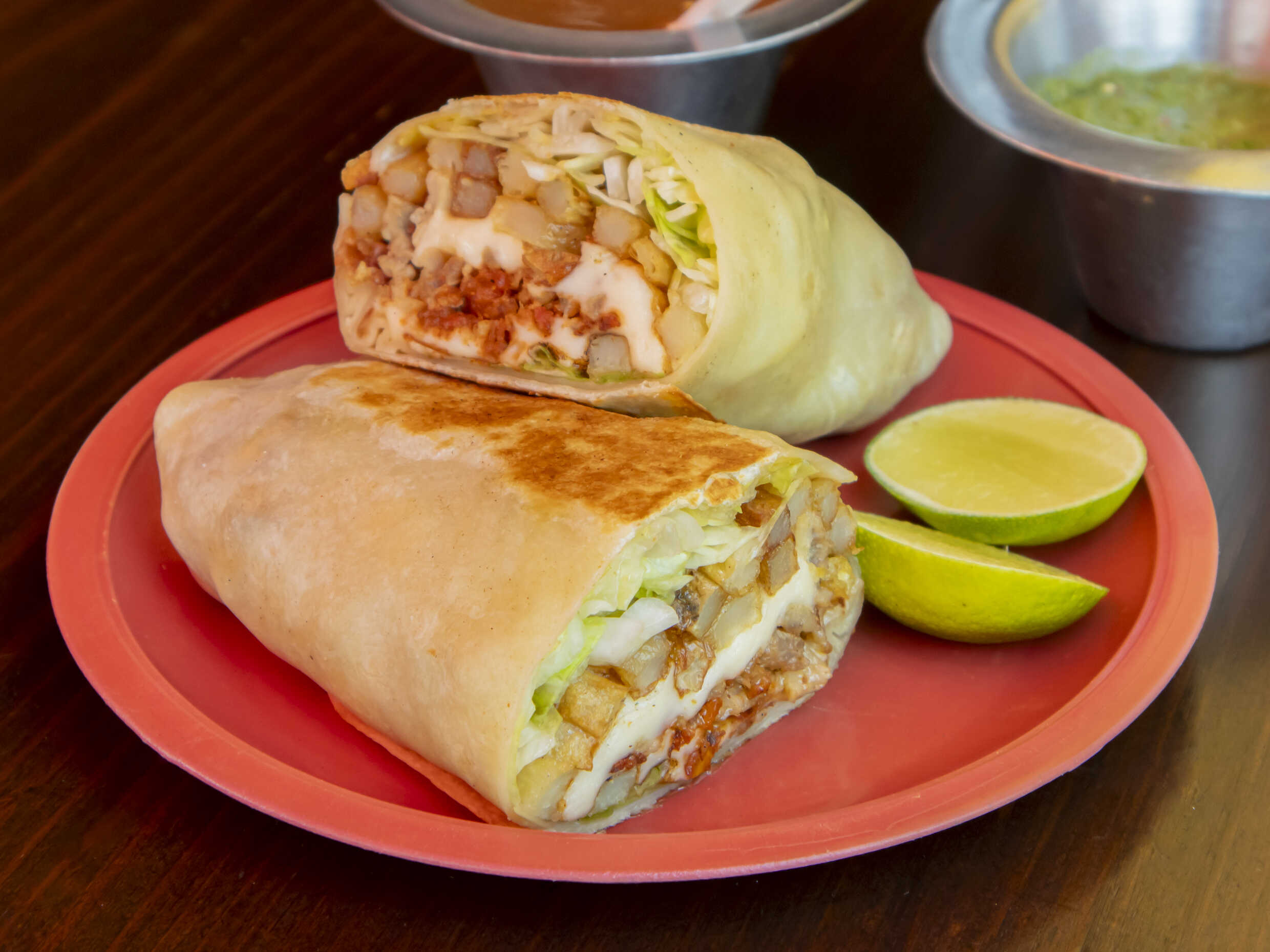 1 burrito campechano de longaniza y bistec dividido a la mitad para porción individual relleno con lechuga fresca,papas a la francesa, queso Oaxaca, frijoles, limón y 1 salsa a elegir verde, roja o de tamarindo(porcion personal)