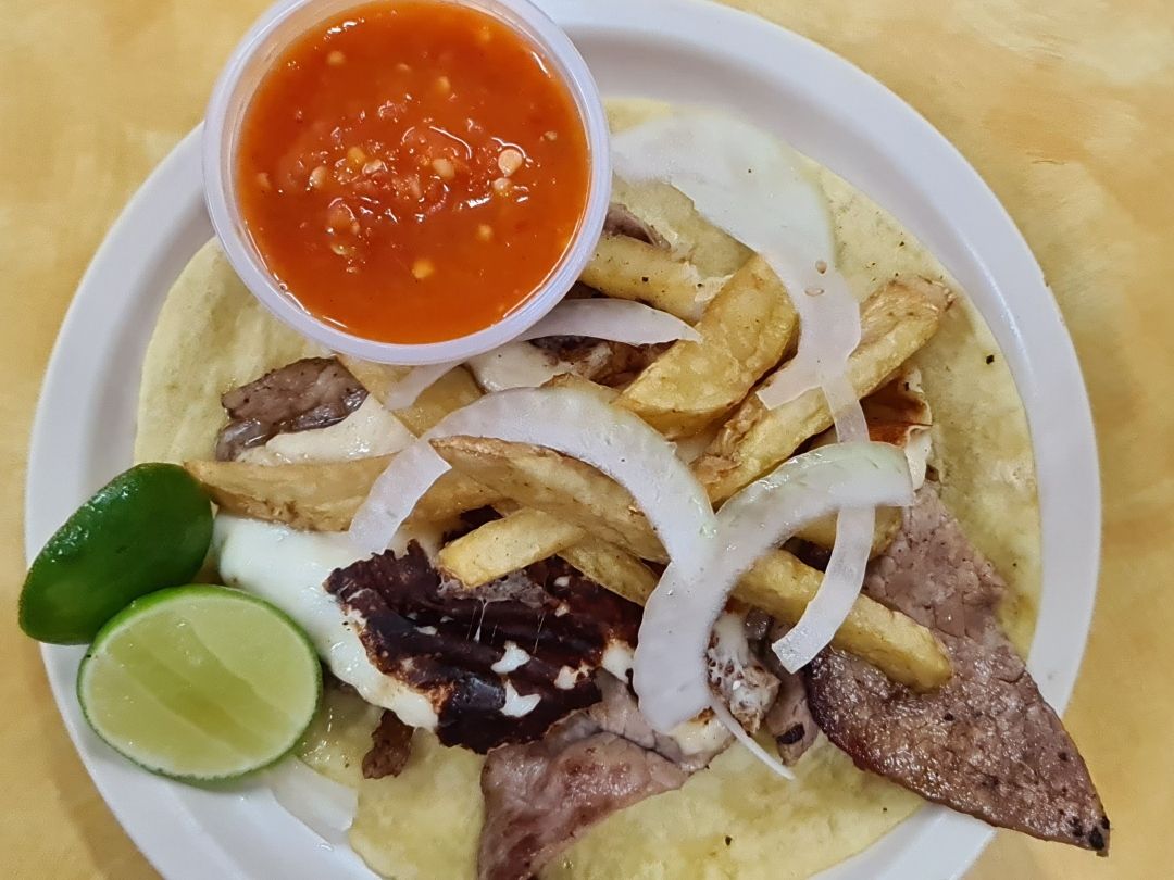 Lomo de cerdo, cebolla, ajo, quesillo, servido con tortilla de harina.