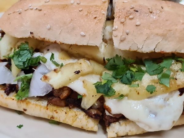 Milanesa, piña, quesillo, aguacate, jitomate y cebolla.