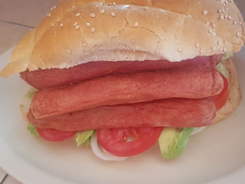 Deliciosa milanesa dorada acompañada de salchicha doradita, queso, aguacate, jitomate y cebolla.