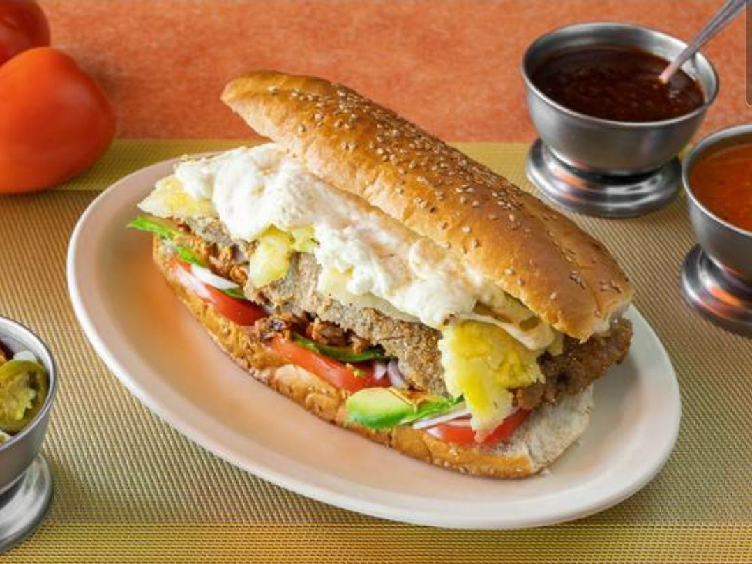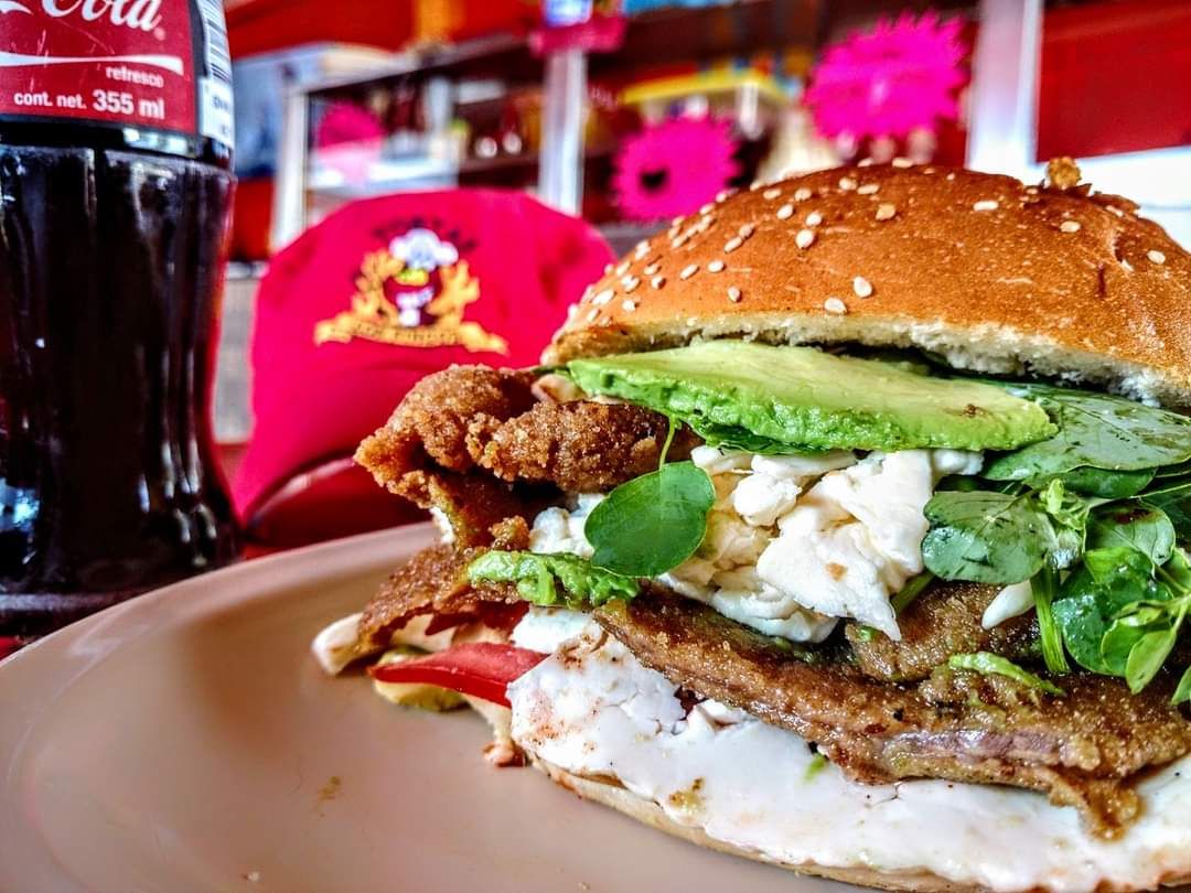 torta de milanesa de cerdo con aguacate fresco, jitomate y cebolla blanca. Acompañada de salsa de chile servida aparte para que la disfrutes a tu gusto