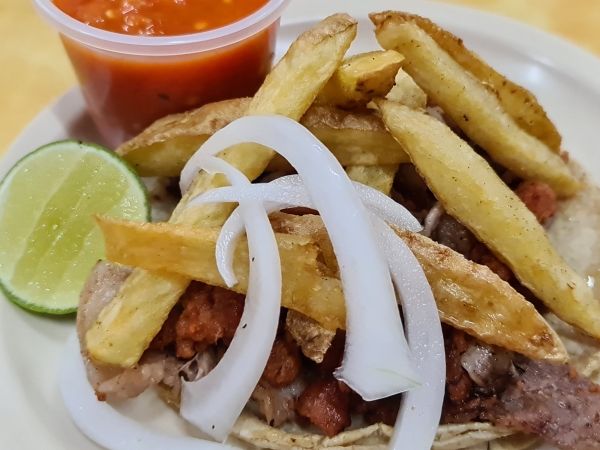 Bistec, carne al pastor, tocino, cebolla, morrón y queso.