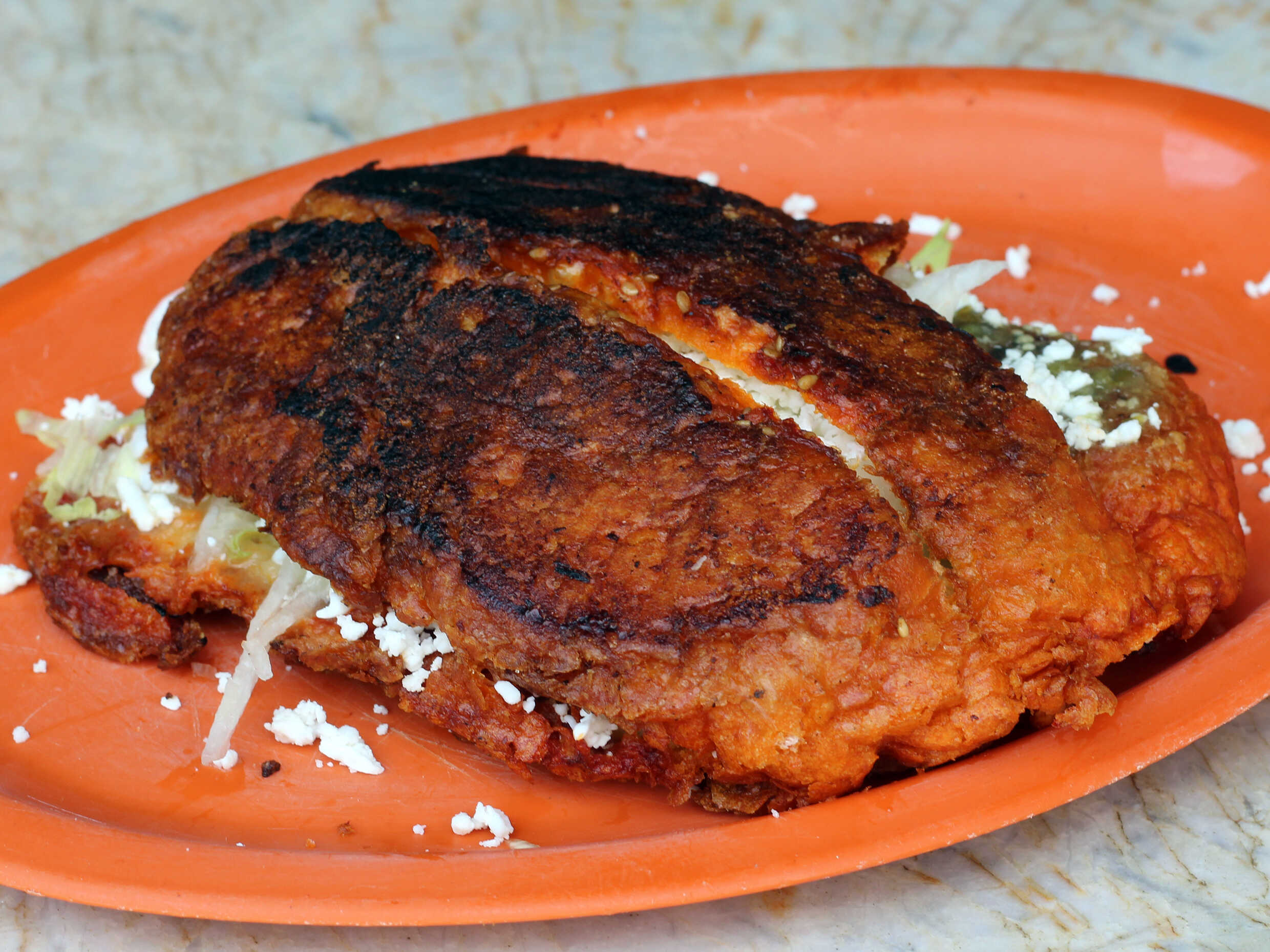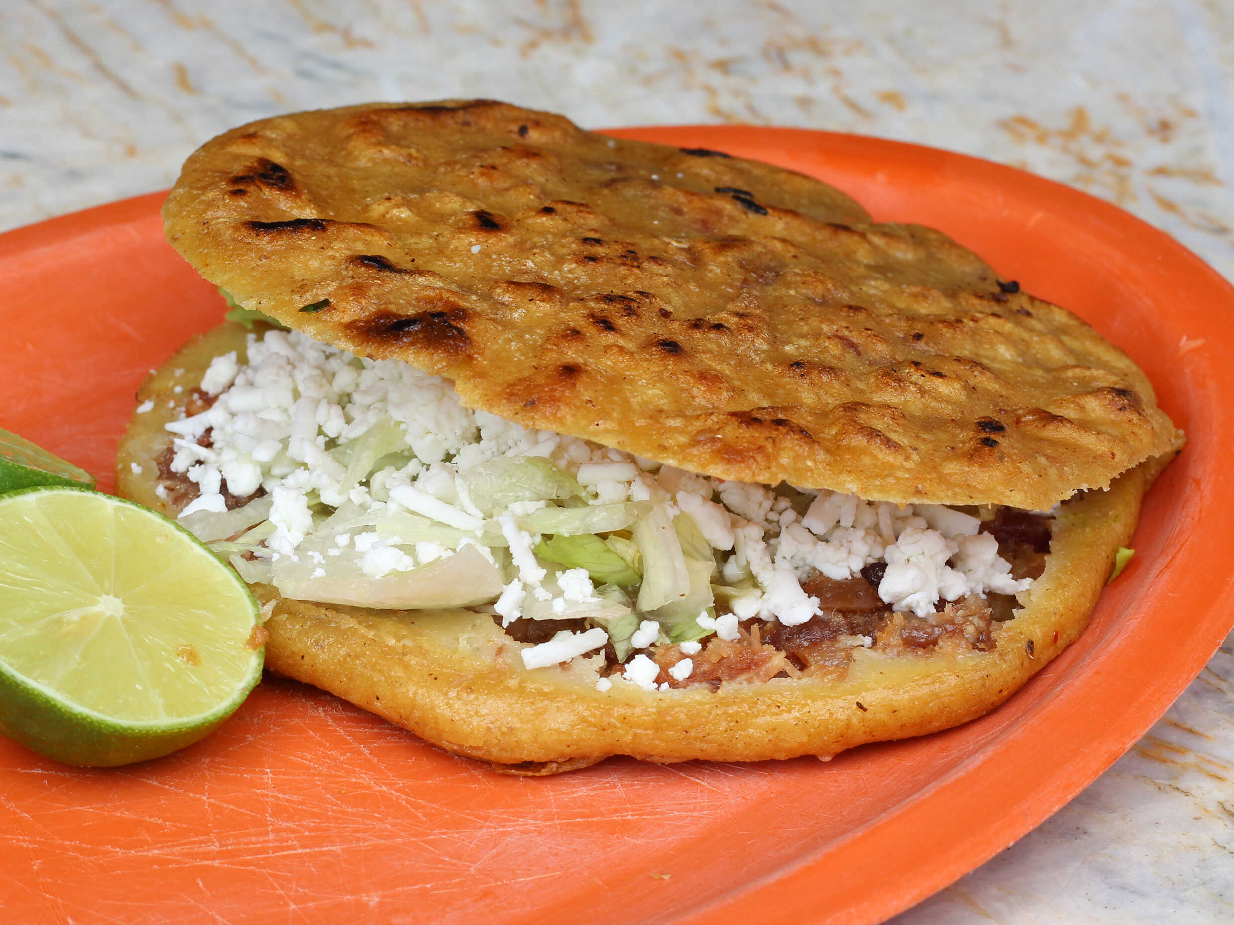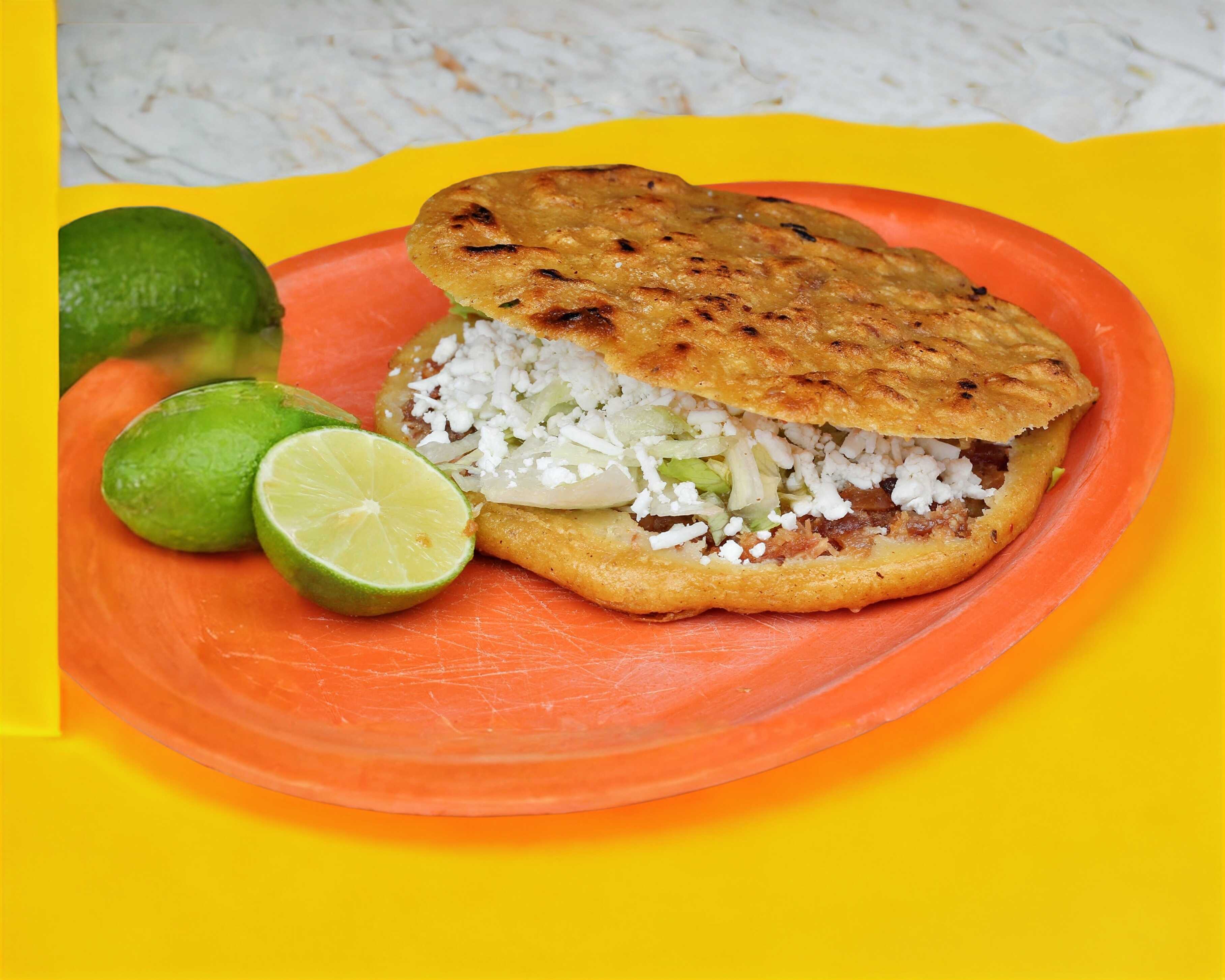 Pambazo de papa combinado con un guisado de tu preferencia, acompañado de lechuga, queso, crema y salsa verde y roja