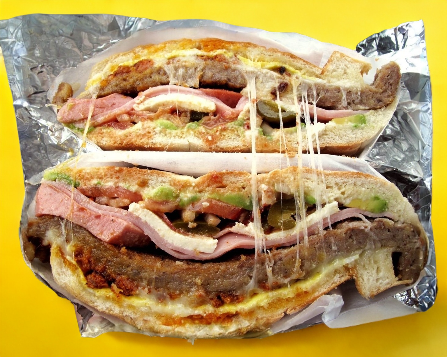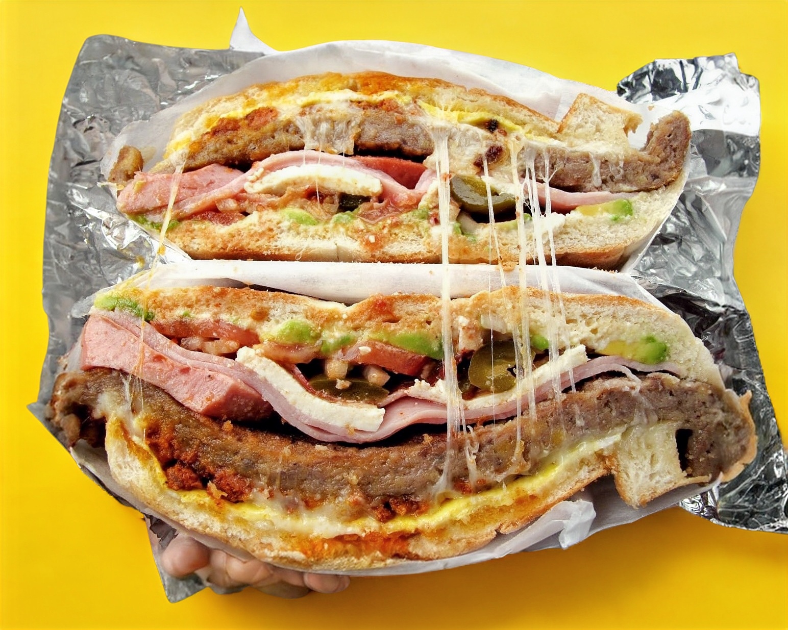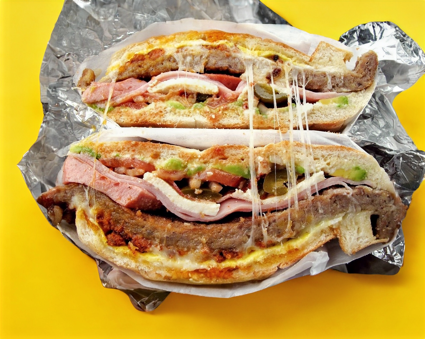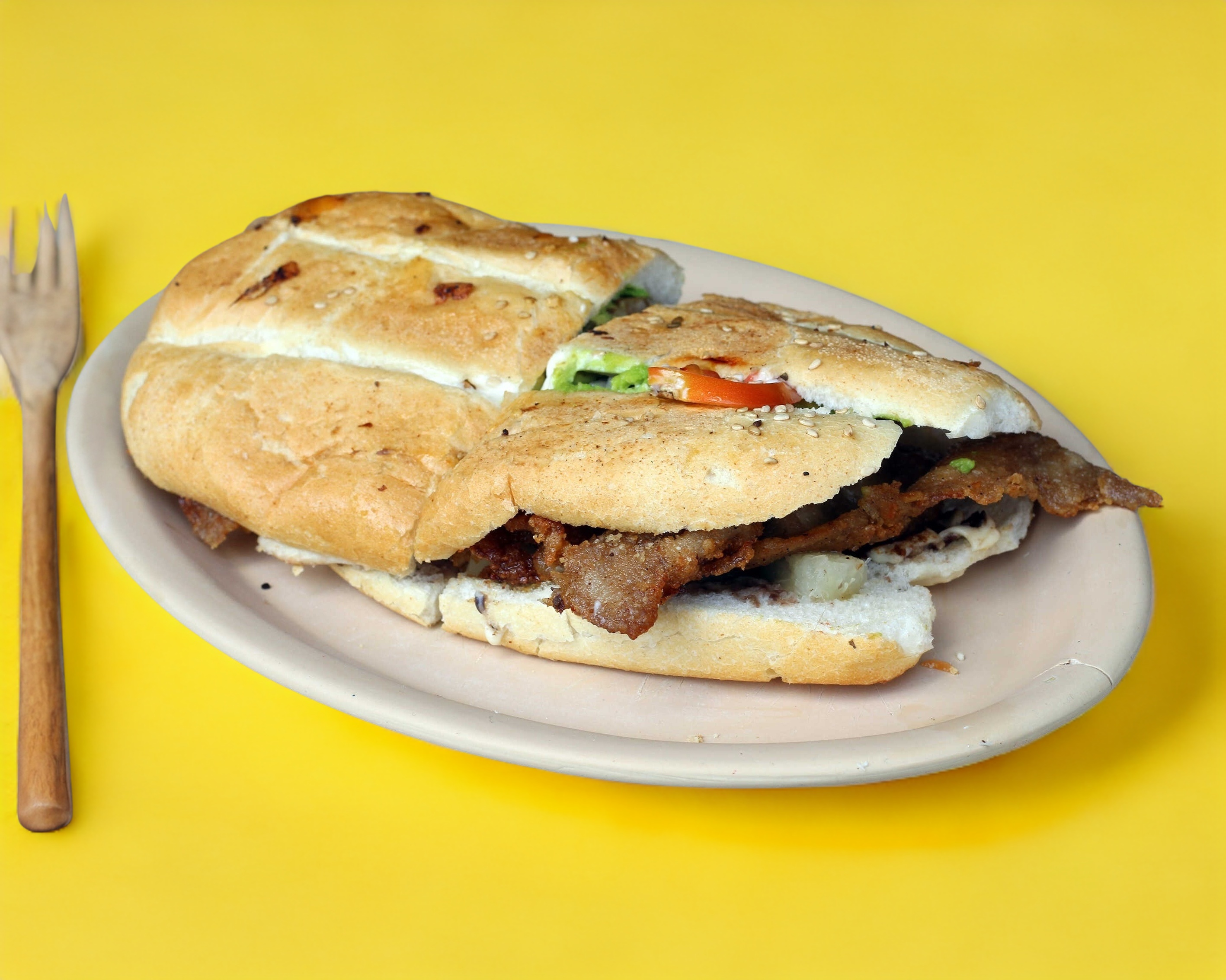 1 pieza Torta partida en dos aproximadamente 25 cm, pan tradicional, relleno de pierna, milanesa y quesillo jitomate, tomate, cebolla y chipotle.