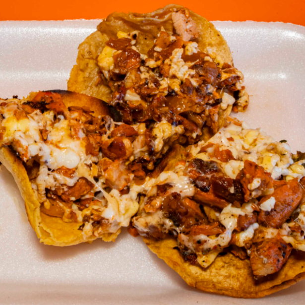 3 ricos volcanes con carne al pastor en tortilla taquera doradita