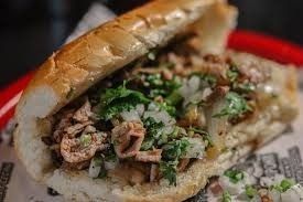 Sabrosa torta de suadero en bolillo de tamaño tradicional aderezada con frijoles