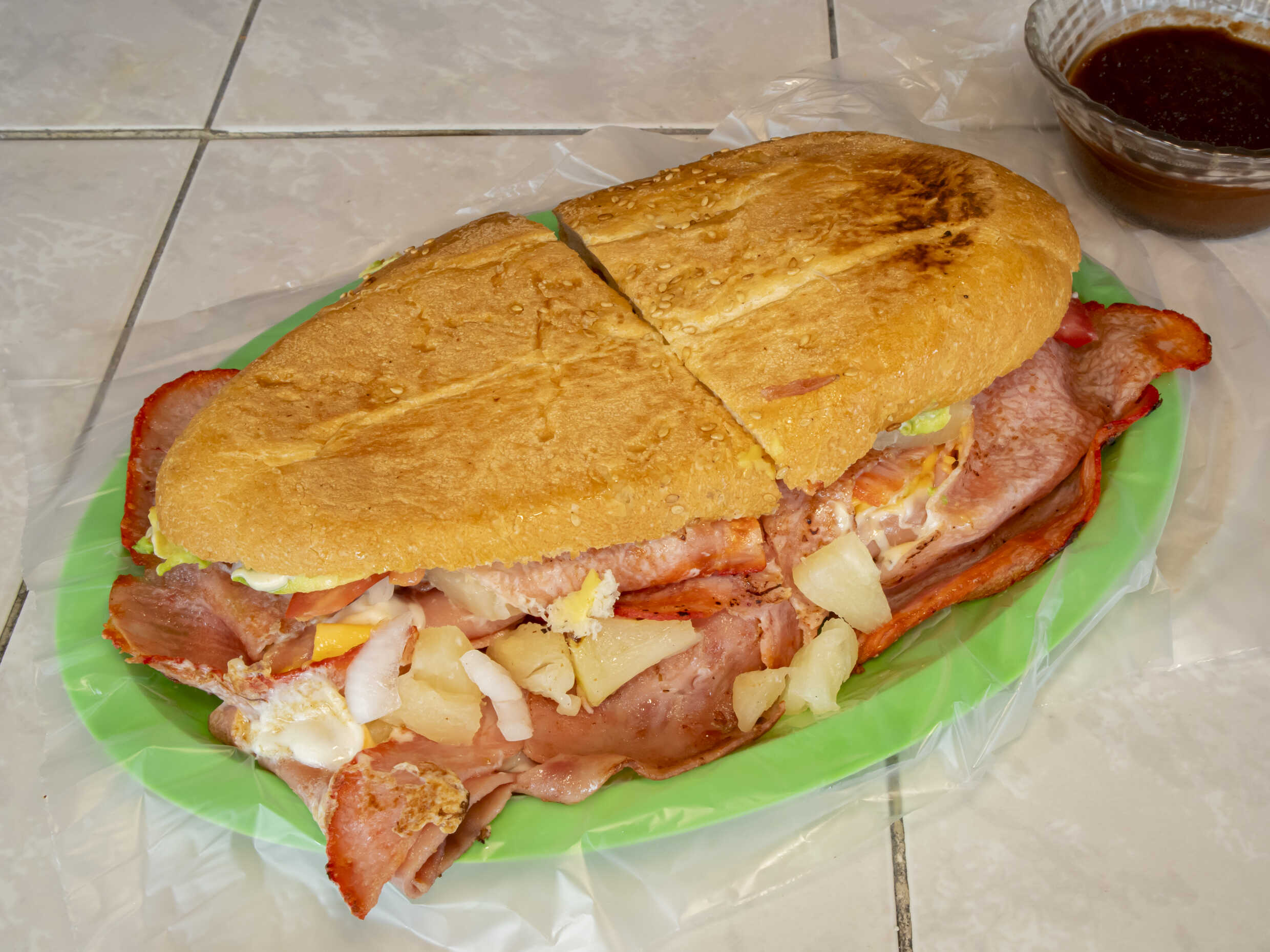 Piña, pierna, jamón, queso oaxaca, queso amarillo y queso blanco.