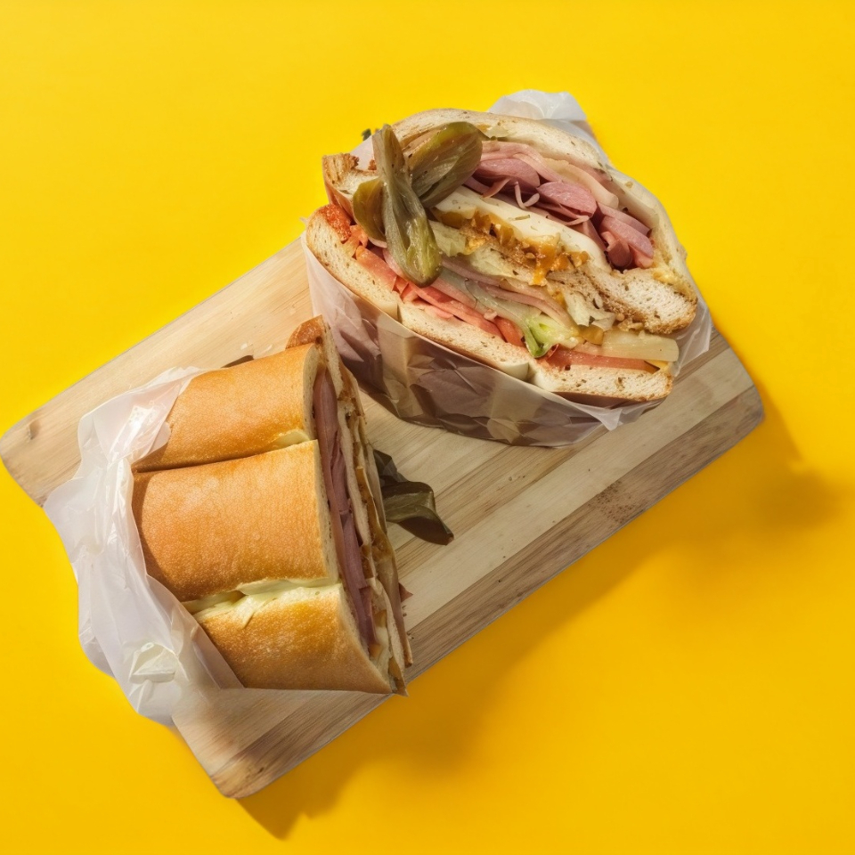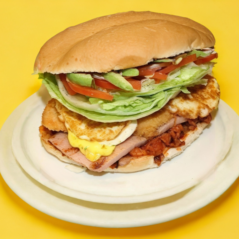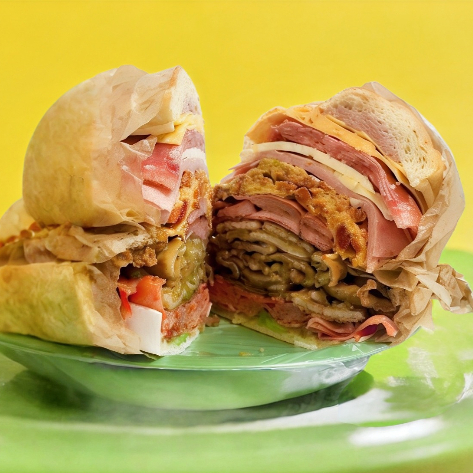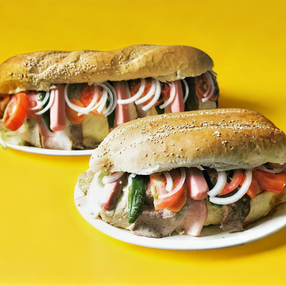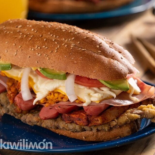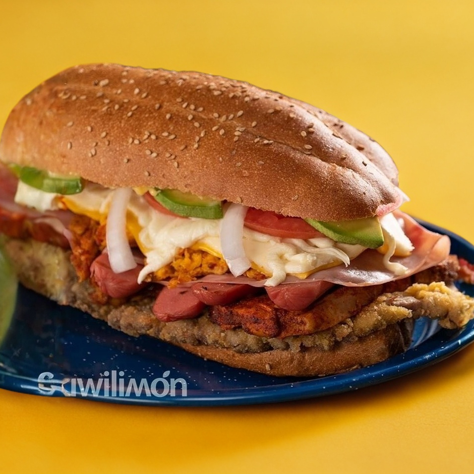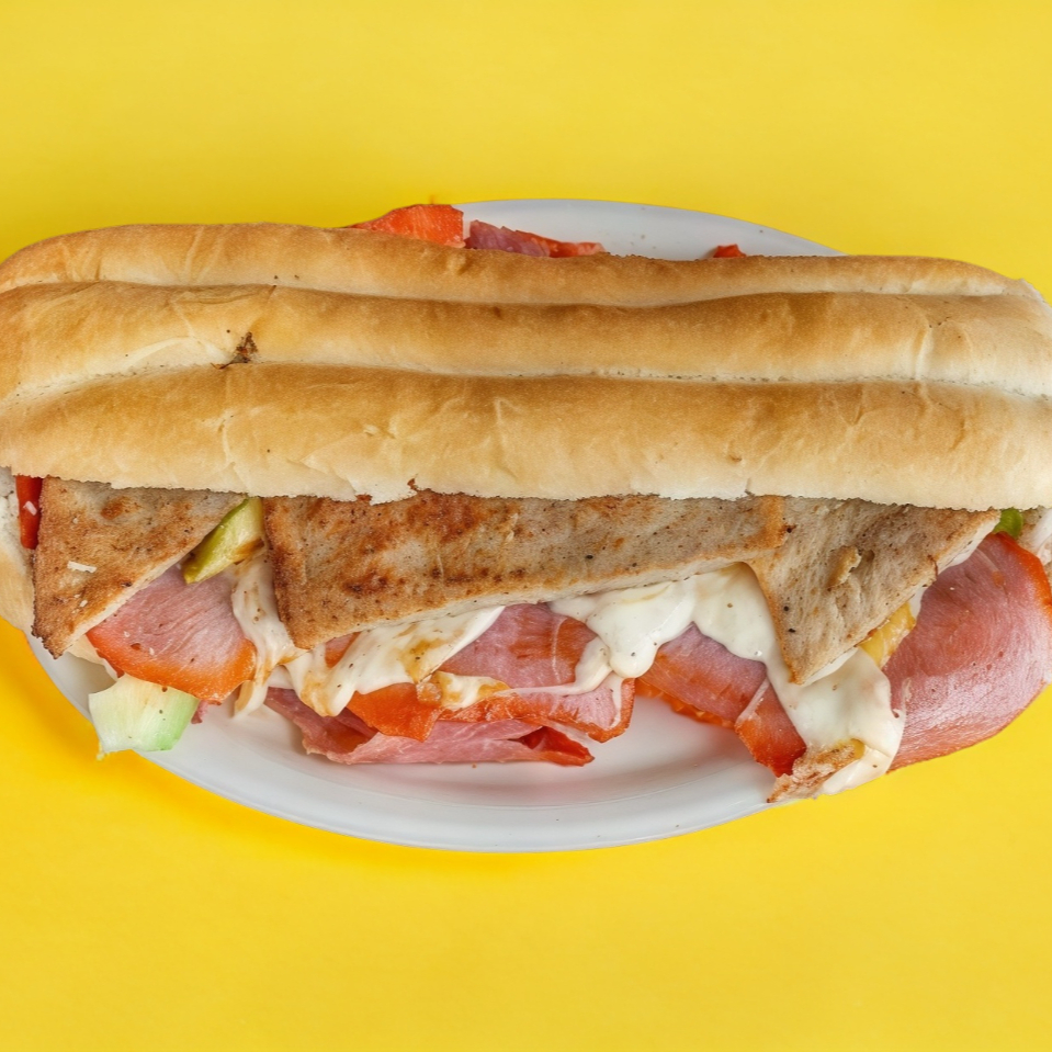 Tortas Poca Madre Milanesa, Pierna, Jamon, Salchicha, Queso Oaxaca y Amarillo, Jitomate, Cebolla, Mayonesa