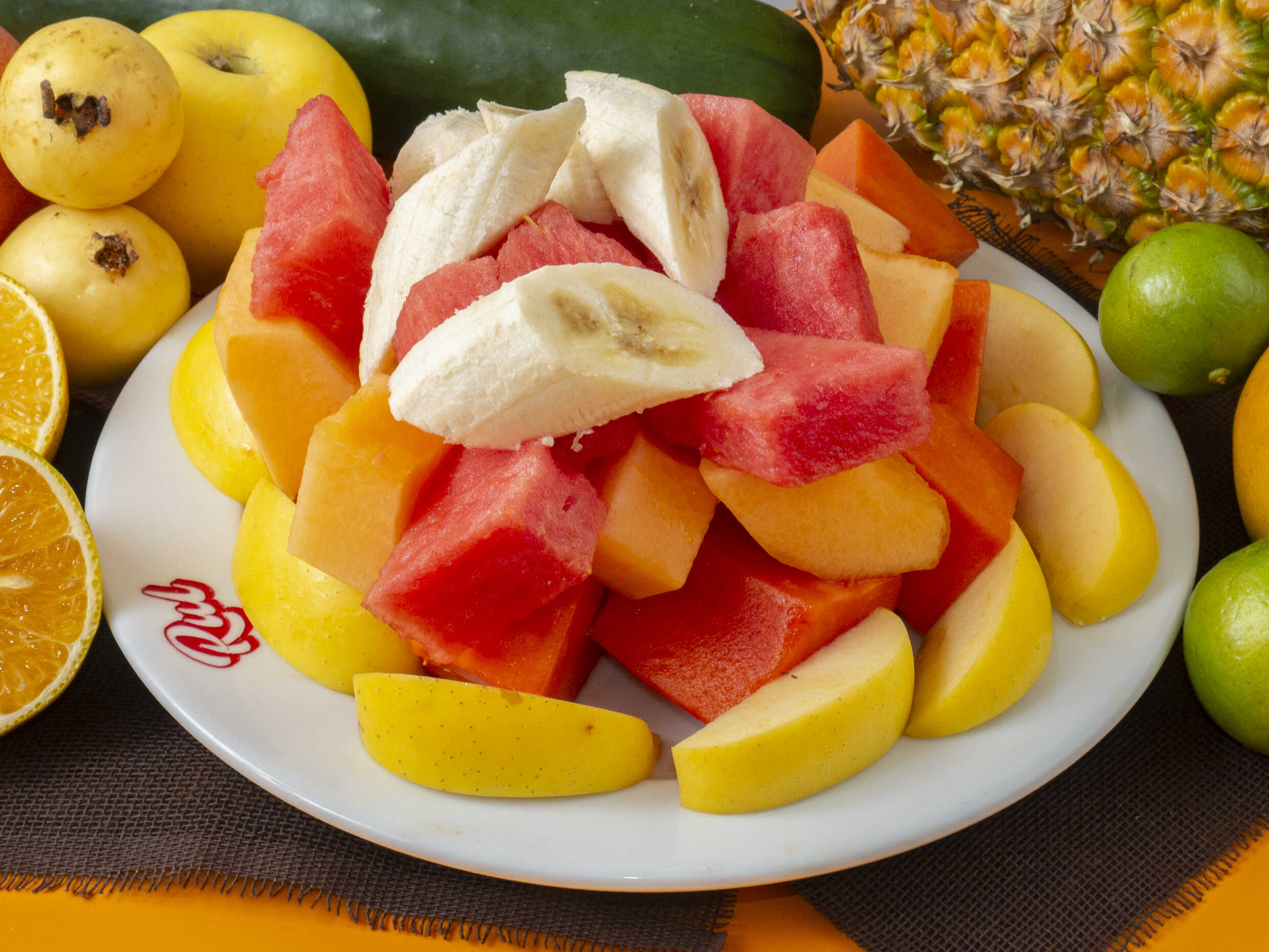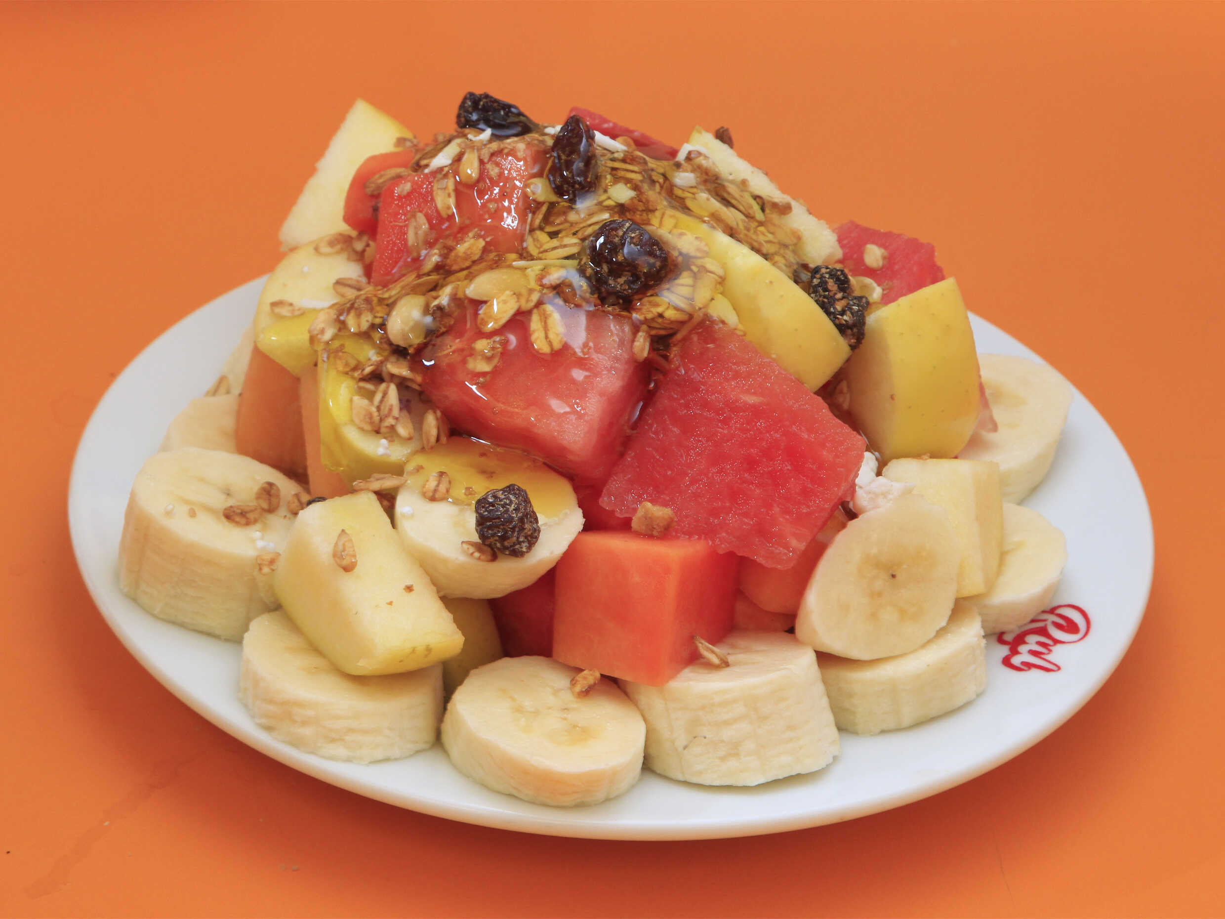 Melón, papaya, sandía, manzana, plátano, guayaba se acompaña con miel, granola y Chantilly.