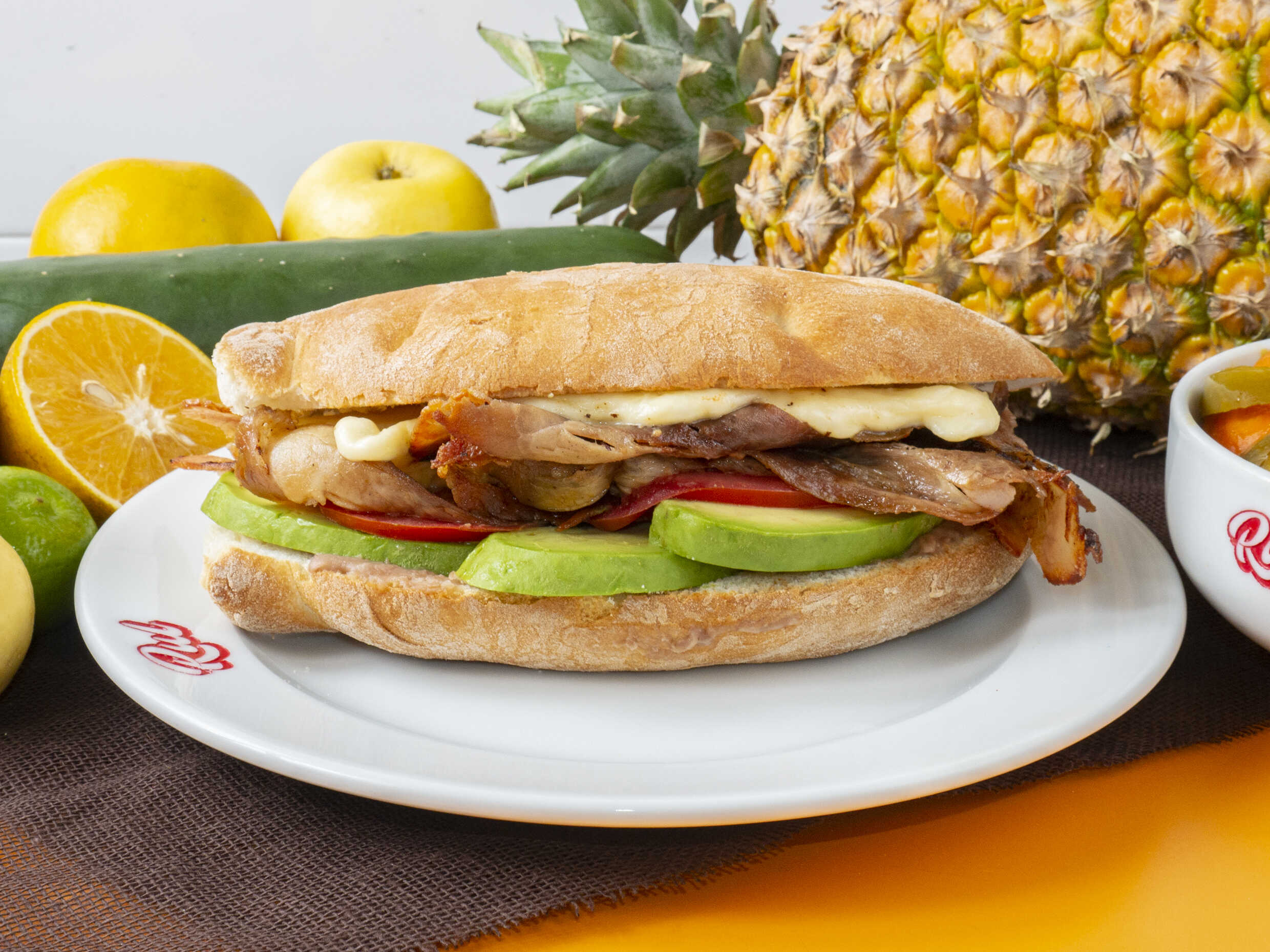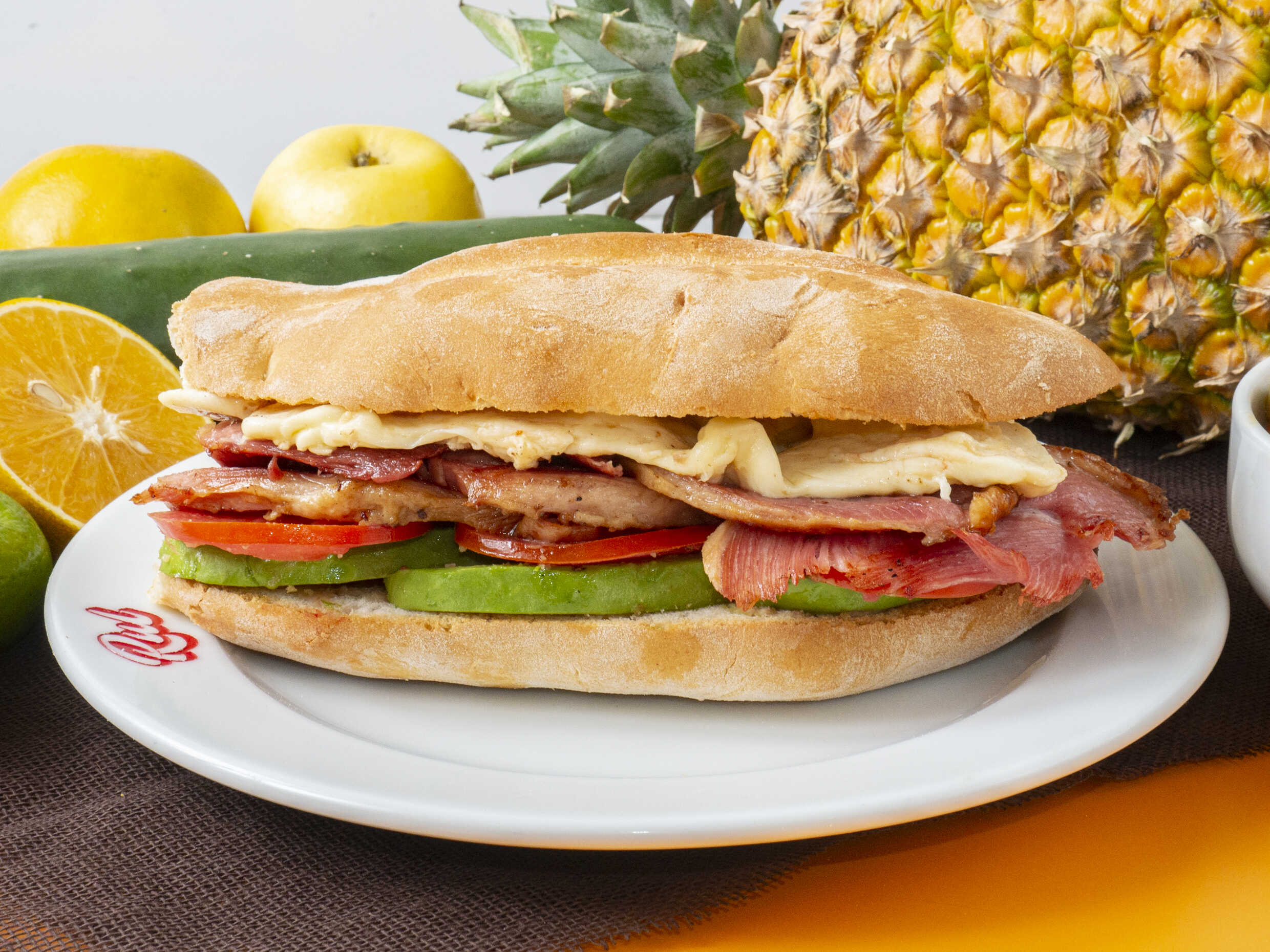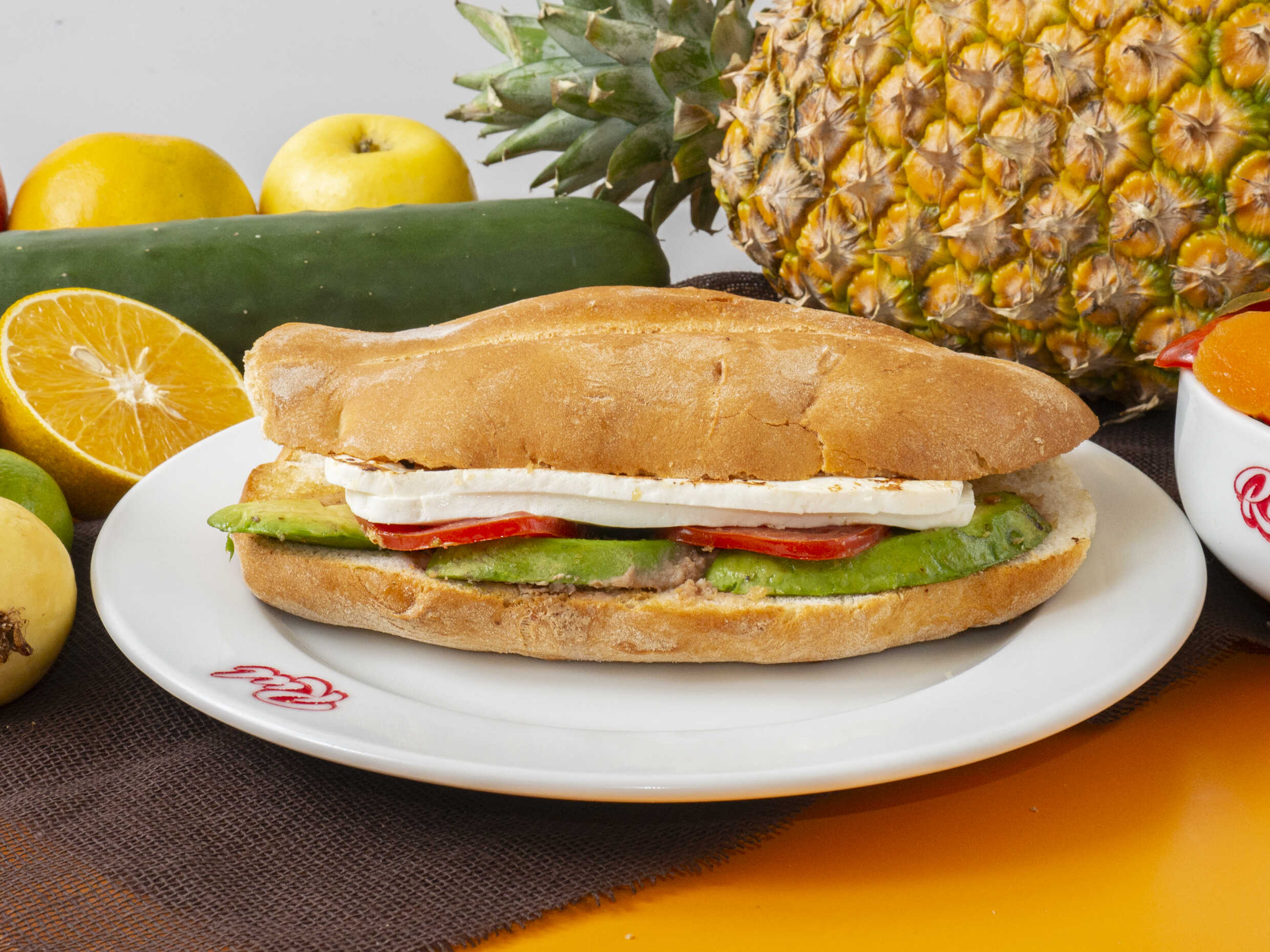 Deliciosa torta de jamón con quesillo, queso amarillo y piña asada, servida en pan crujiente con frijoles refritos, jitomate, aguacate y mayonesa.
