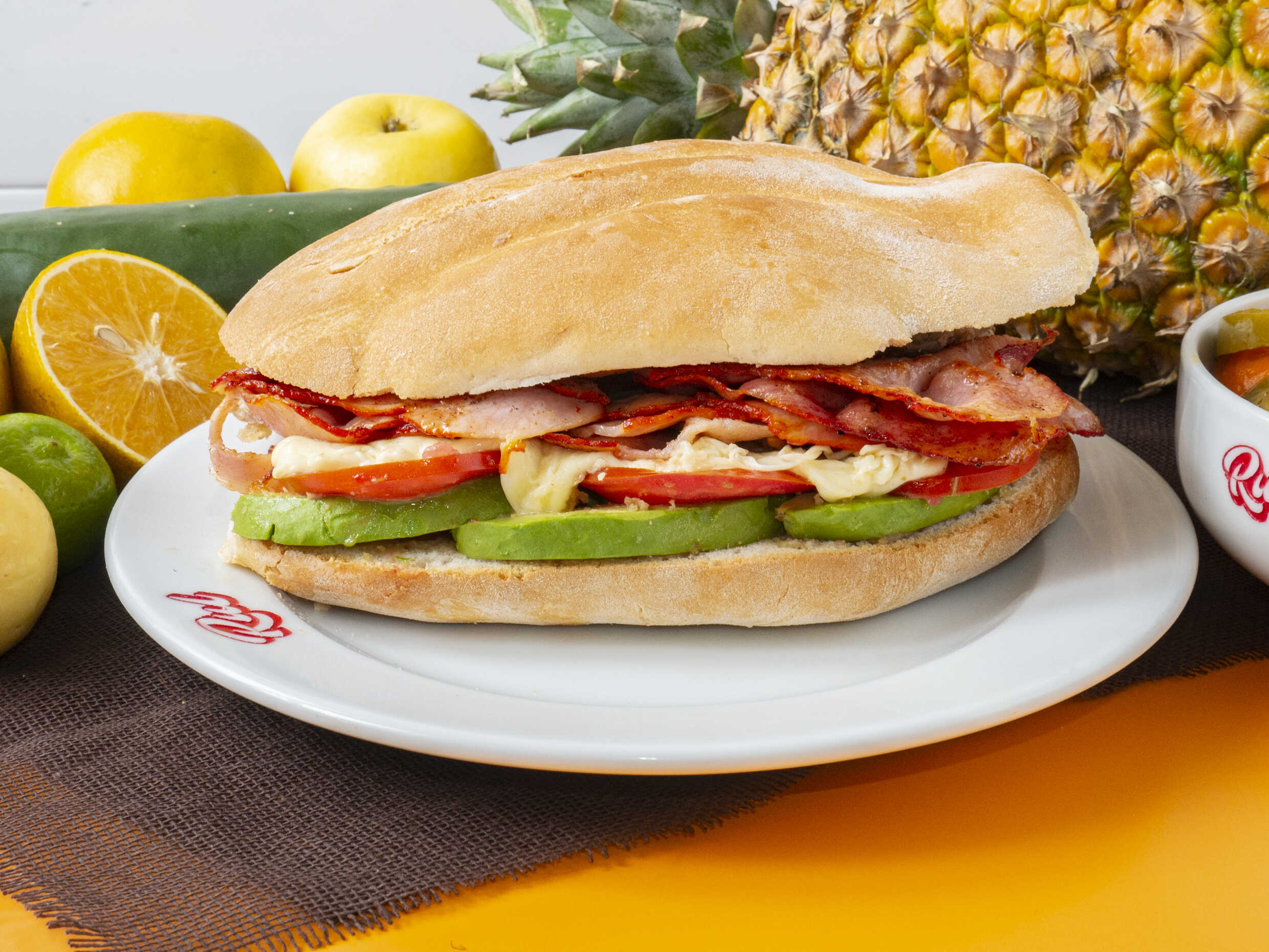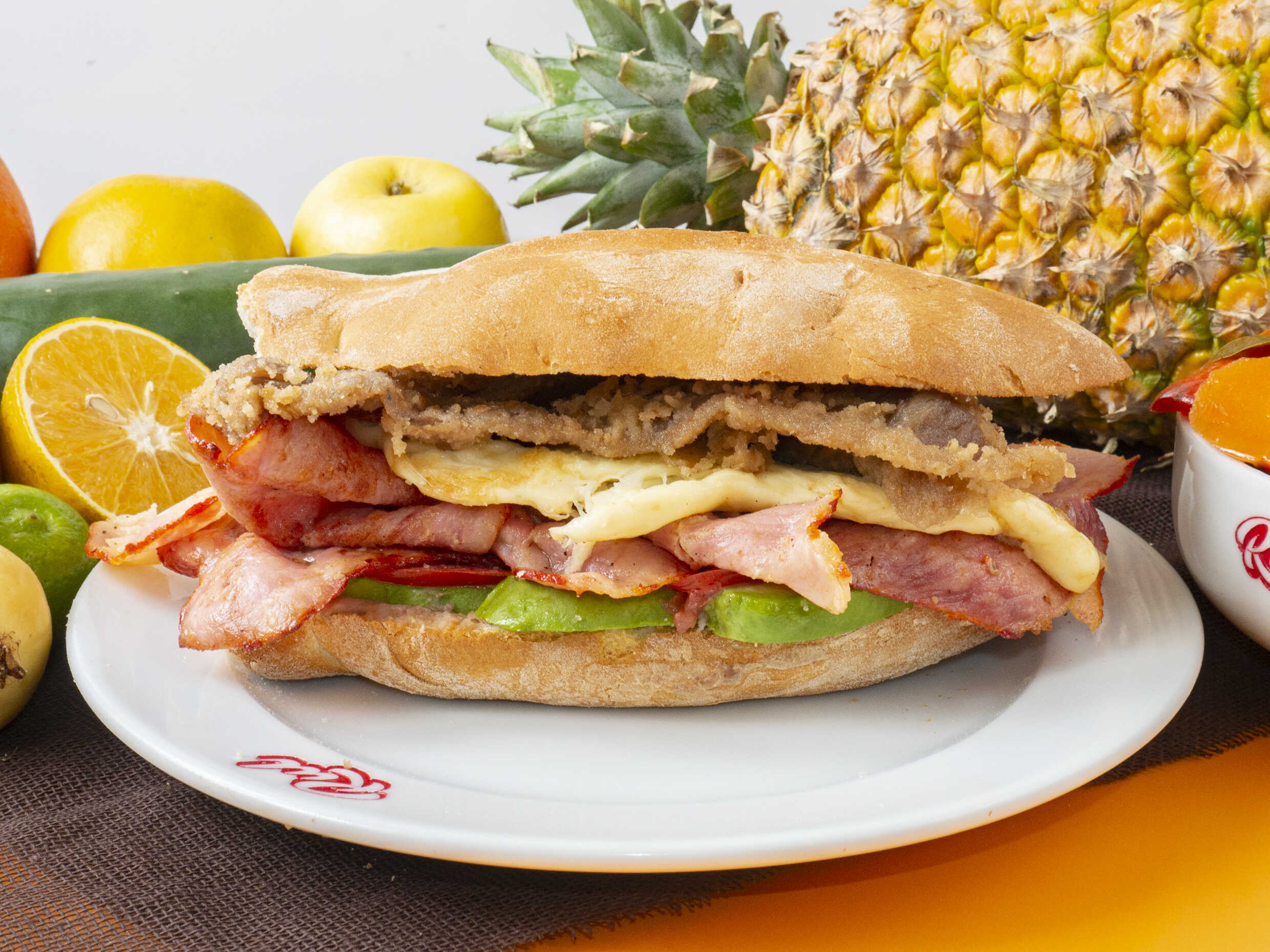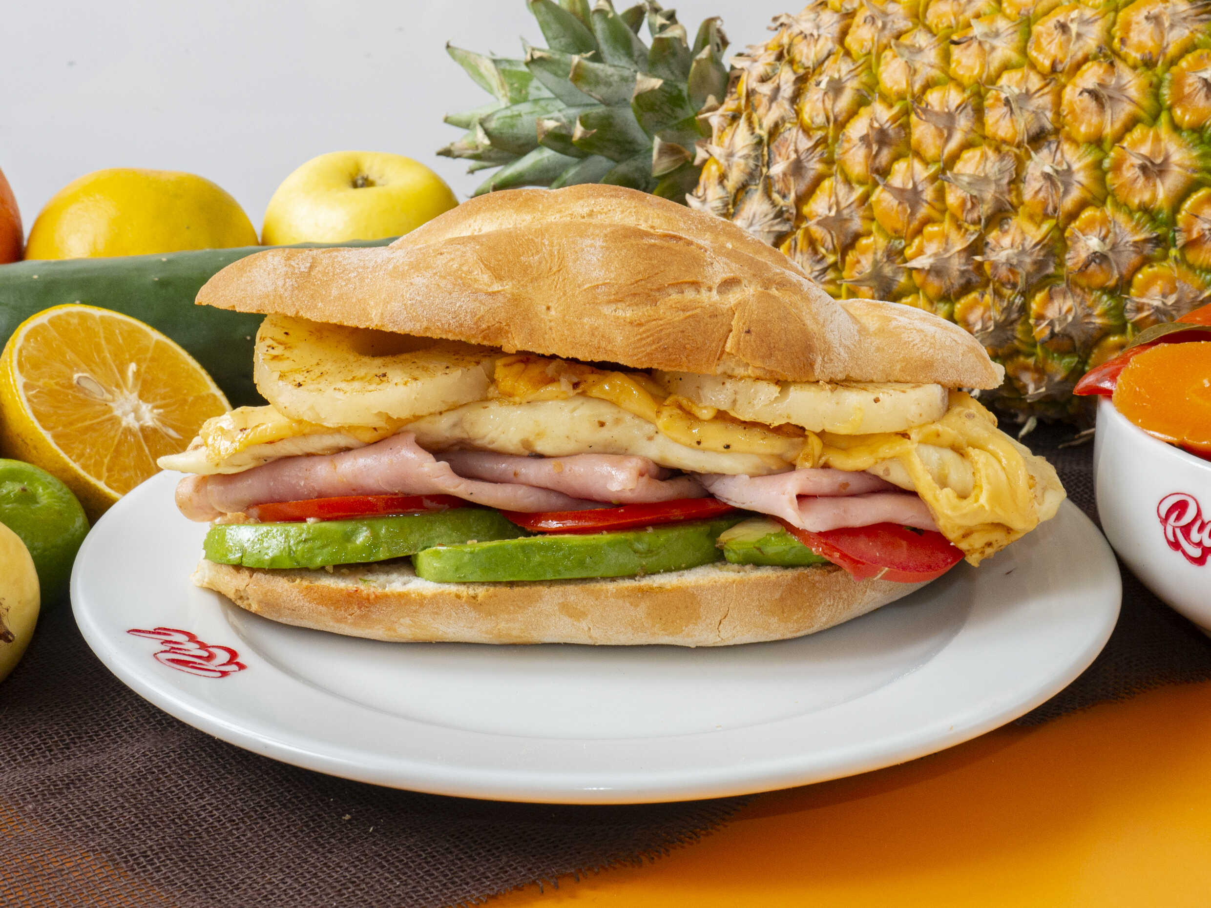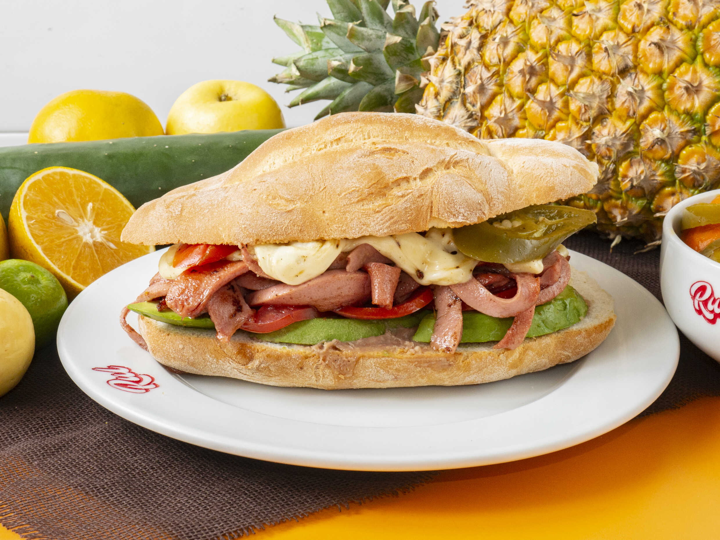 Deliciosa torta de jamón con quesillo, queso amarillo y piña asada, servida en pan crujiente con frijoles refritos, jitomate, aguacate y mayonesa.