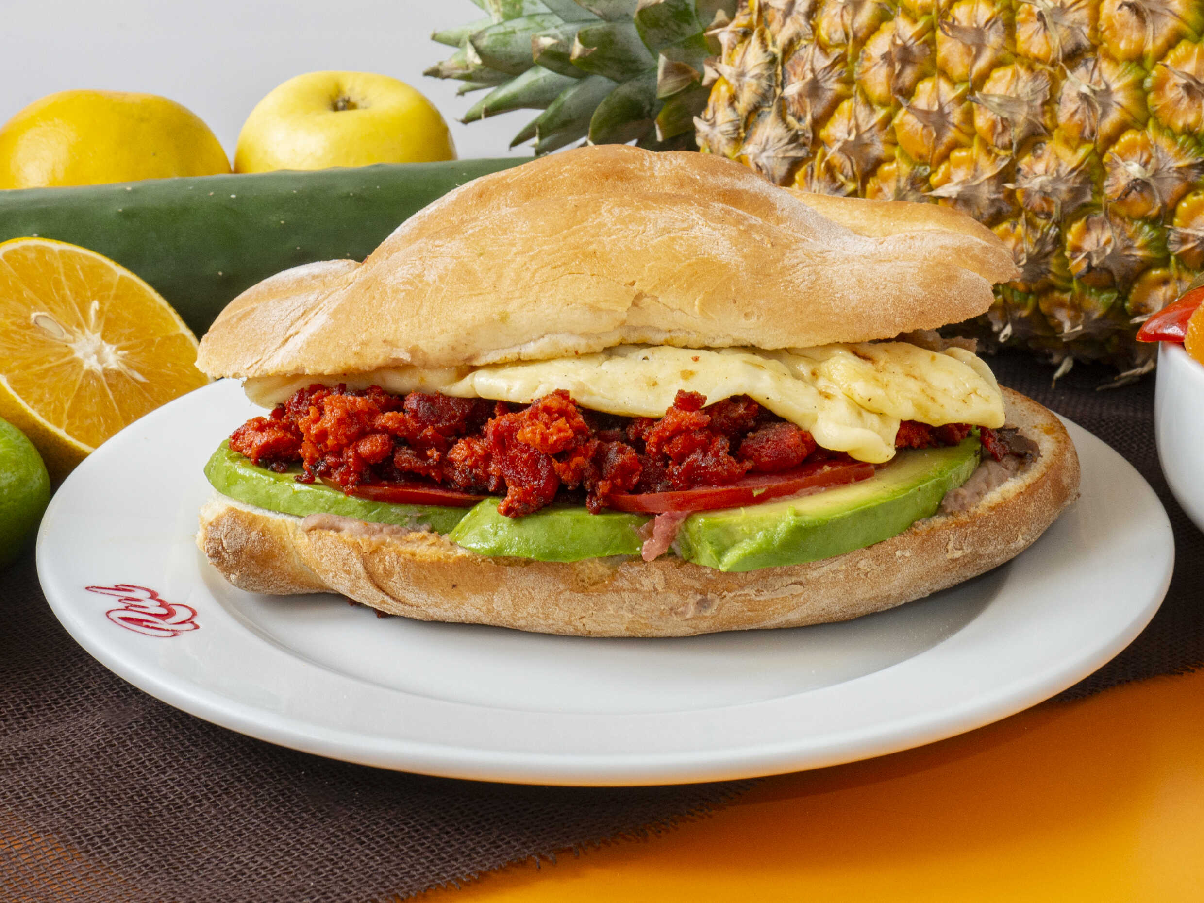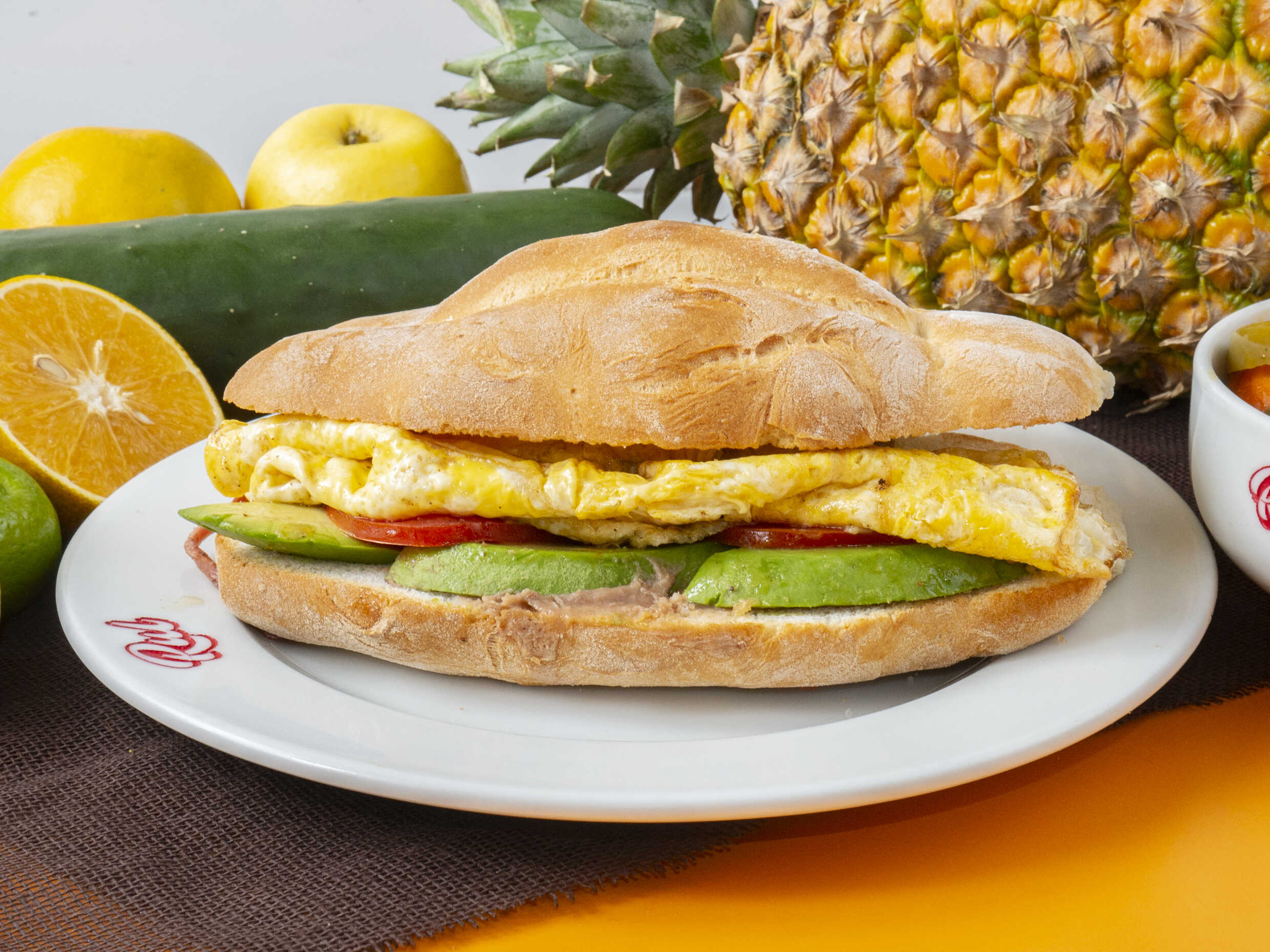 Deliciosa torta rellena de huevo recién preparado, servida en pan suave con frijoles refritos, jitomate, aguacate y mayonesa.