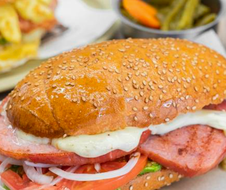 Torta de jamón de pierna de cerdo, queso blanco, aguacate, jitomate, lechuga y mayonesa en pan telera rustica.