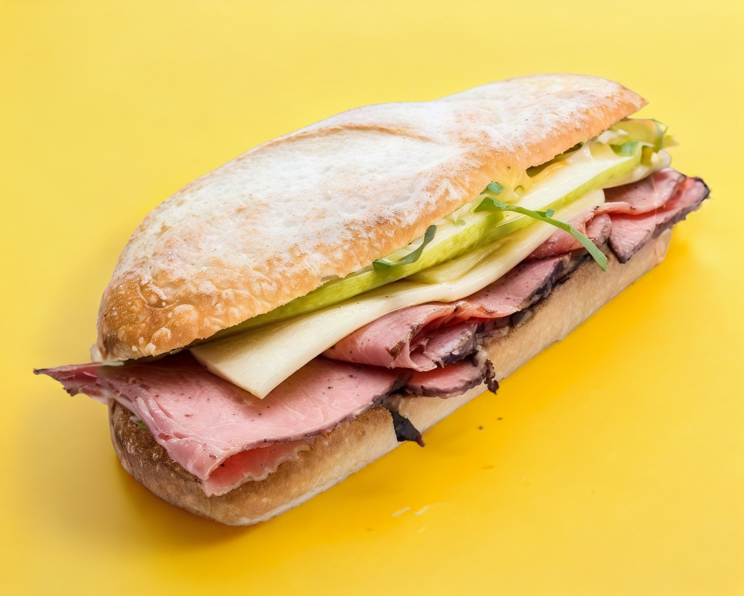 20cm Pechuga ahumada, queso probolone, manzana, arugula y mayonesa de ajoen pan chapata.