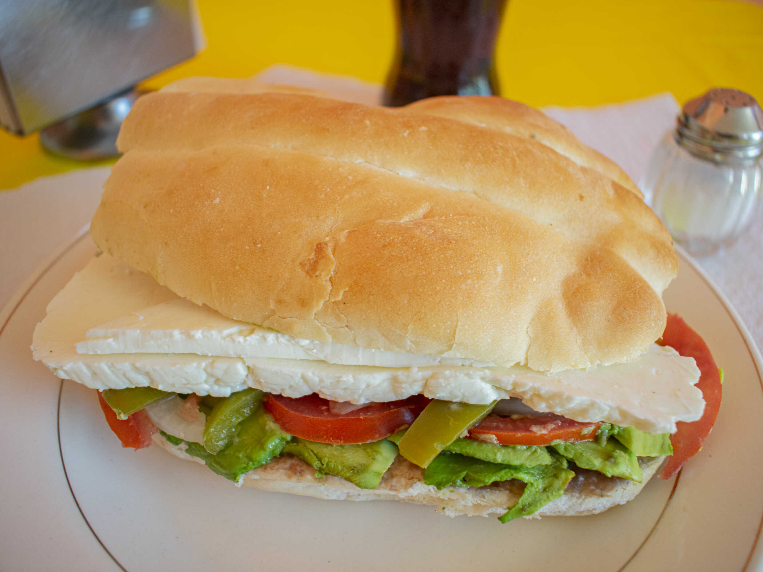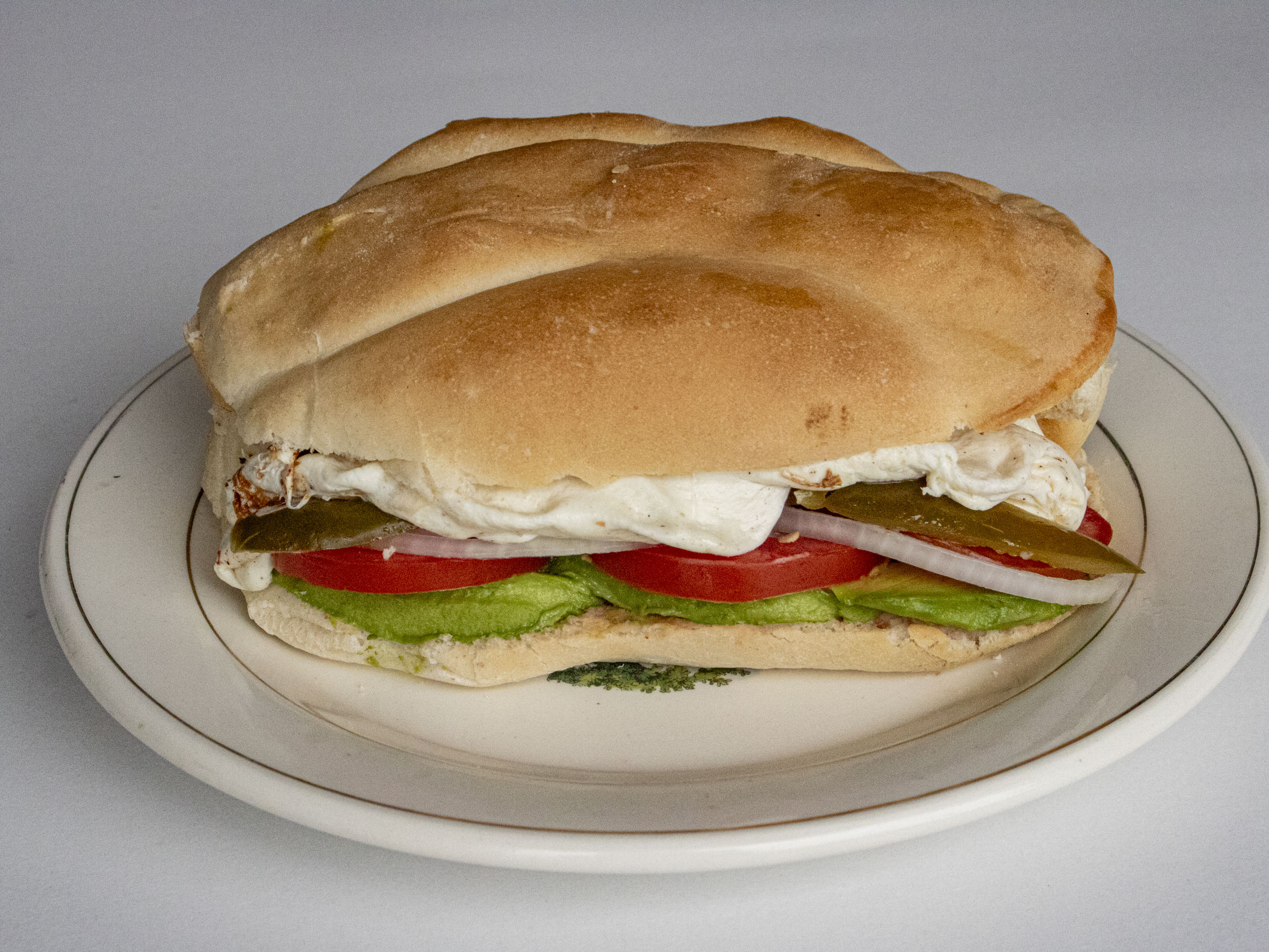 Torta preparada con frijoles, cebolla, jitomate, aguacate, crema o mayonesa, queso oaxaca, queso amarillo, queso panela y picante a elegir.