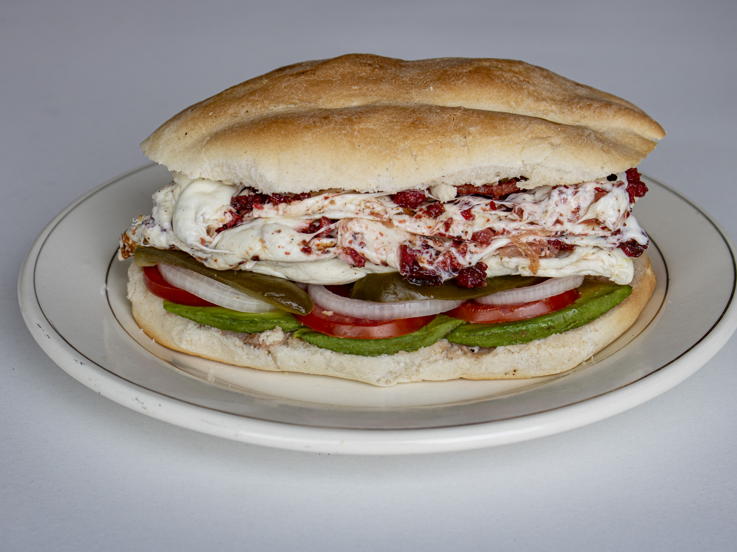 Torta preparada con frijoles, cebolla, jitomate, aguacate, crema o mayonesa, chorizo, huevo, quesillo y picante a elegir.