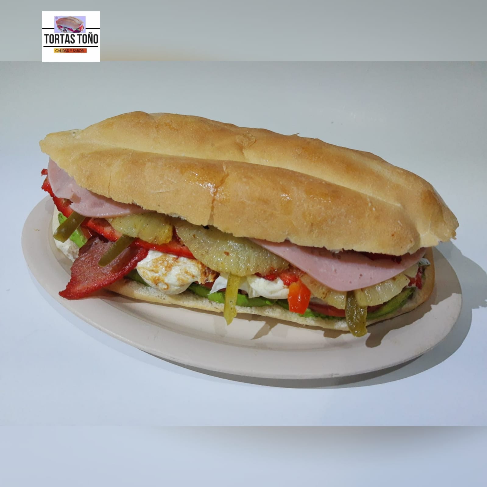 Preparada con frijoles, cebolla, jitomate, aguacate, crema o mayonesa, pierna, quesillo, piña, jamón de pavo y picante a elegir.
