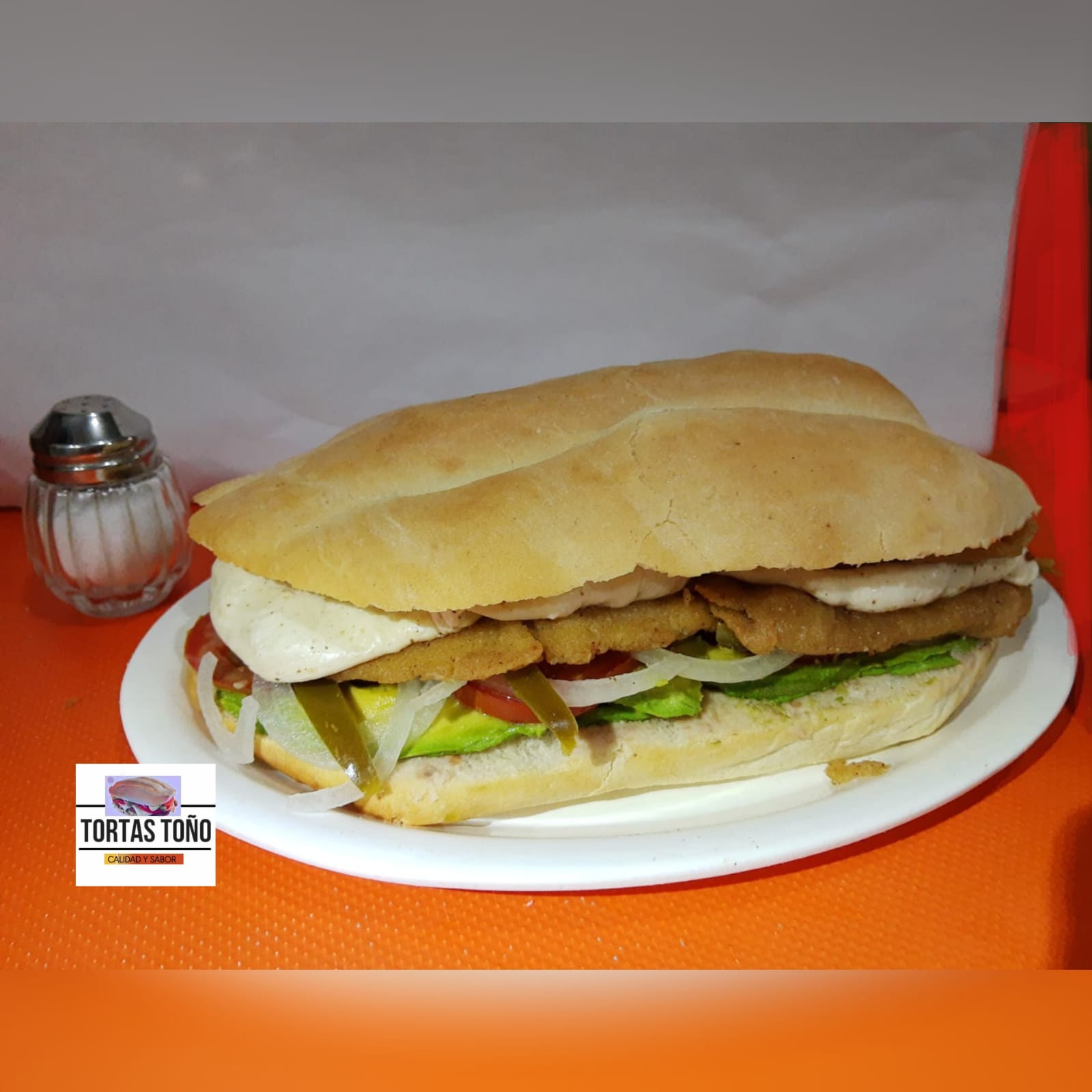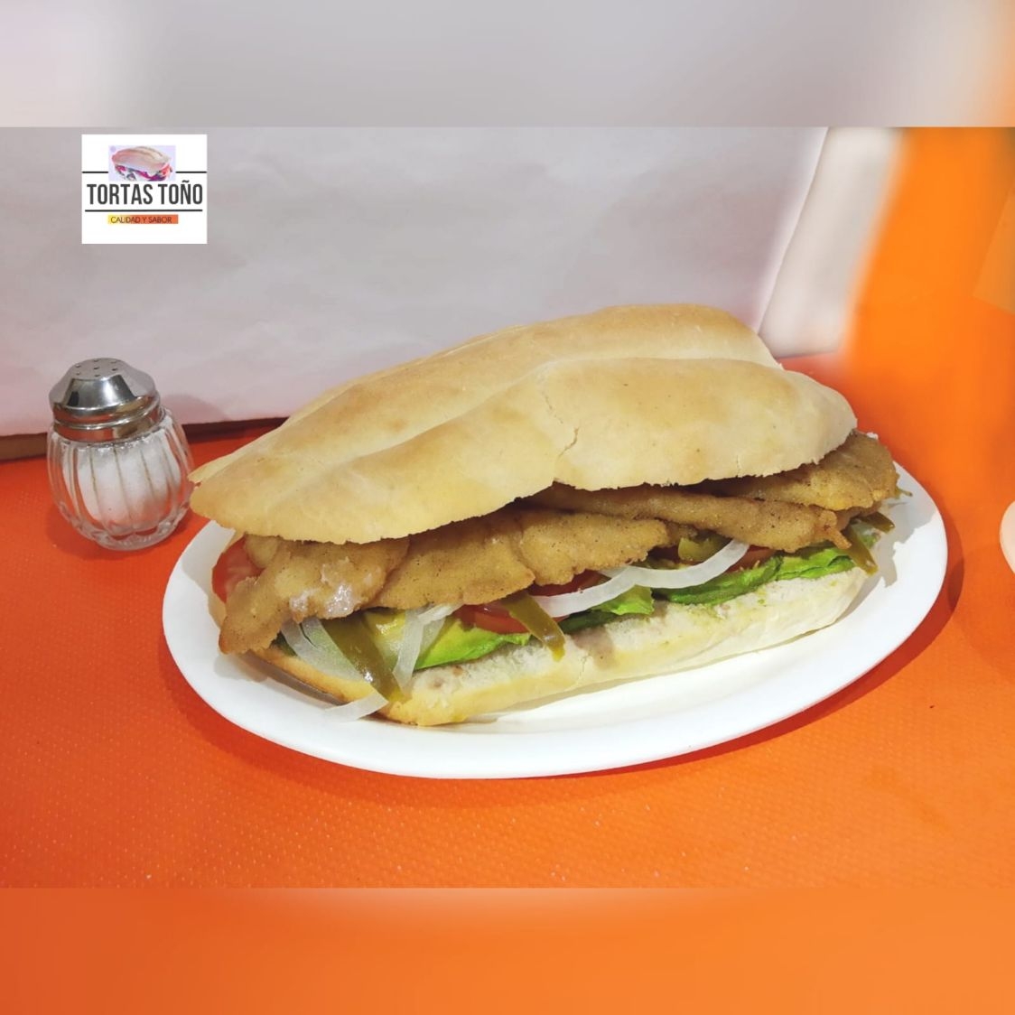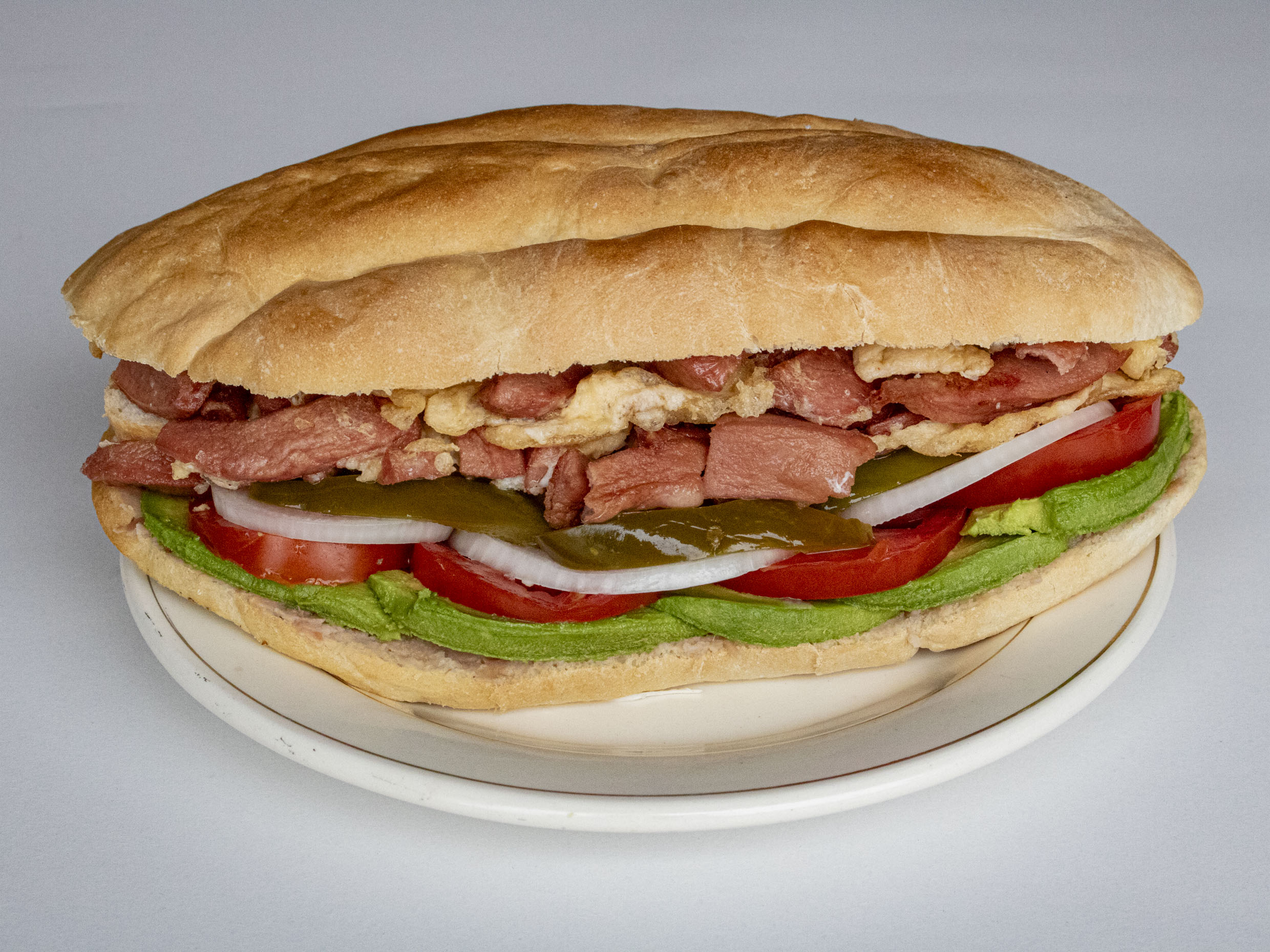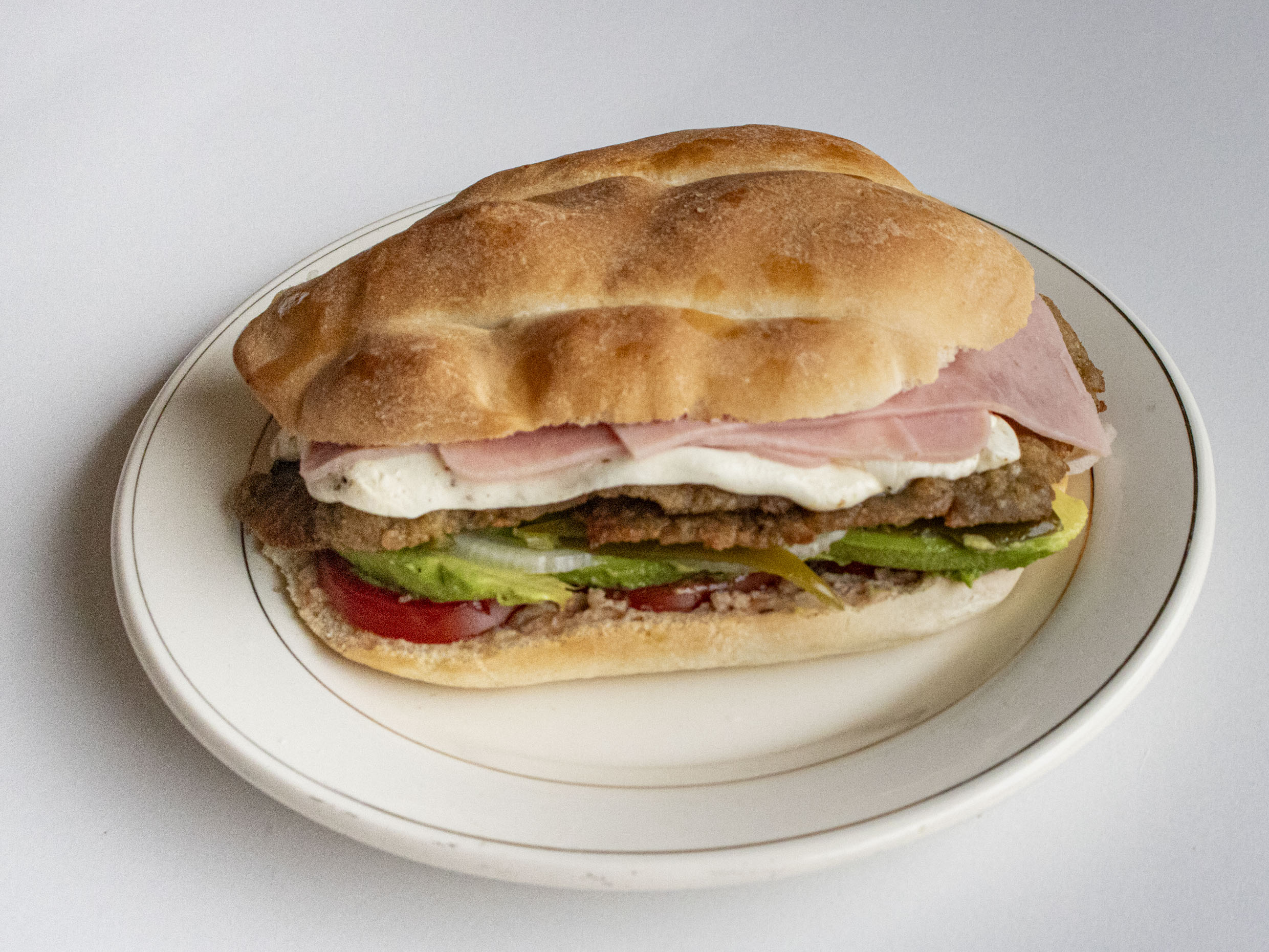 Torta preparada con frijoles, cebolla, jitomate, aguacate, crema o mayonesa, milanesa de res, jamón de pavo, quesillo y picante a elegir.