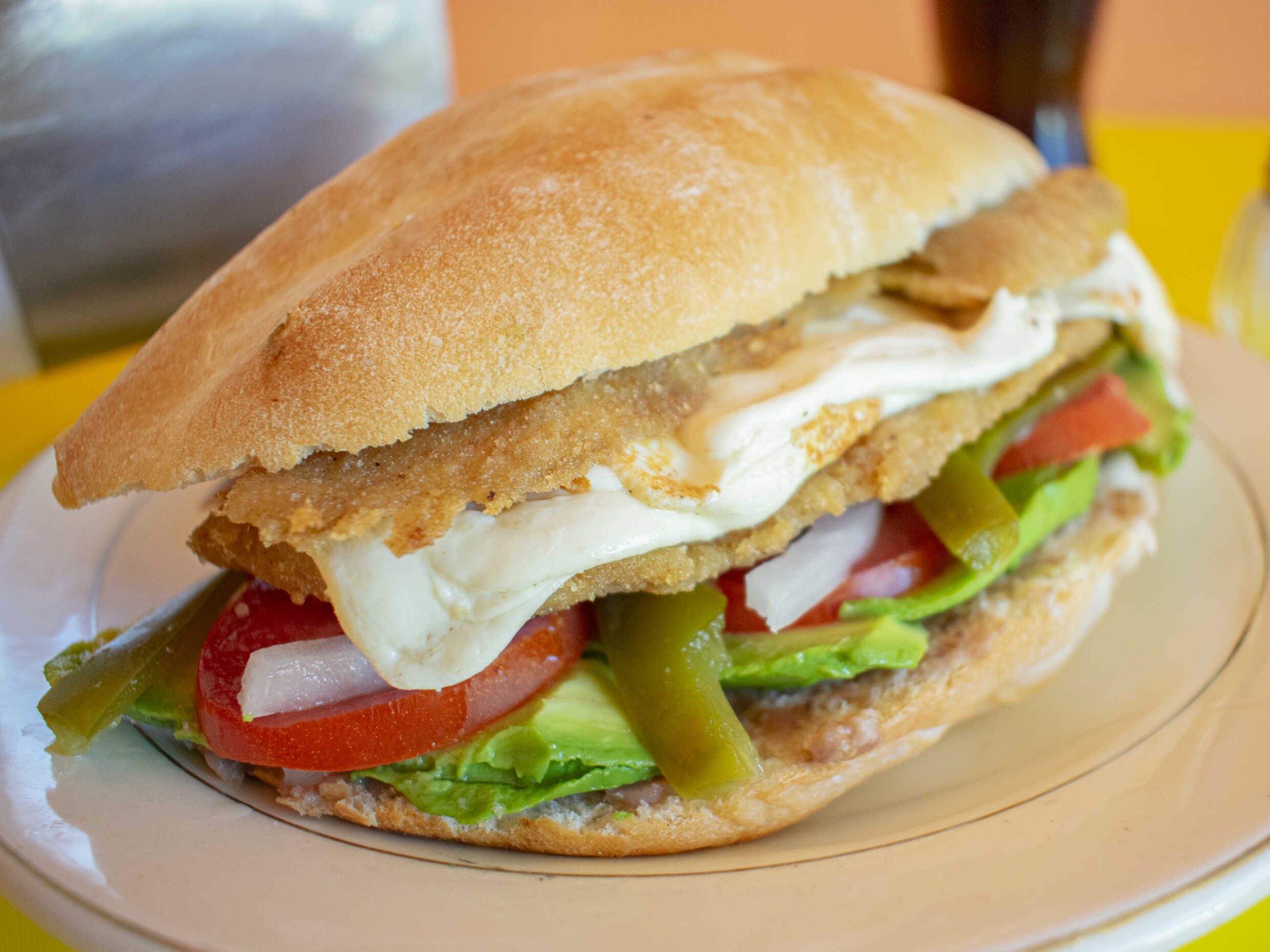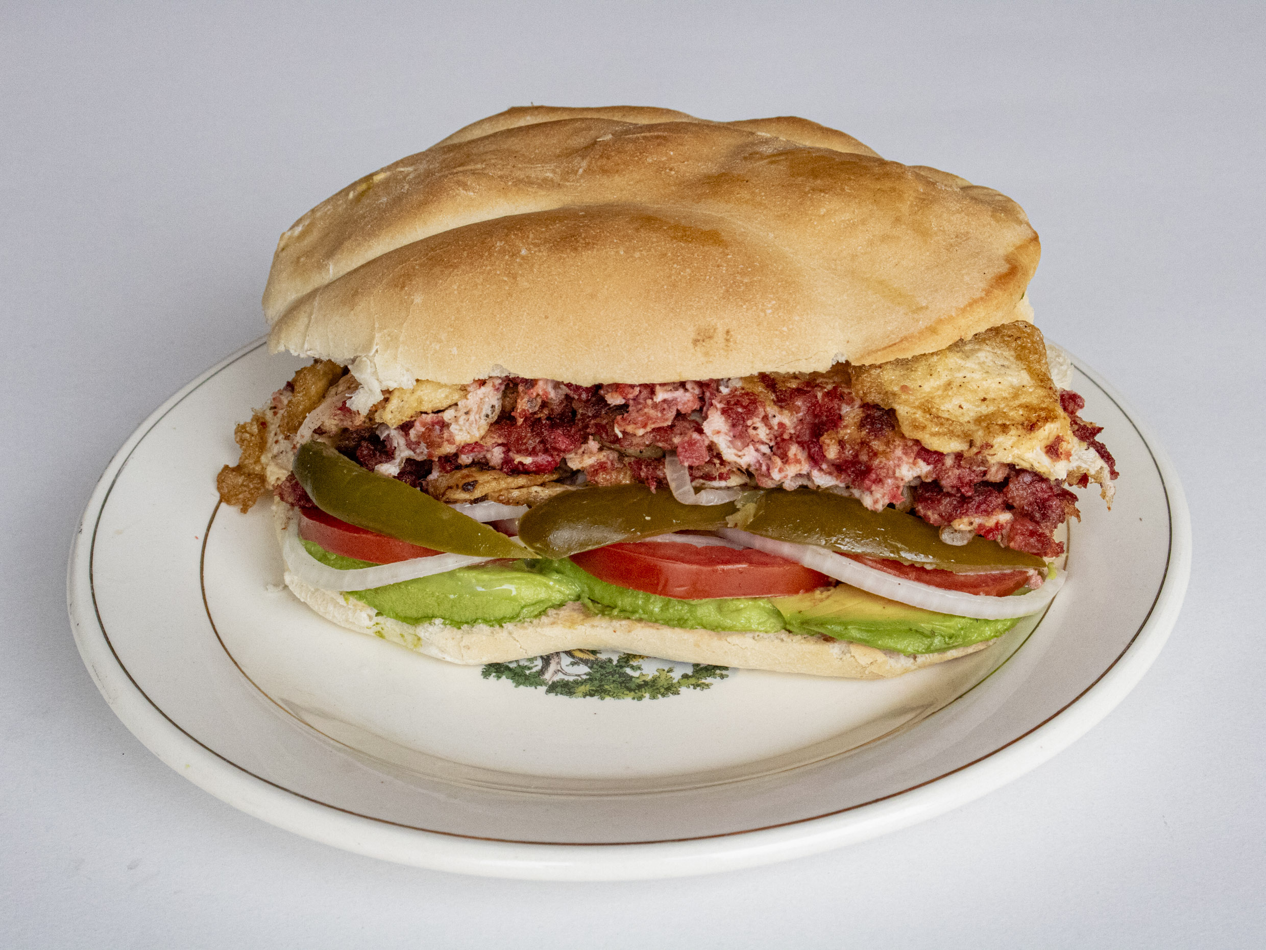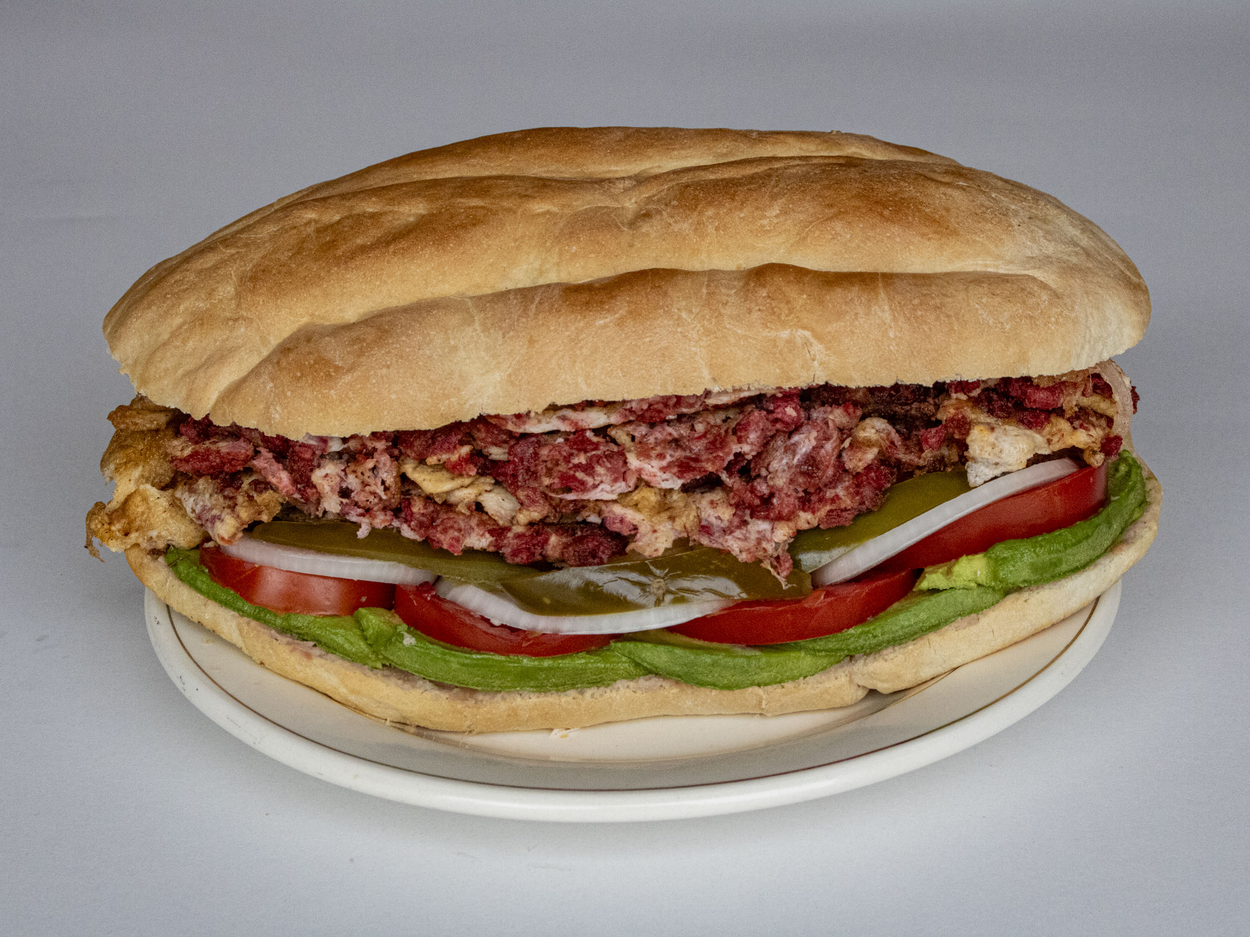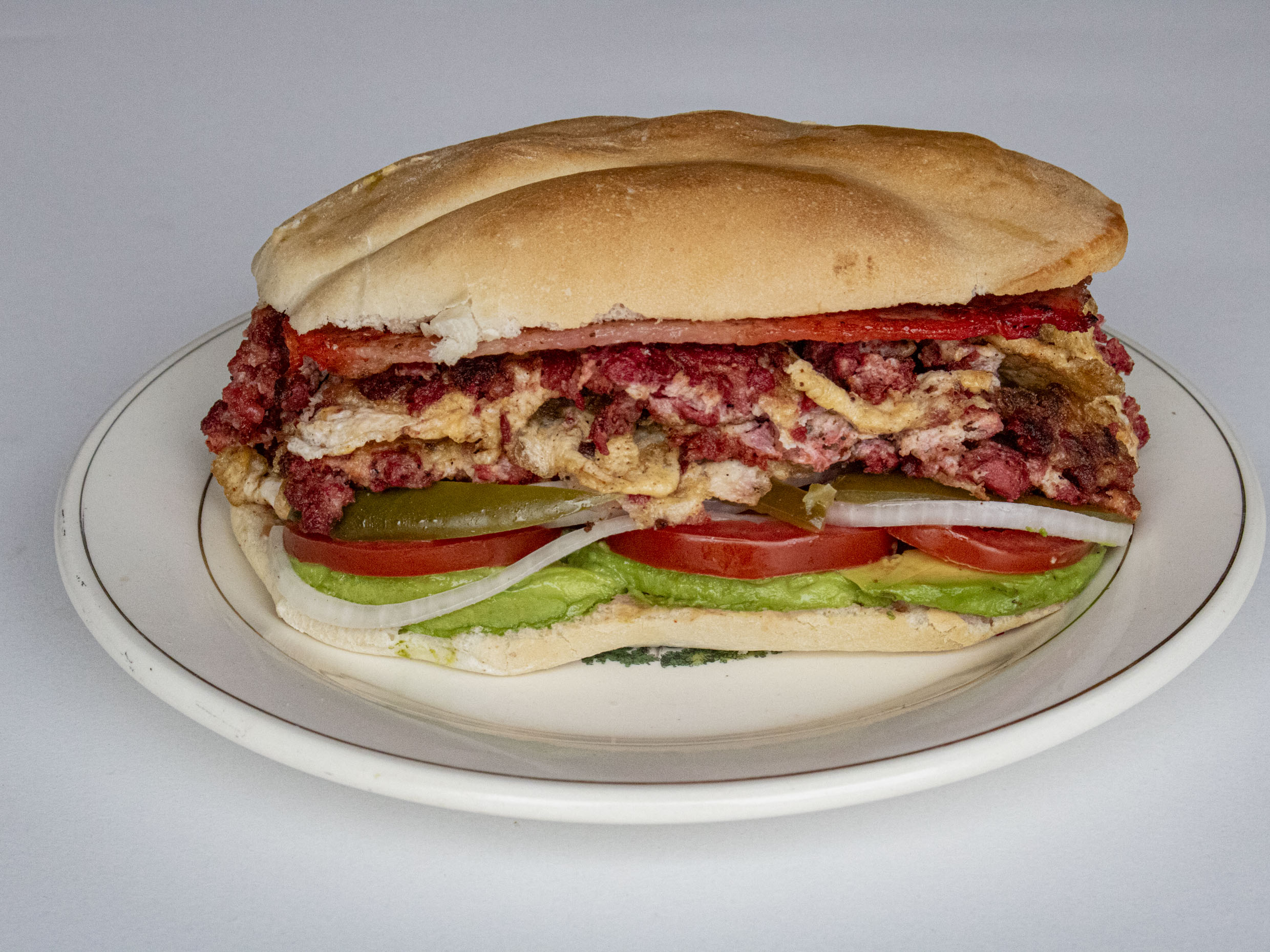 Torta preparada con frijoles, cebolla, jitomate, aguacate, crema o mayonesa, milanesa de res, jamón de pavo, quesillo y picante a elegir.