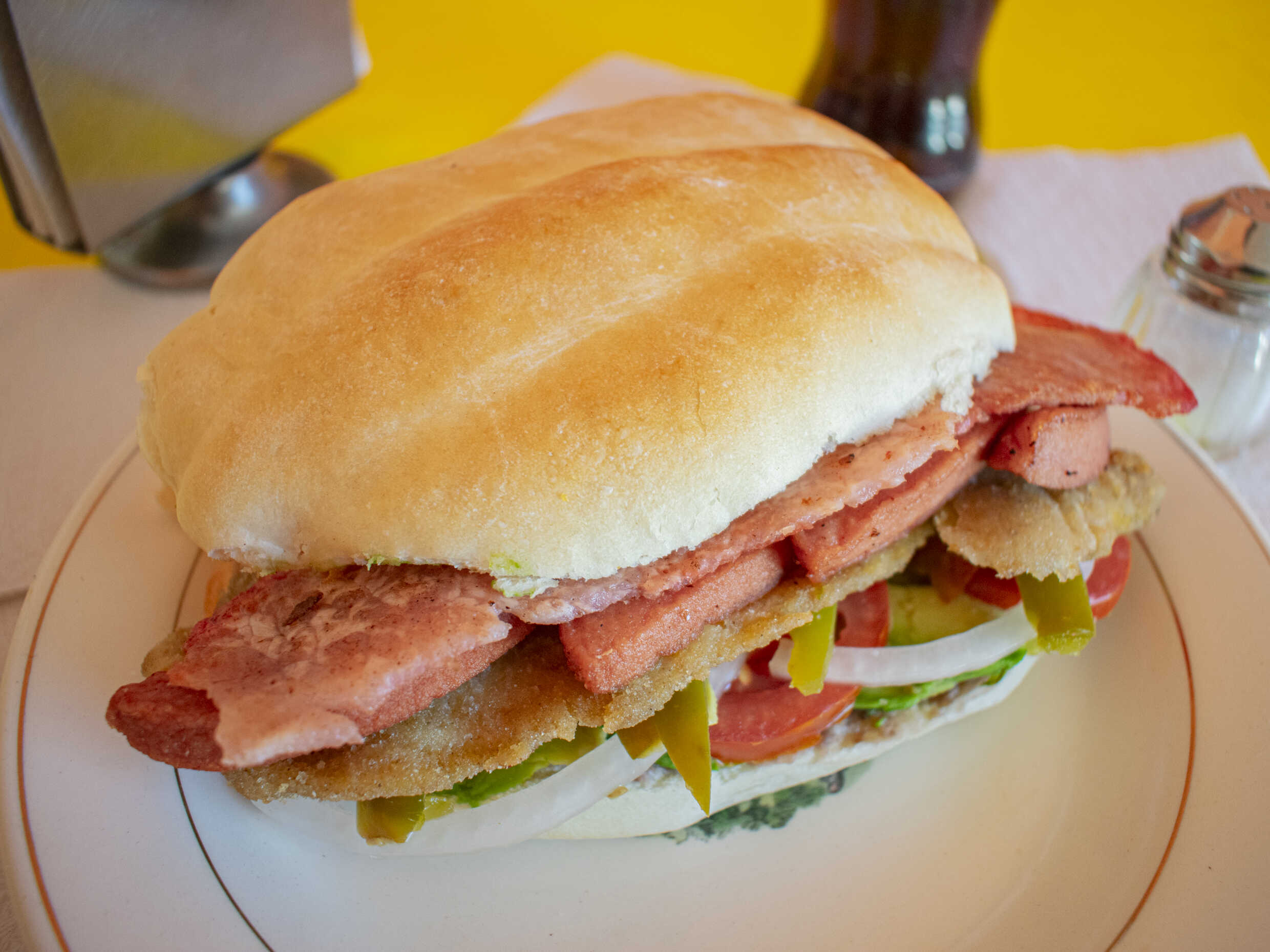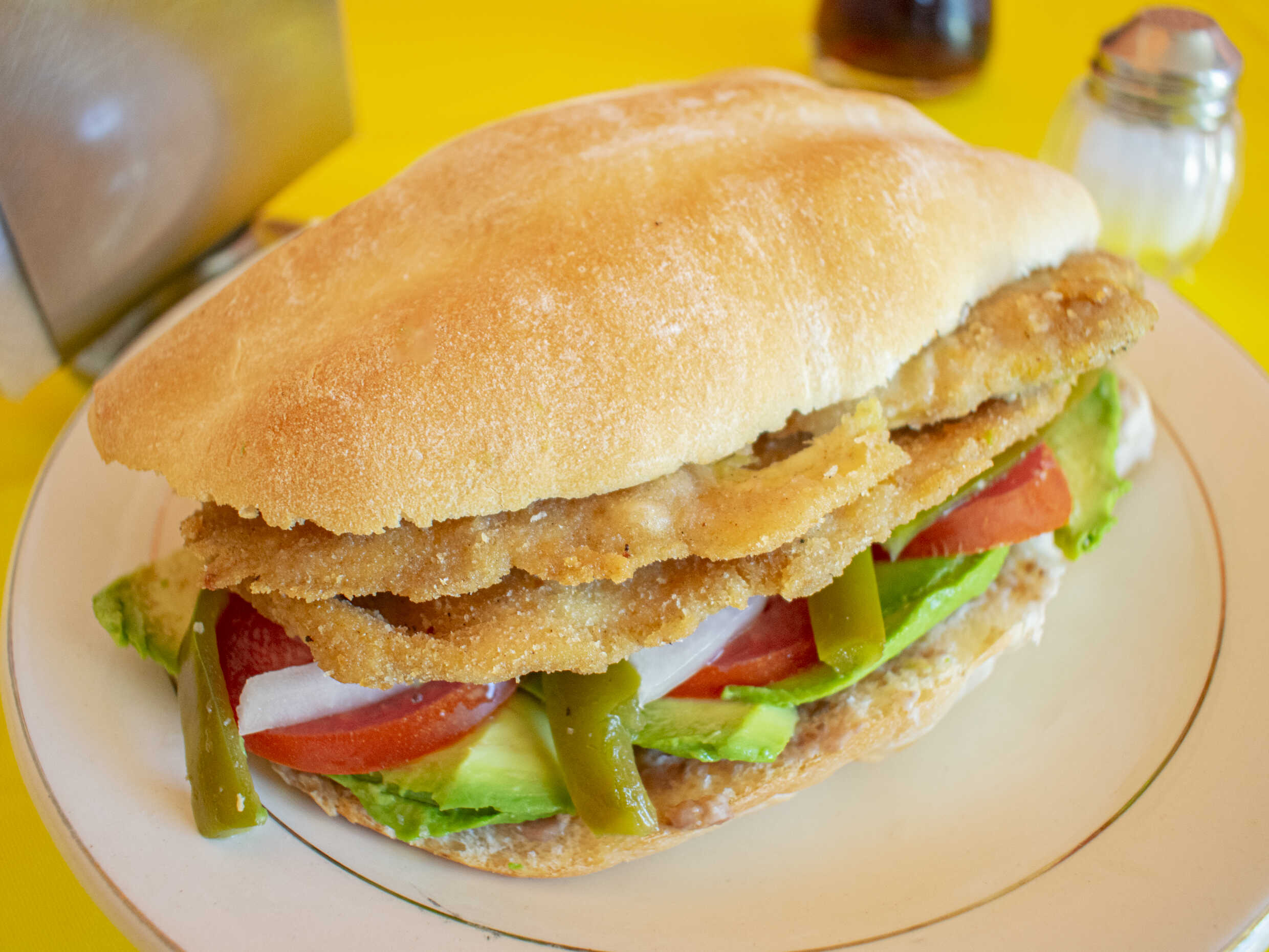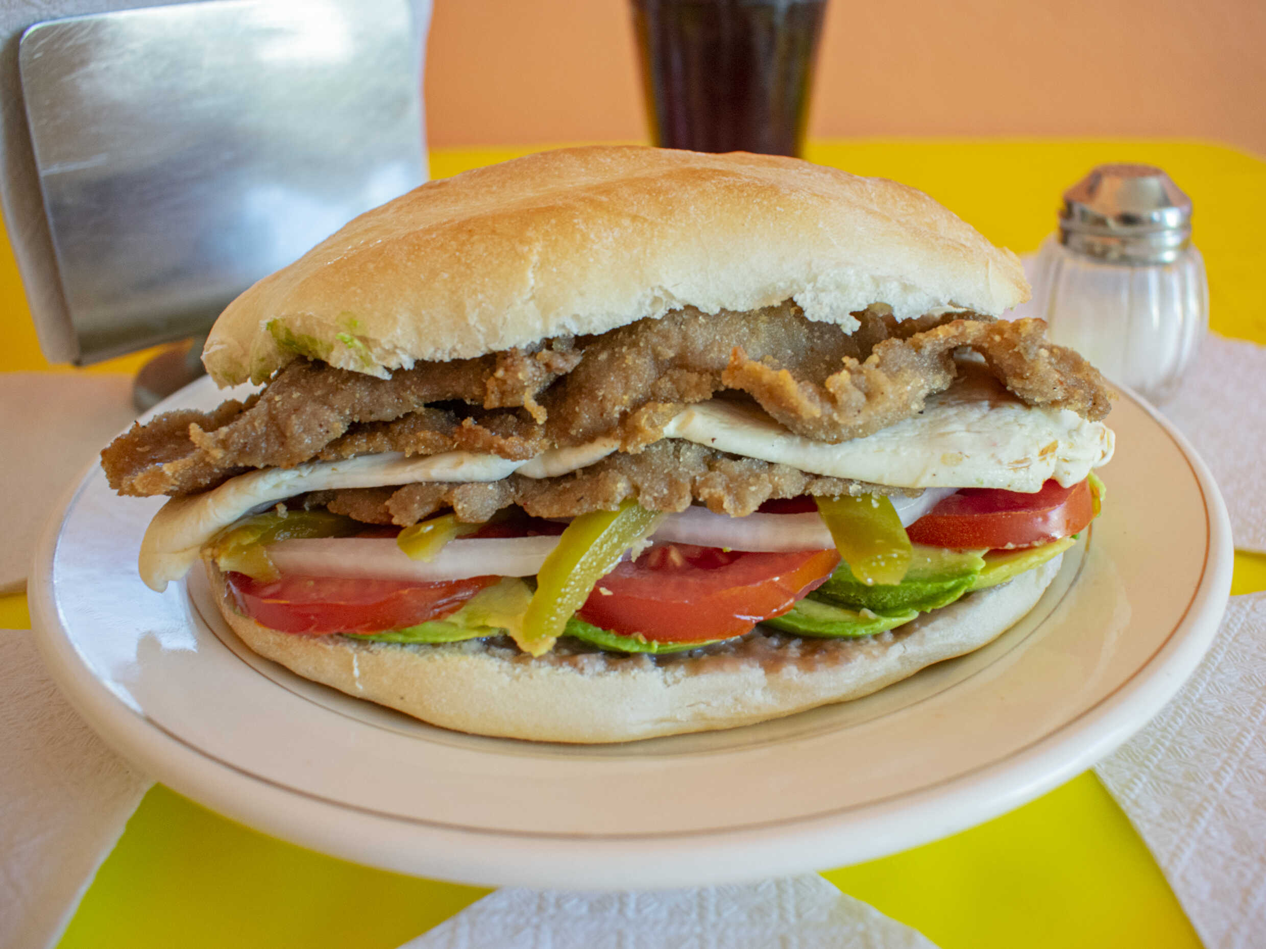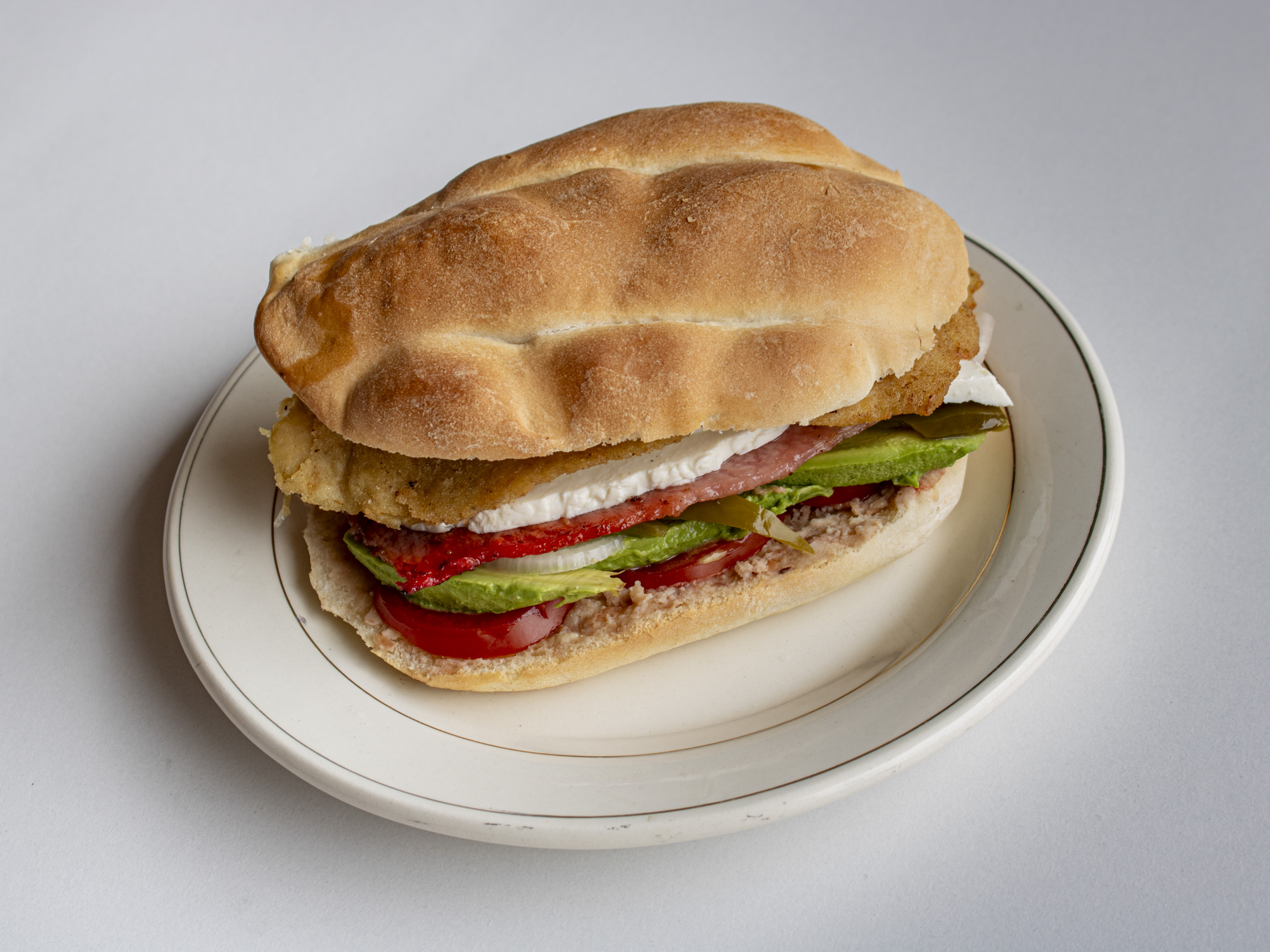Torta preparada con frijoles, cebolla, jitomate, aguacate, crema o mayonesa, milanesa de res, jamón de pavo, quesillo y picante a elegir.