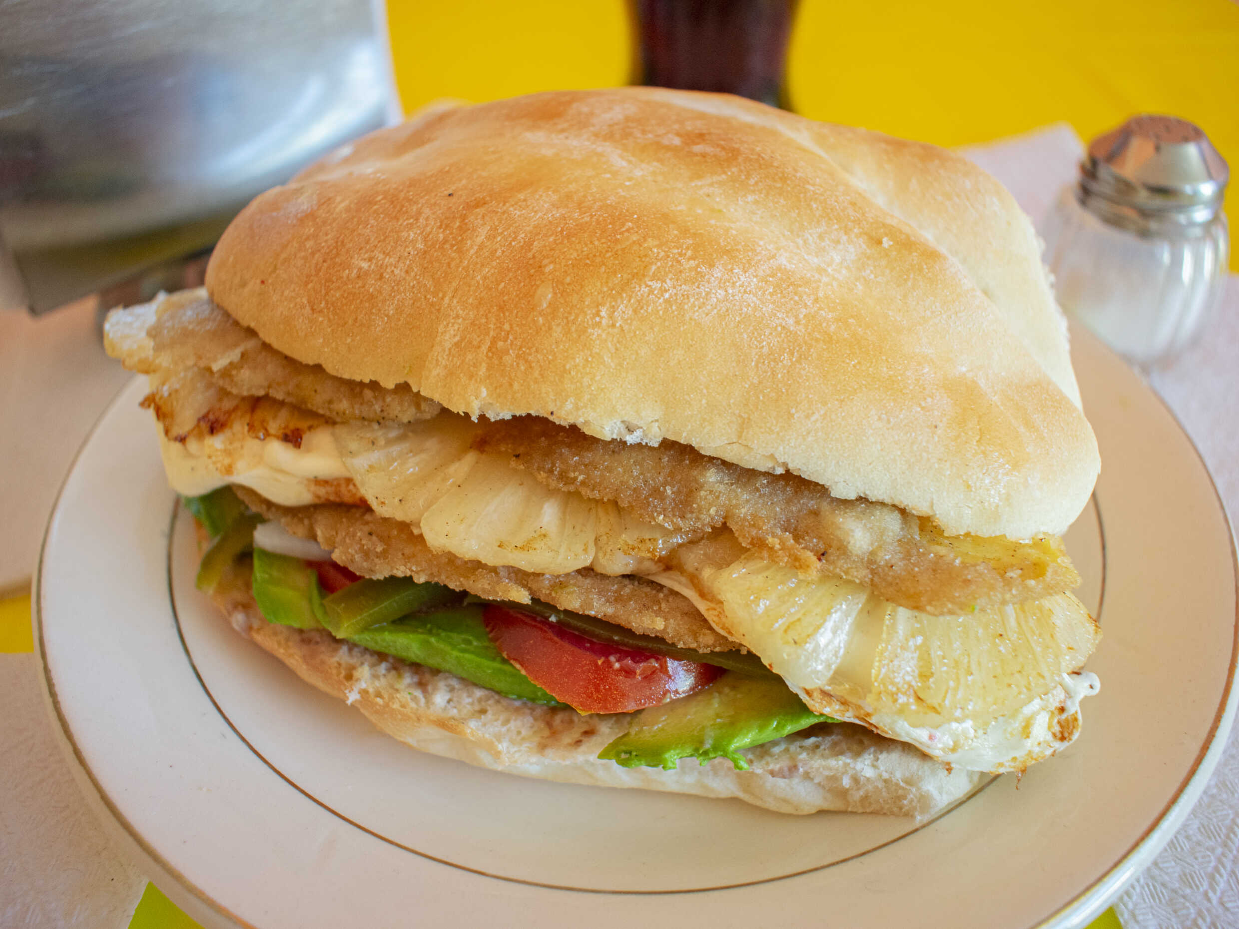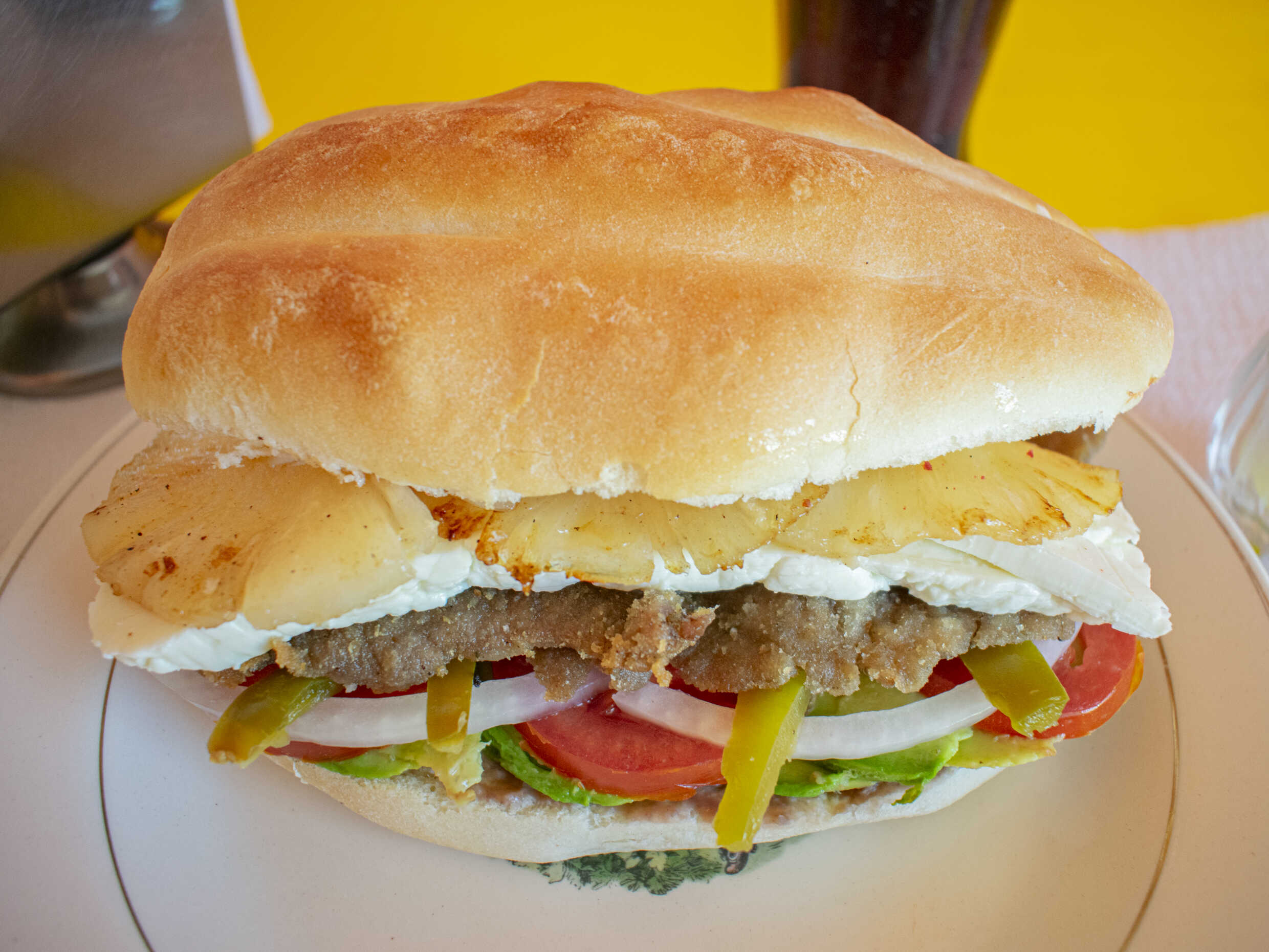 Torta preparada con frijoles, cebolla, jitomate, aguacate crema o mayonesa, milanesa de res, queso panela, piña y picante a elegir