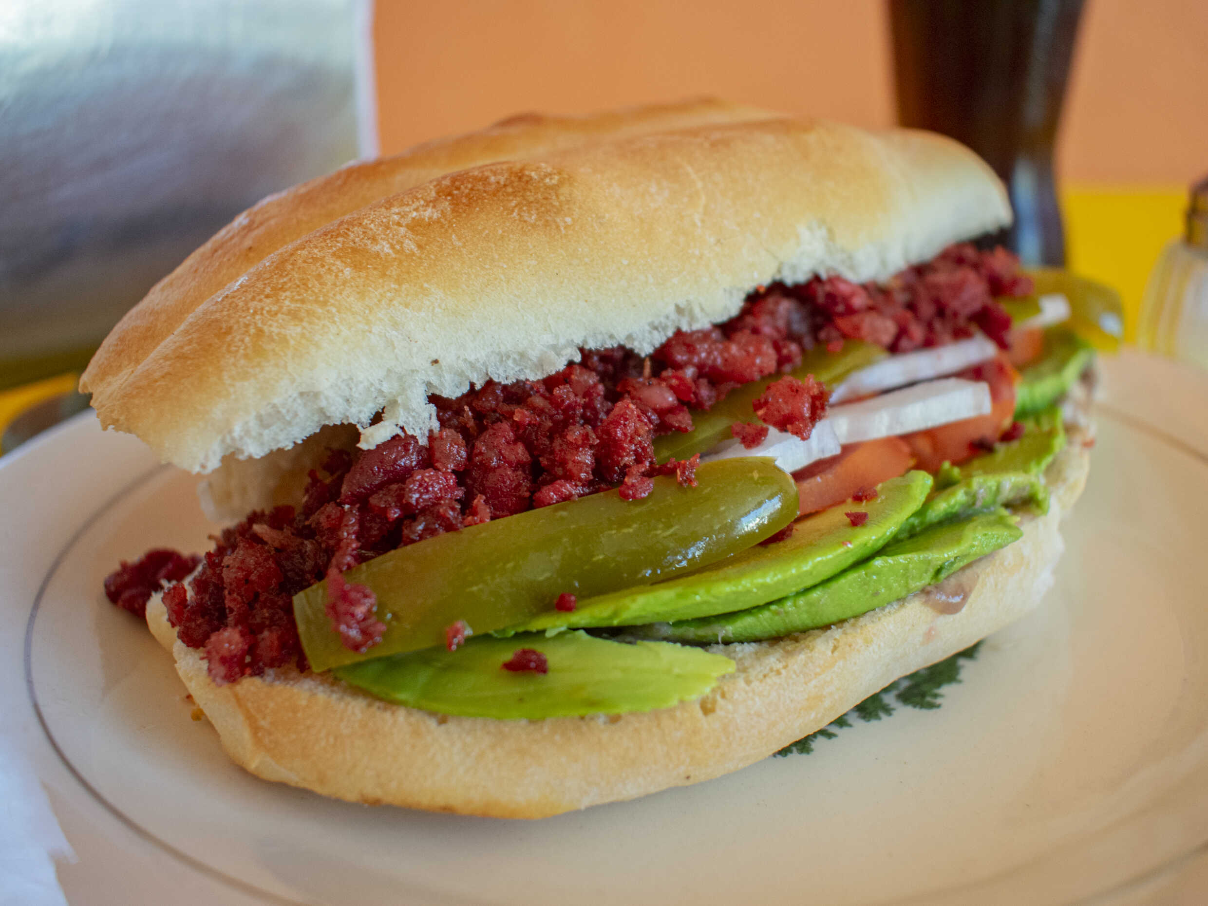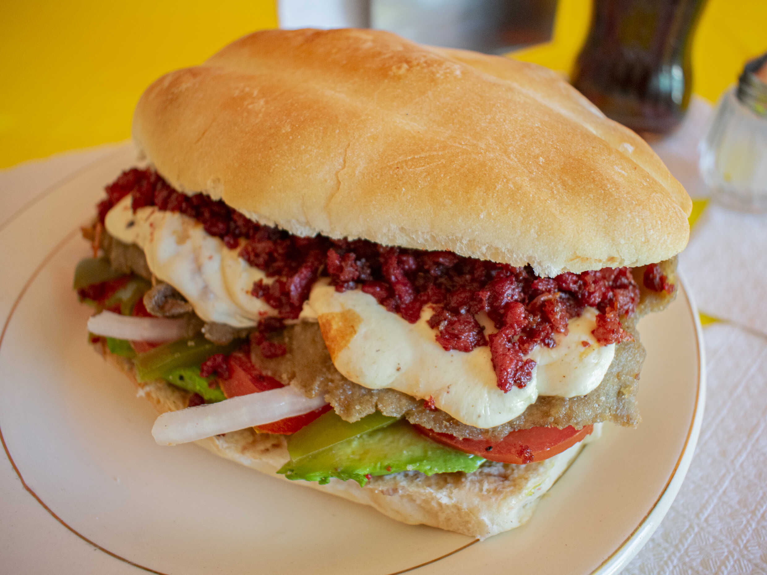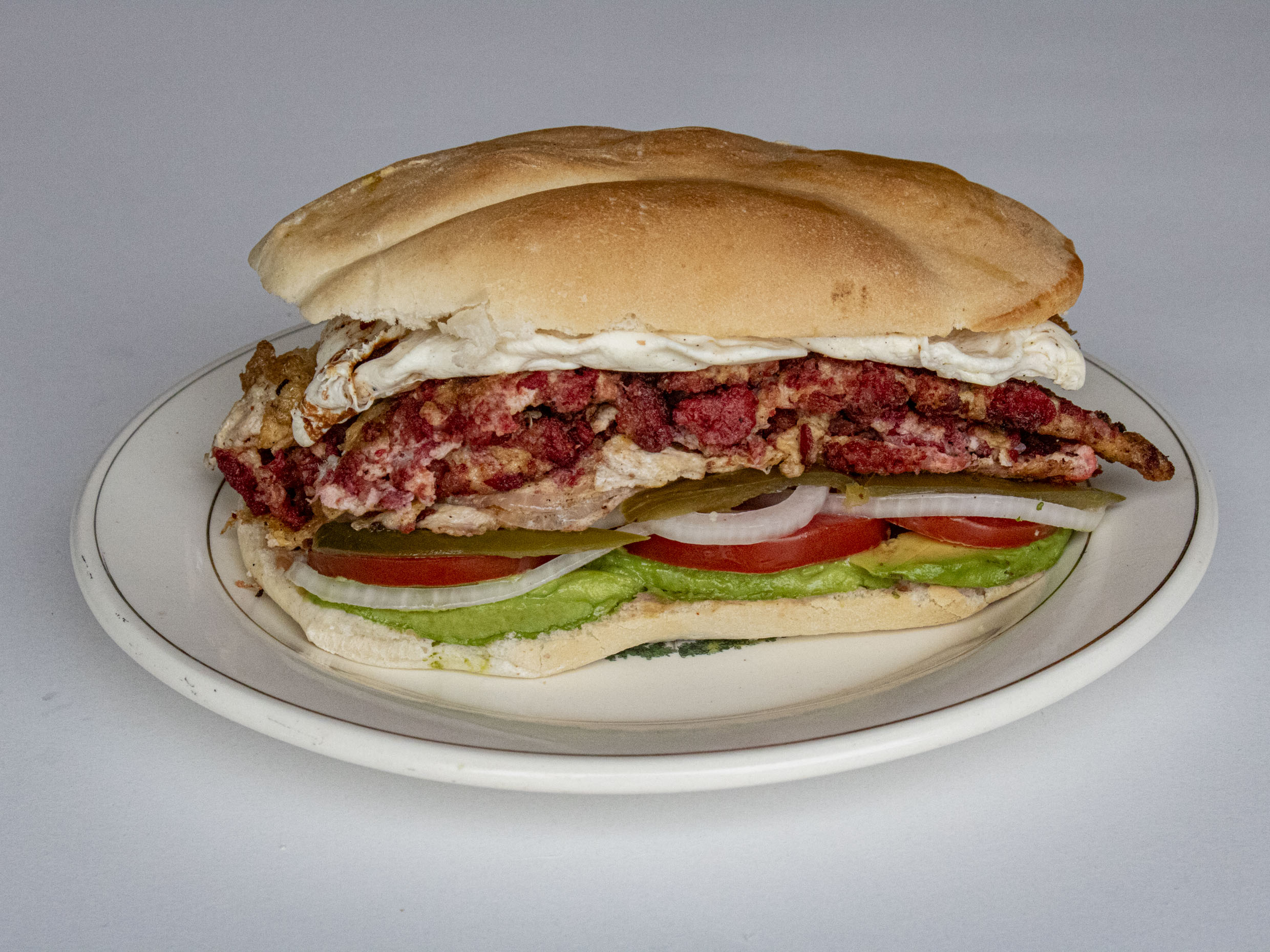 Preparada con frijoles, cebolla, jitomate, aguacate, crema o mayonesa, milanesa de res, pierna, quesillo y picante a elegir.