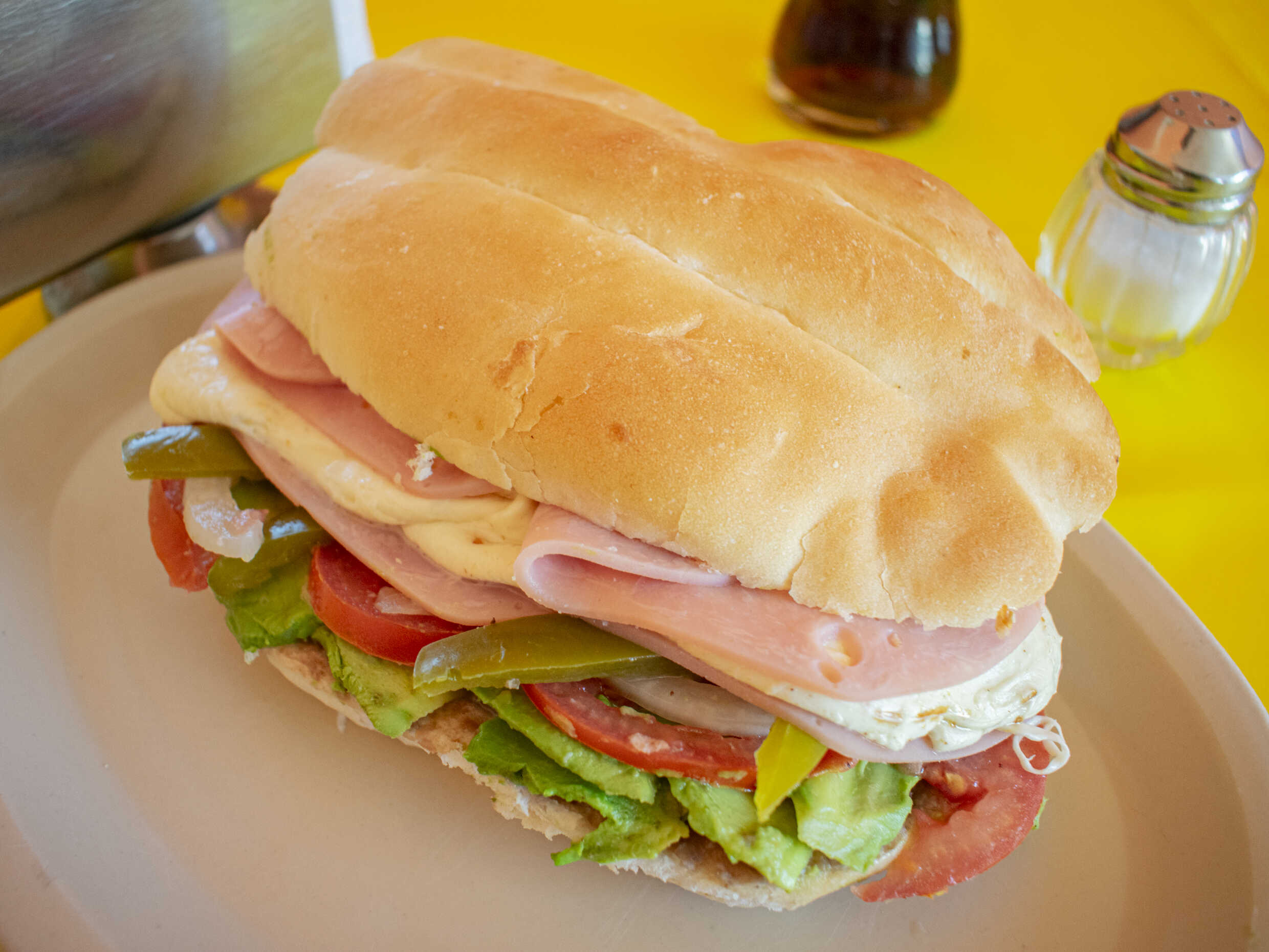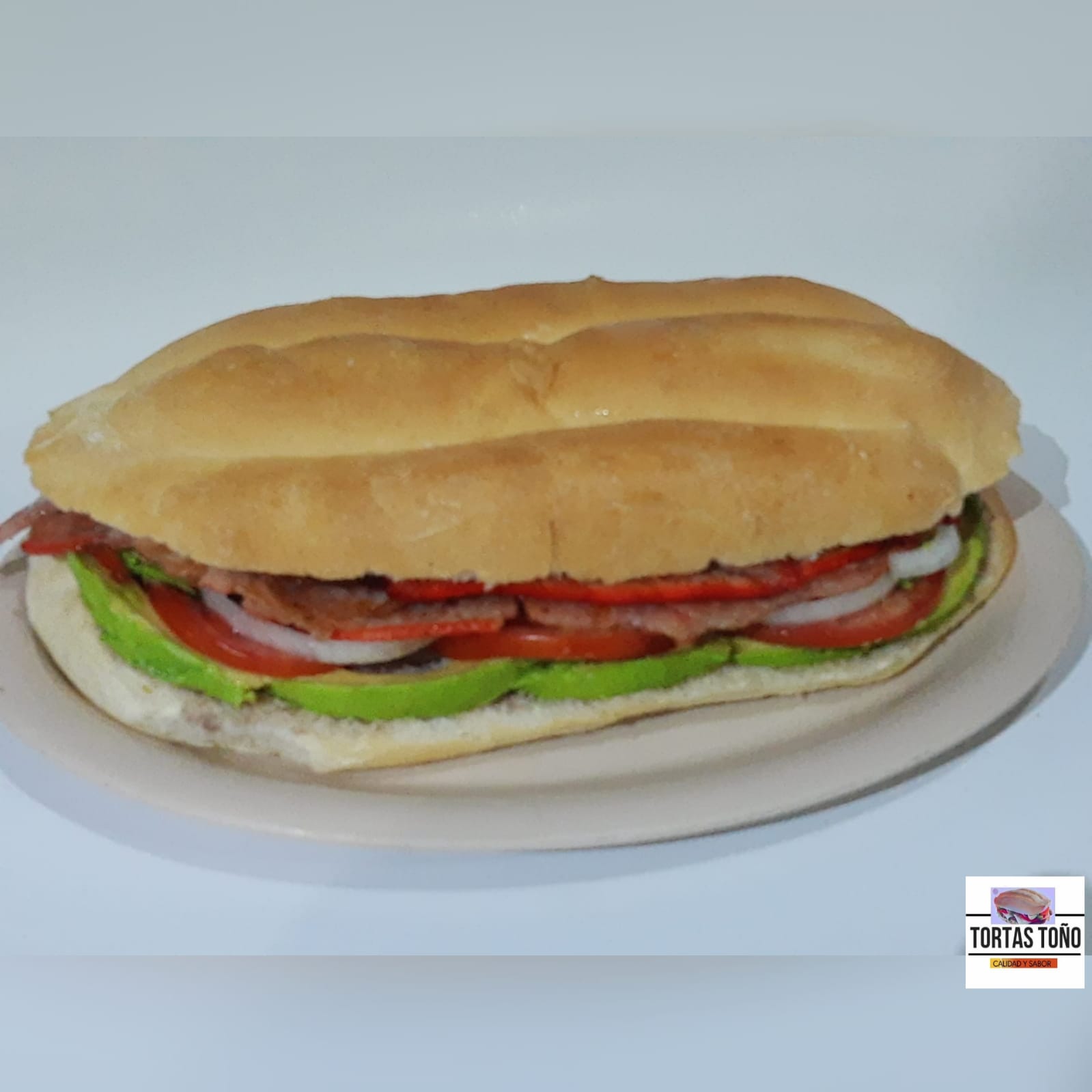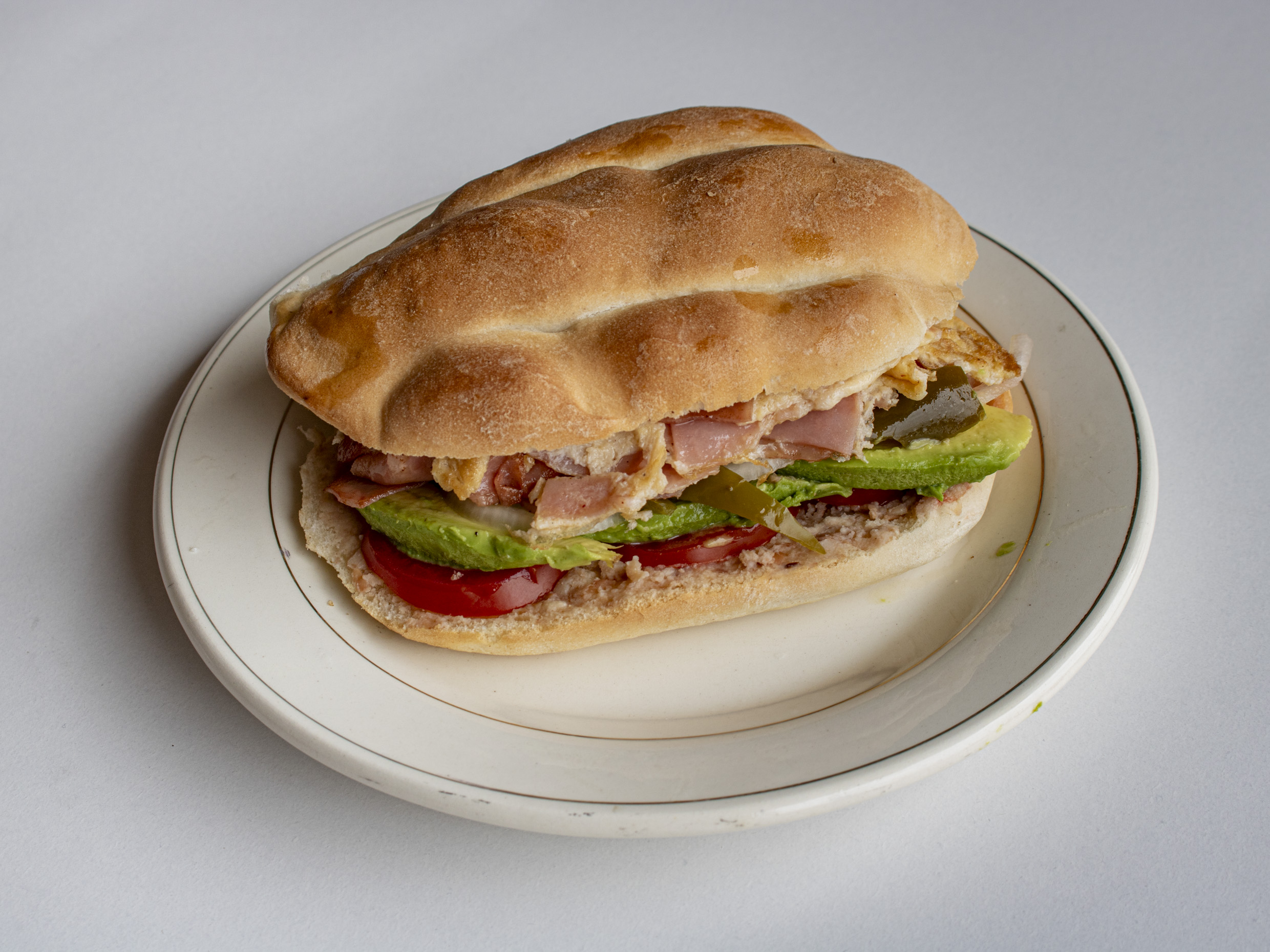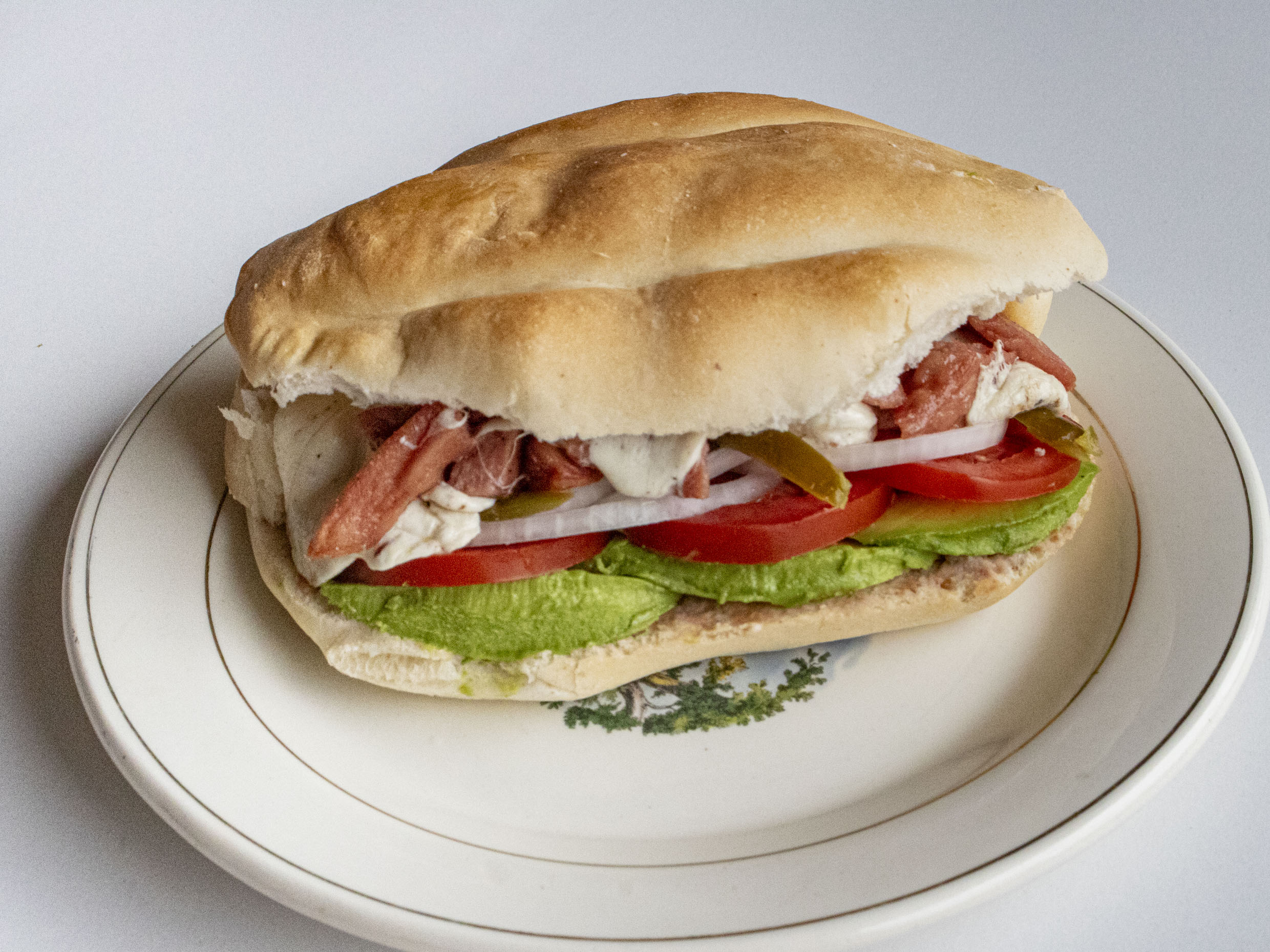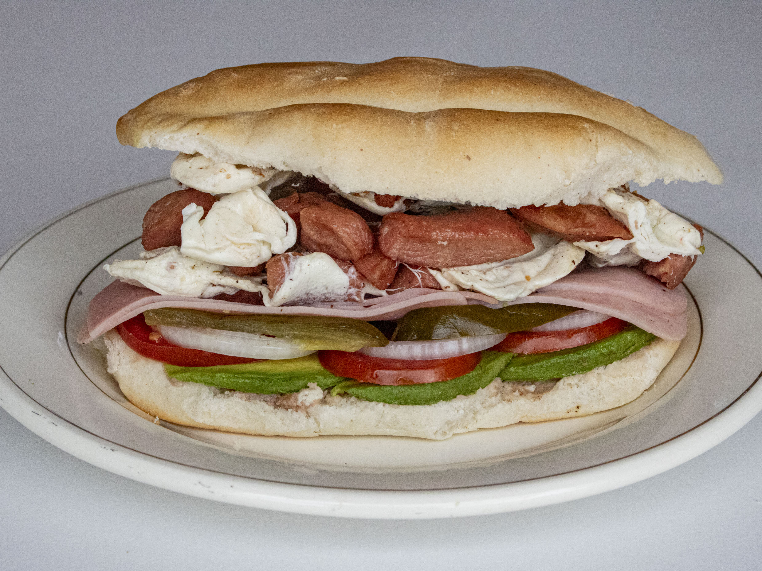 Torta preparada con frijoles, cebolla, jitomate, aguacate, crema o mayonesa, jamón de pavo, quesillo y picante a elegir.