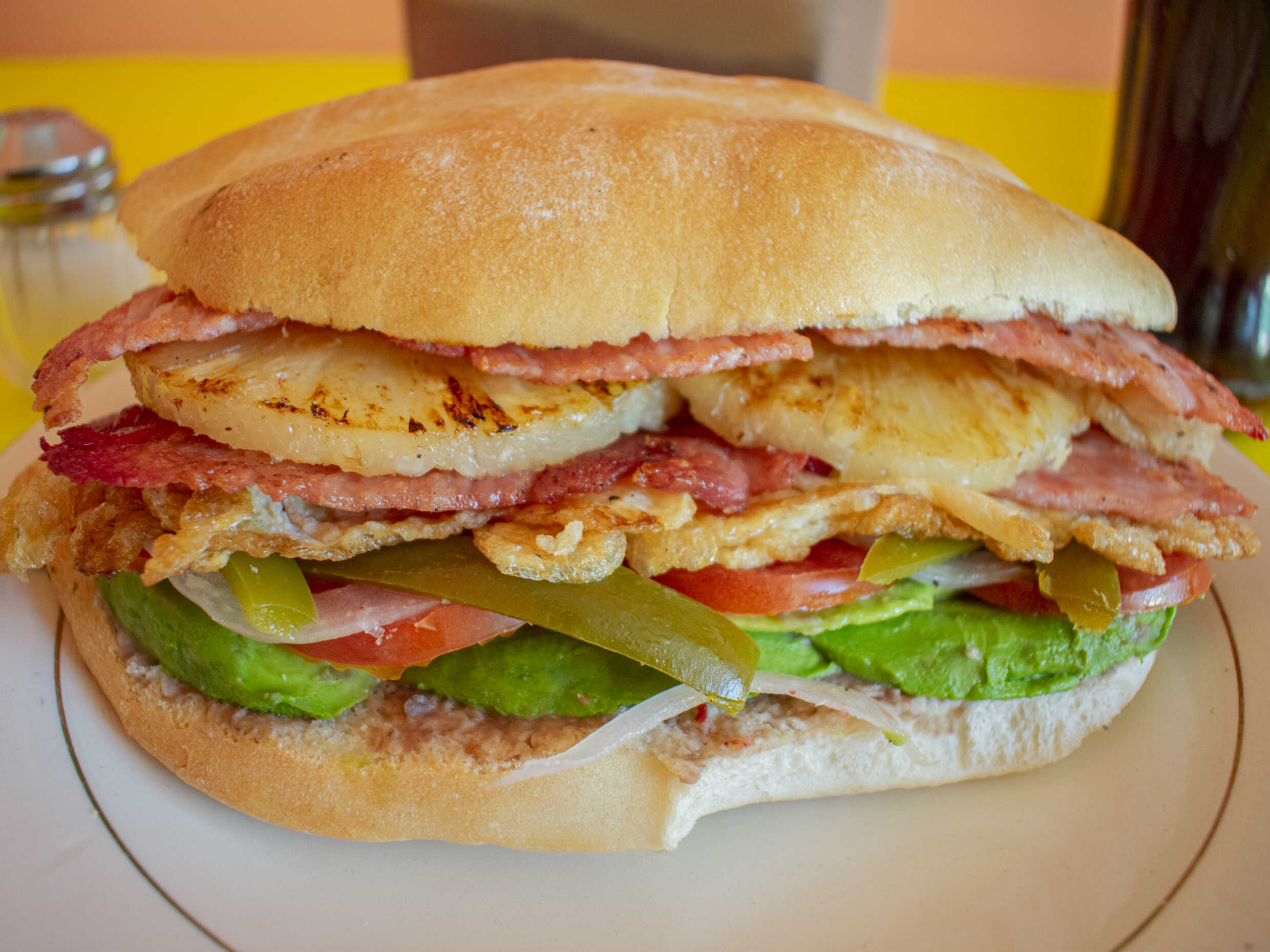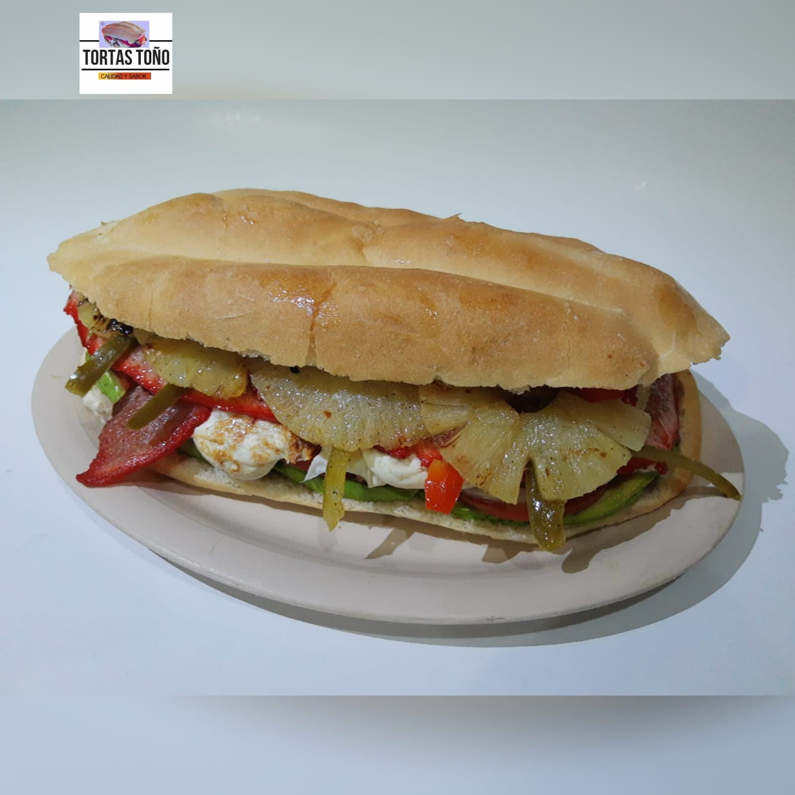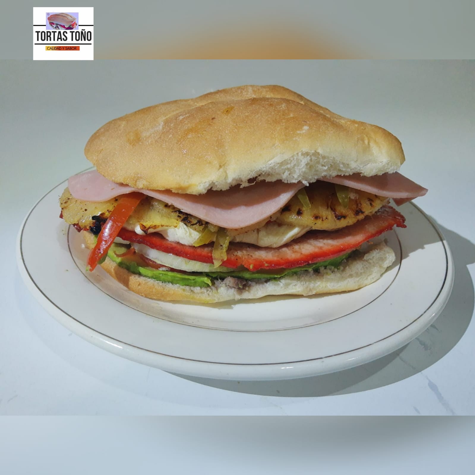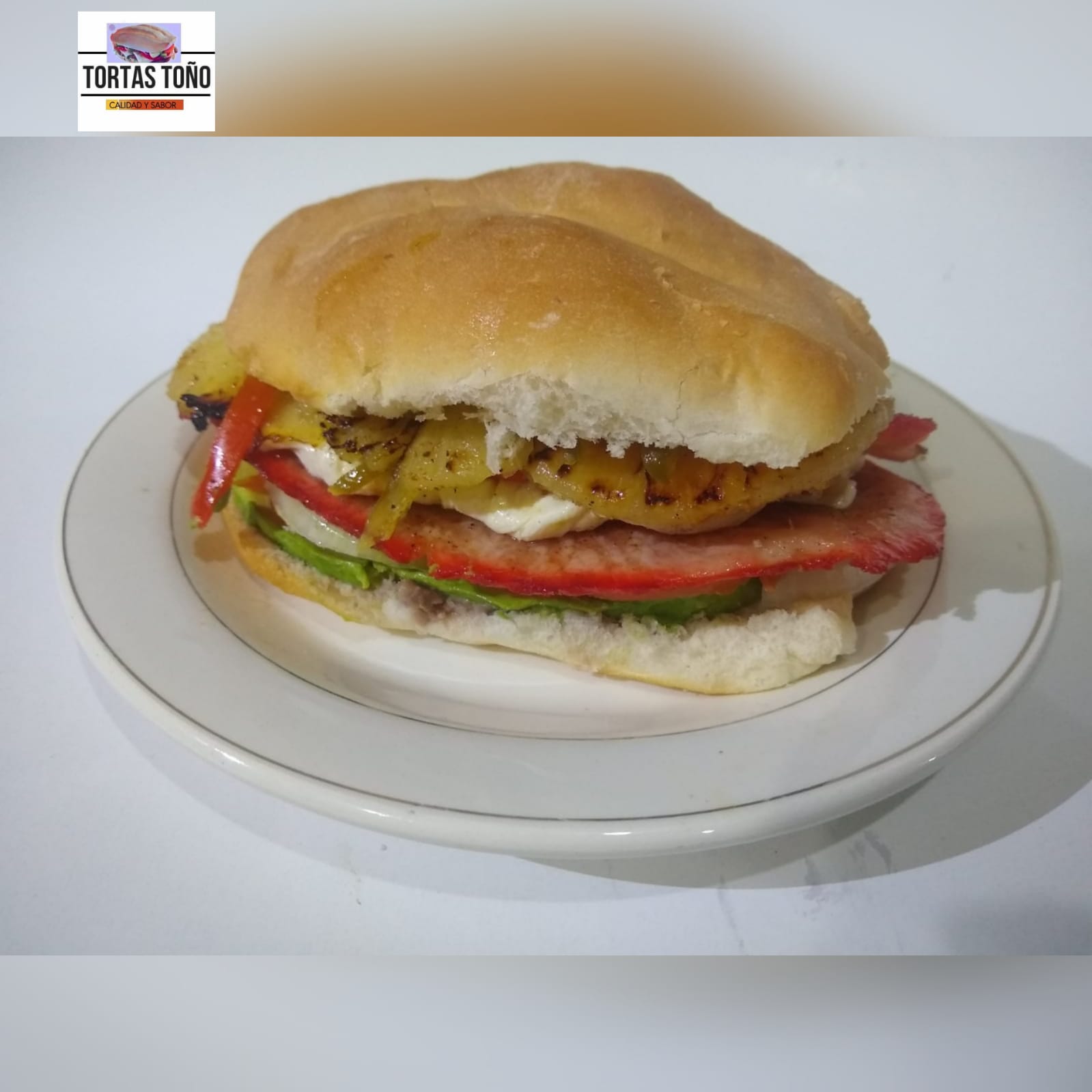 Torta preparada con frijoles, cebolla, jitomate, aguacate, crema o mayonesa, pierna, quesillo, piña y picante a elegir.