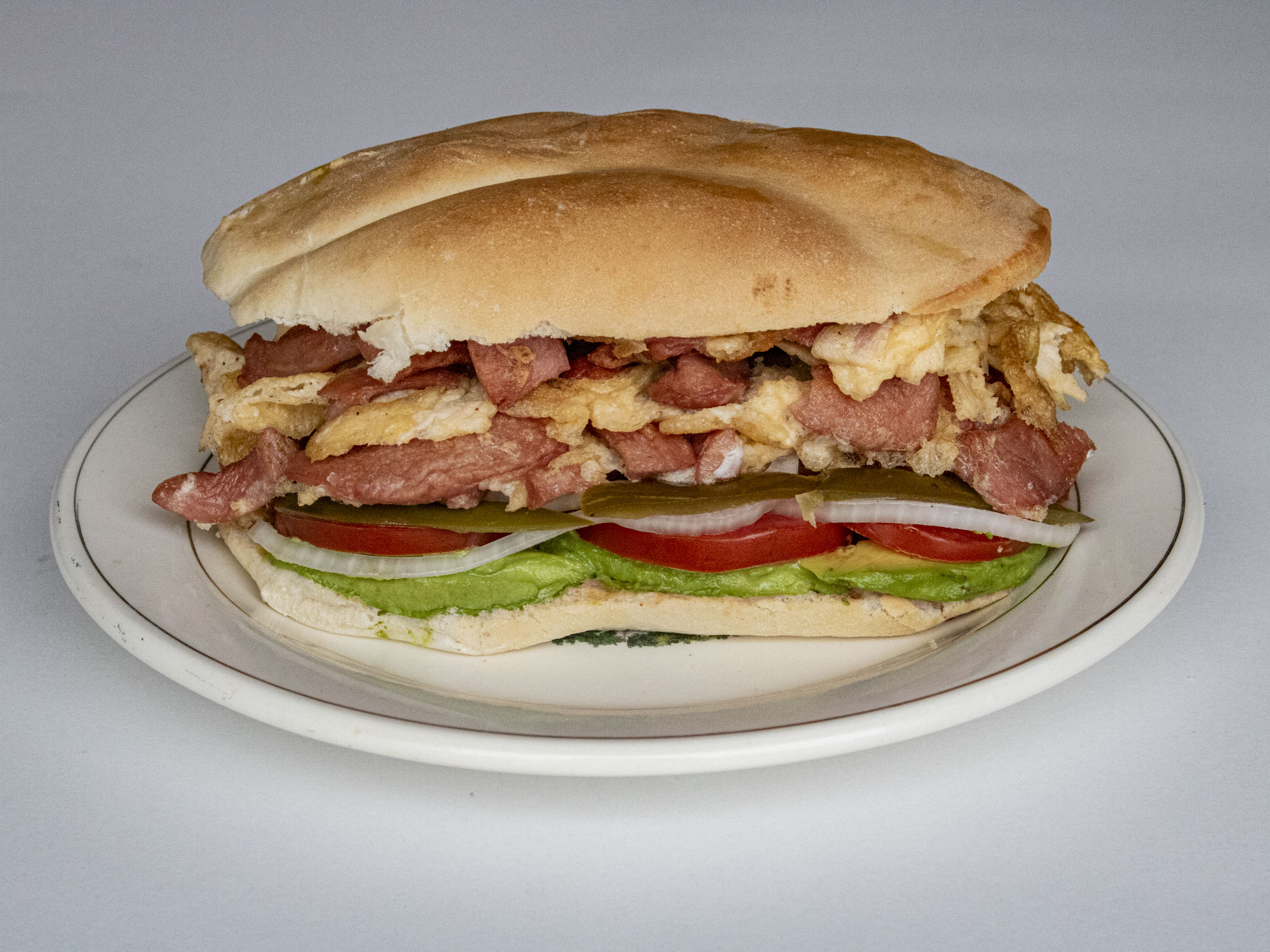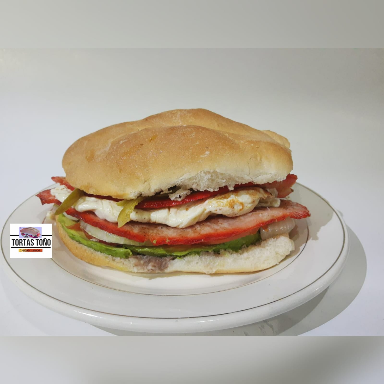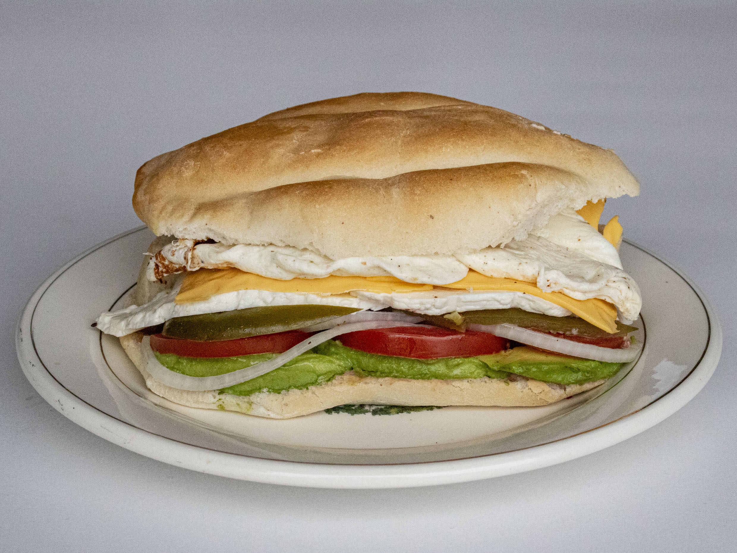 Torta preparada con frijoles, cebolla, jitomate, aguacate, crema o mayonesa, jamón de pavo, huevo, queso amarillo y picante a elegir.