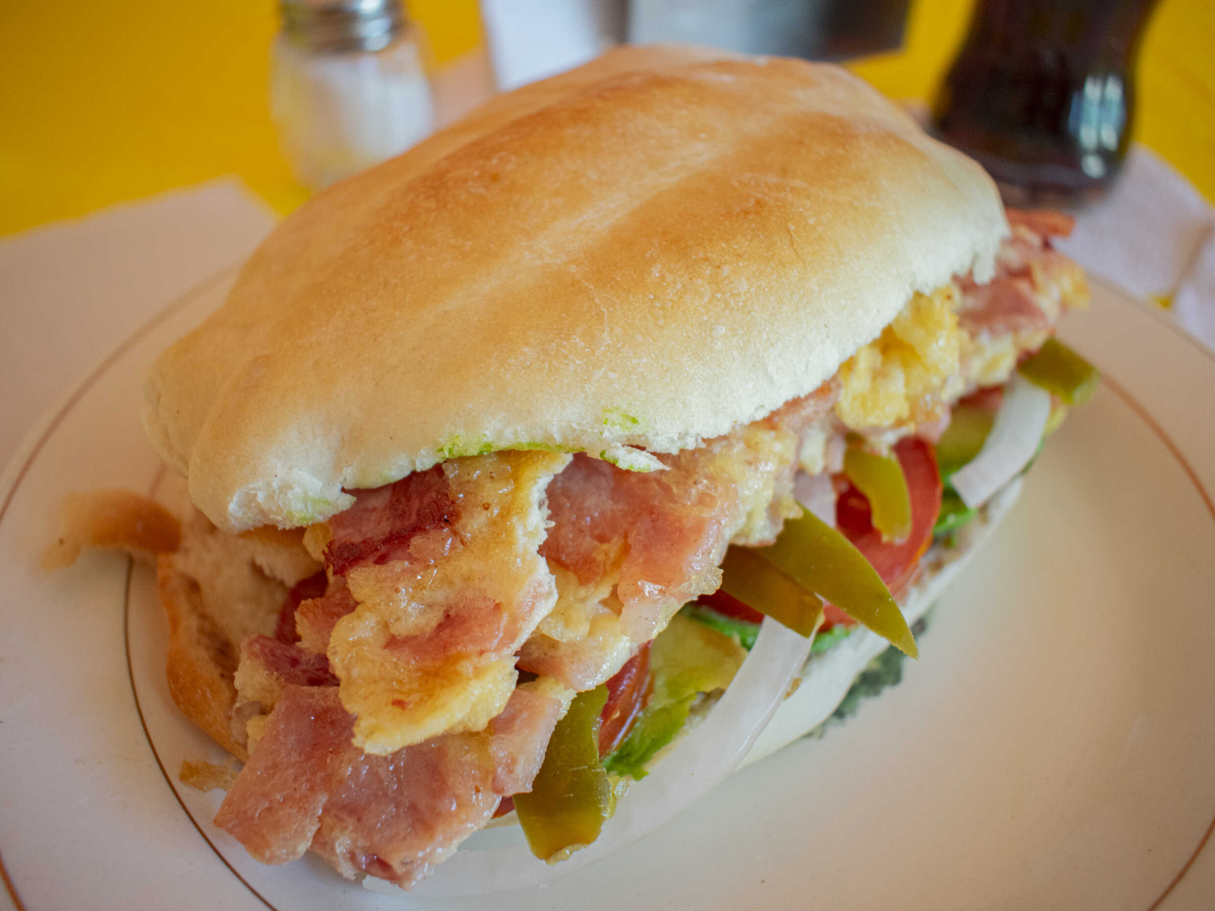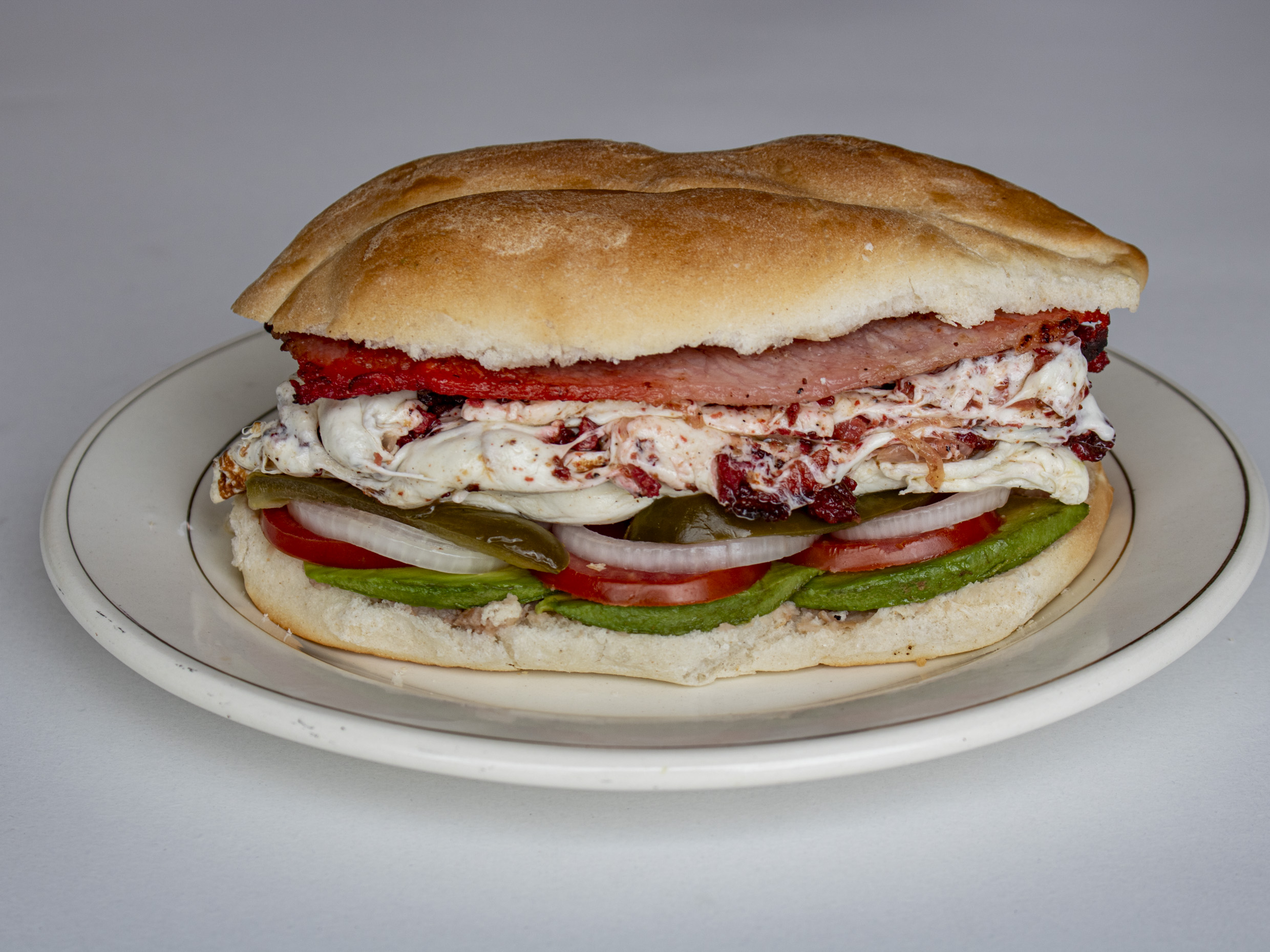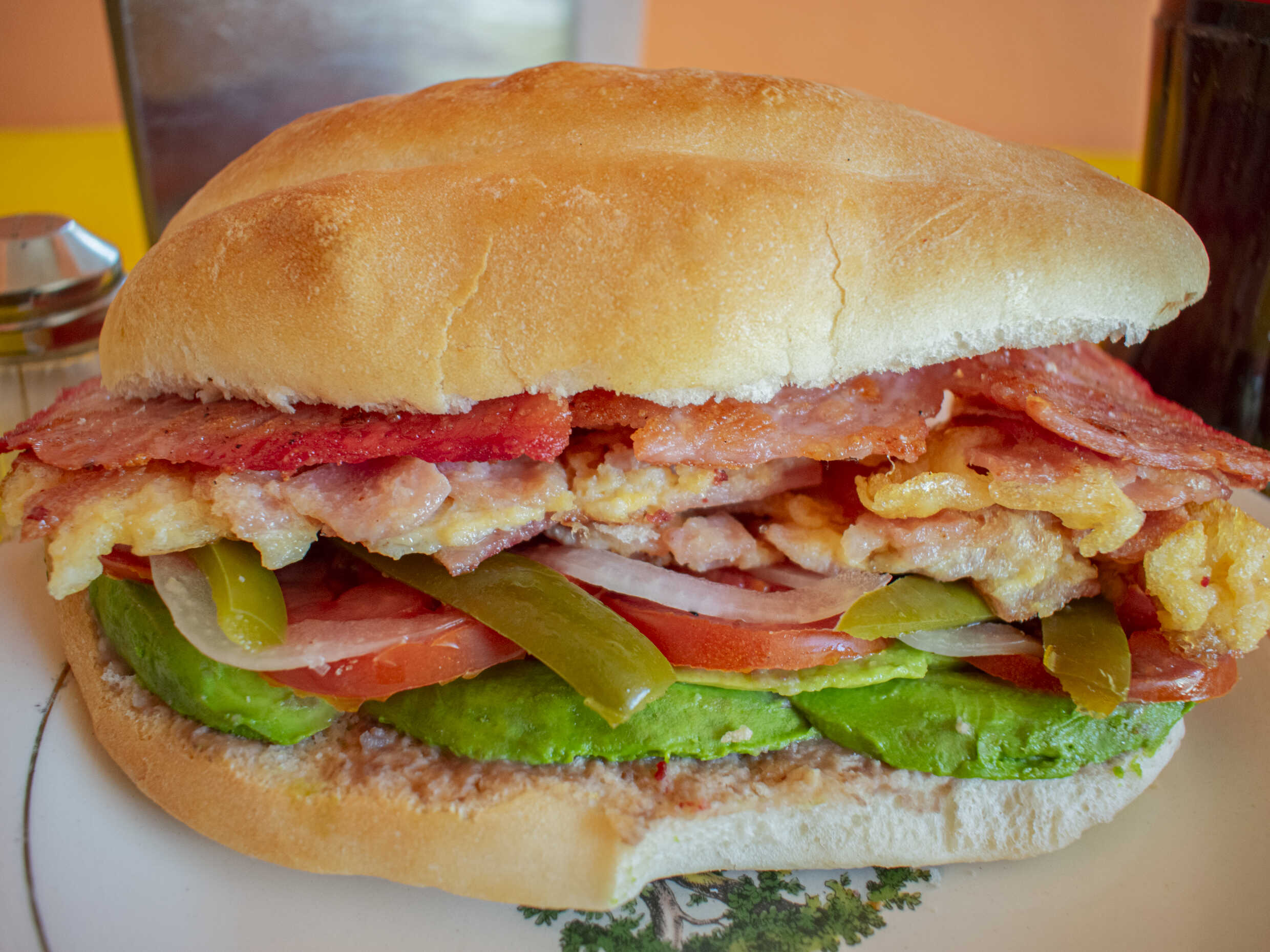 Torta preparada con frijoles, cebolla, jitomate, aguacate, crema o mayonesa, jamón de pavo, huevo, queso amarillo y picante a elegir.
