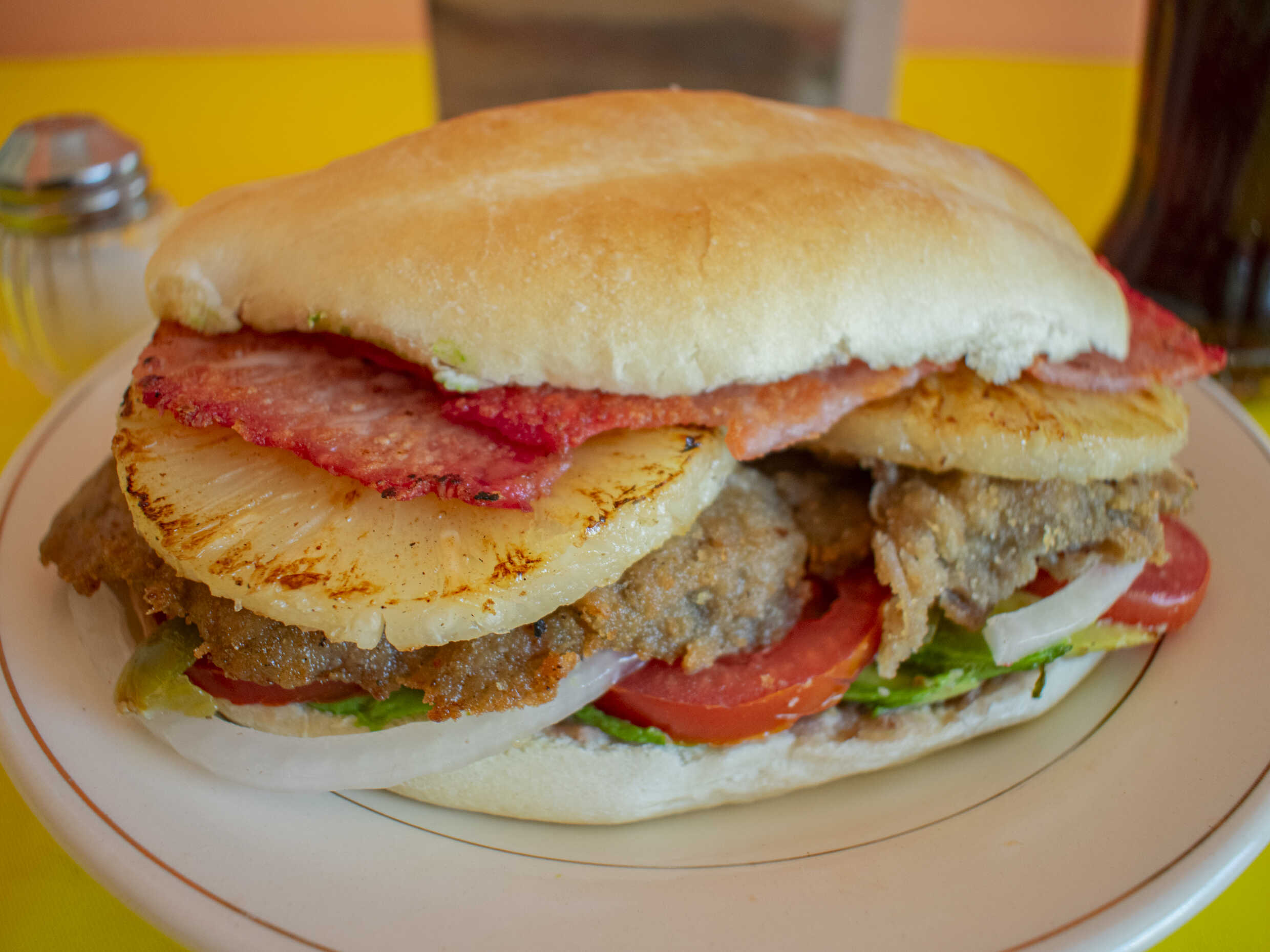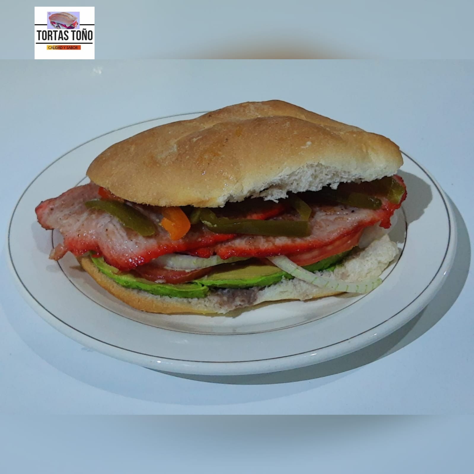 Torta preparada con frijoles, cebolla, jitomate, aguacate, crema o mayonesa, milanesa de res, pierna, piña y picante a elegir.