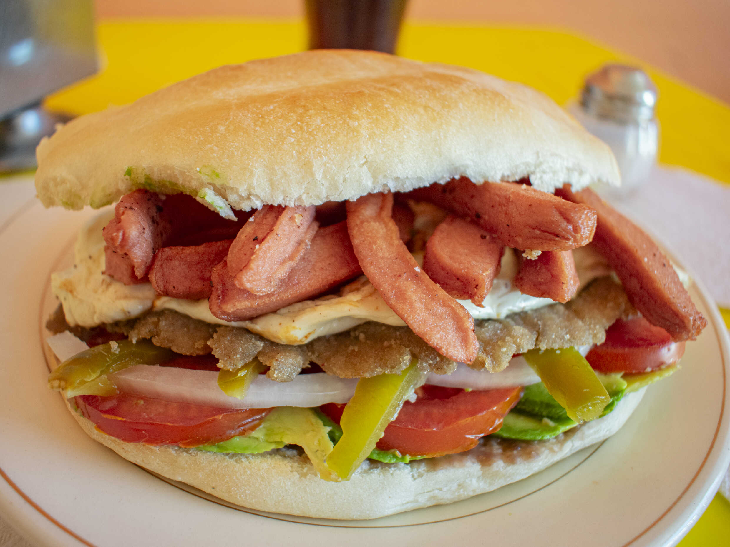 Torta preparada con frijoles, cebolla, jitomate, aguacate, crema o mayonesa, milanesa de res, salchicha, queso oaxaca y picante a elegir.