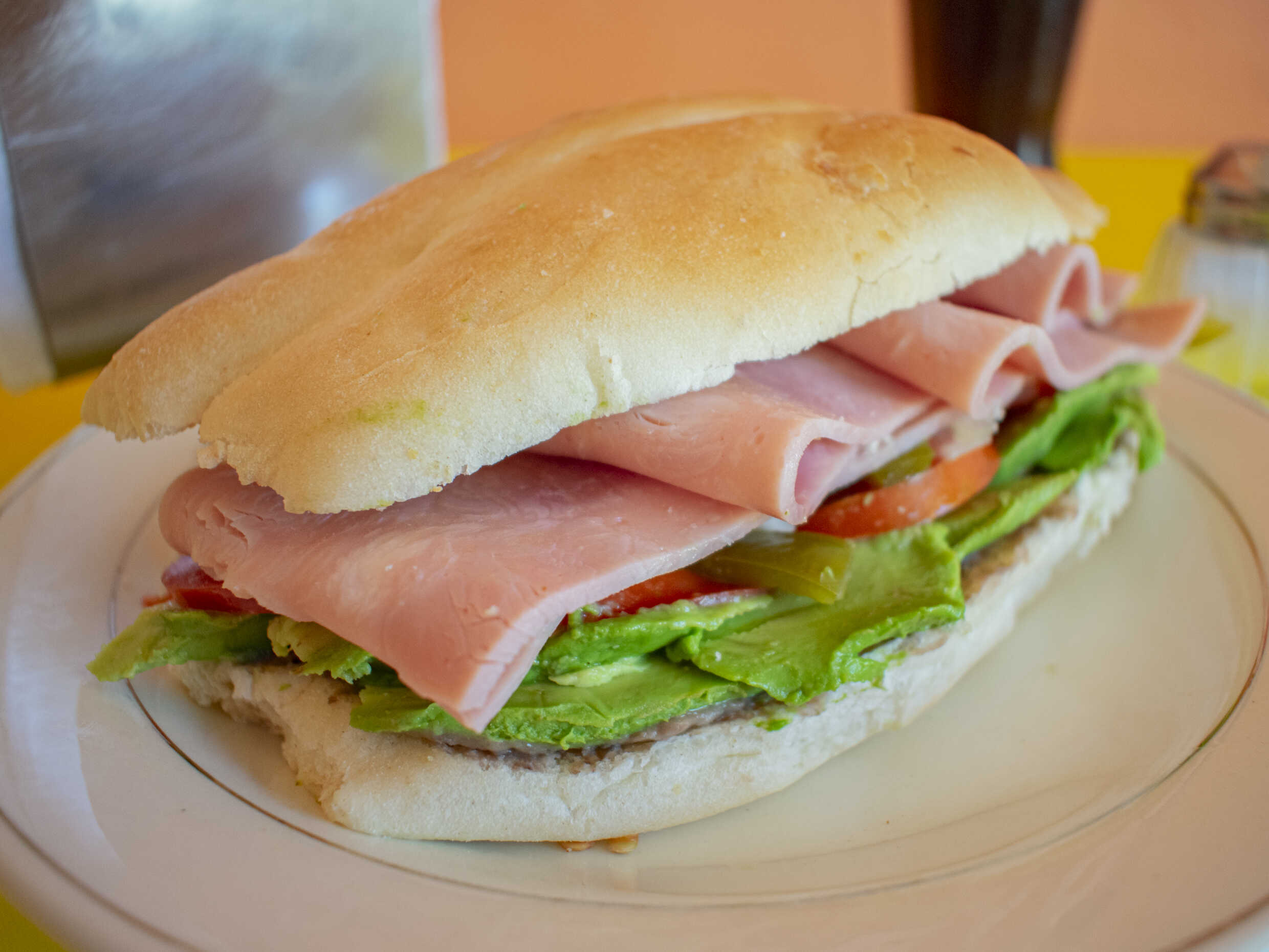 Torta preparada con frijoles, cebolla, jitomate, aguacate, crema o mayonesa, jamón de pavo y picante a elegir.
