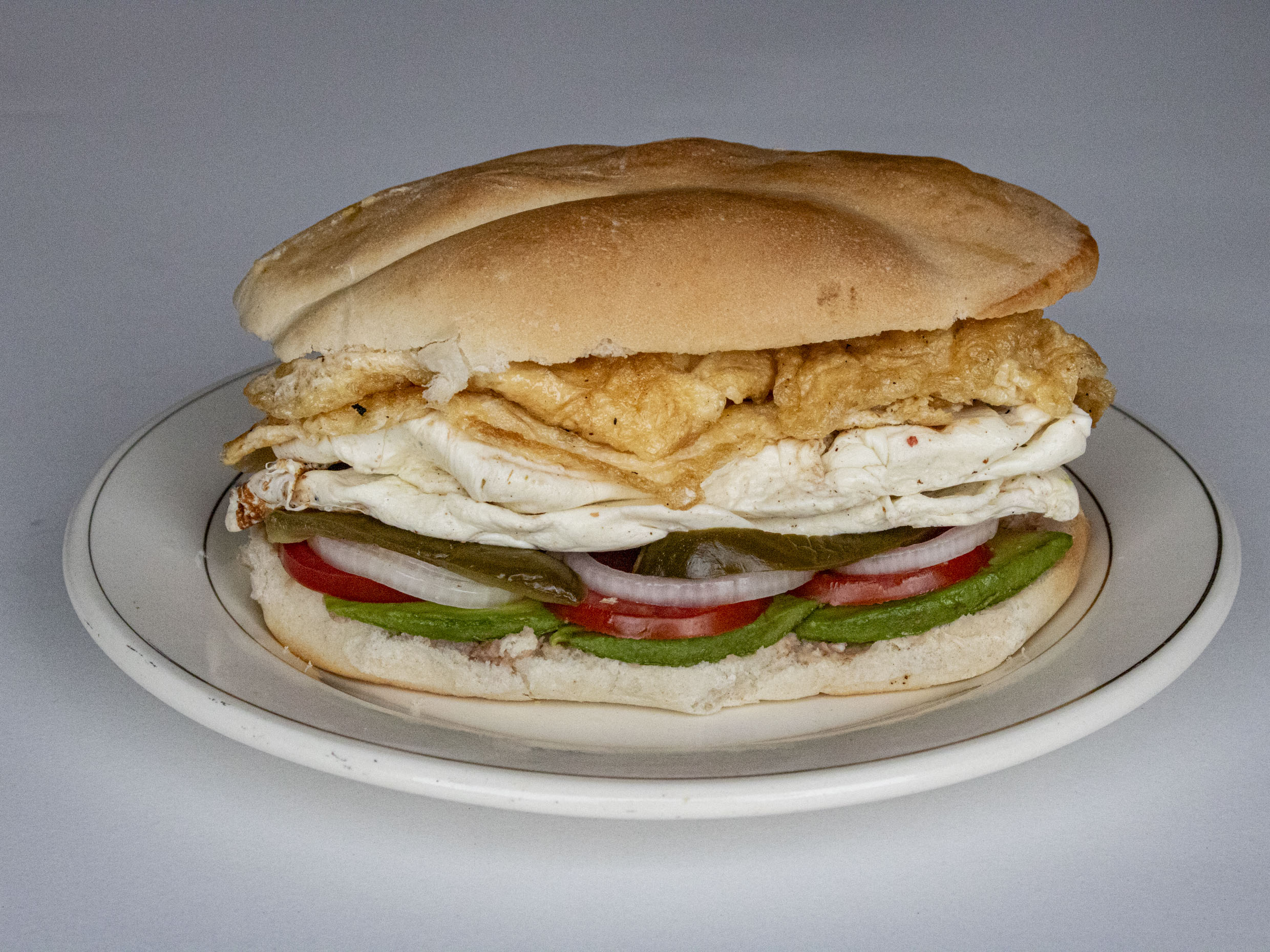 Torta preparada con frijoles, cebolla, jitomate, aguacate, crema o mayonesa, huevo y picante a elegir.