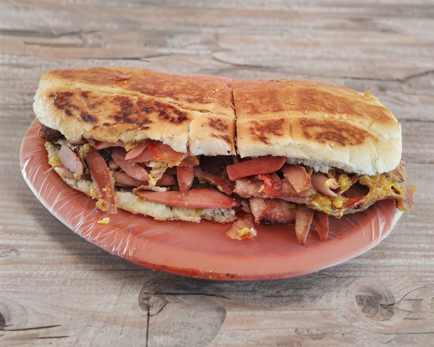 Milanesa, huevo, pierna, tocino, salchicha, queso blanco y quesillo.