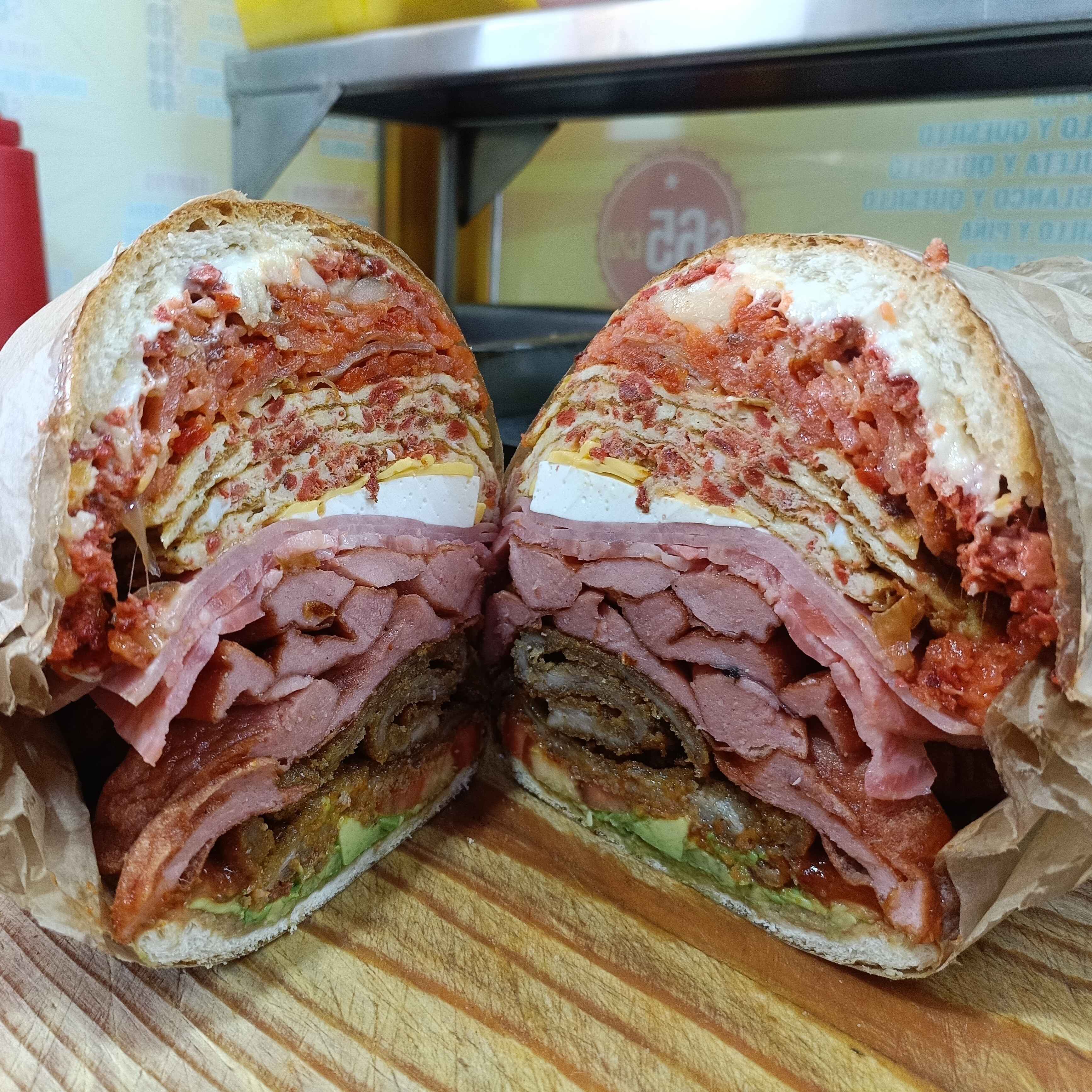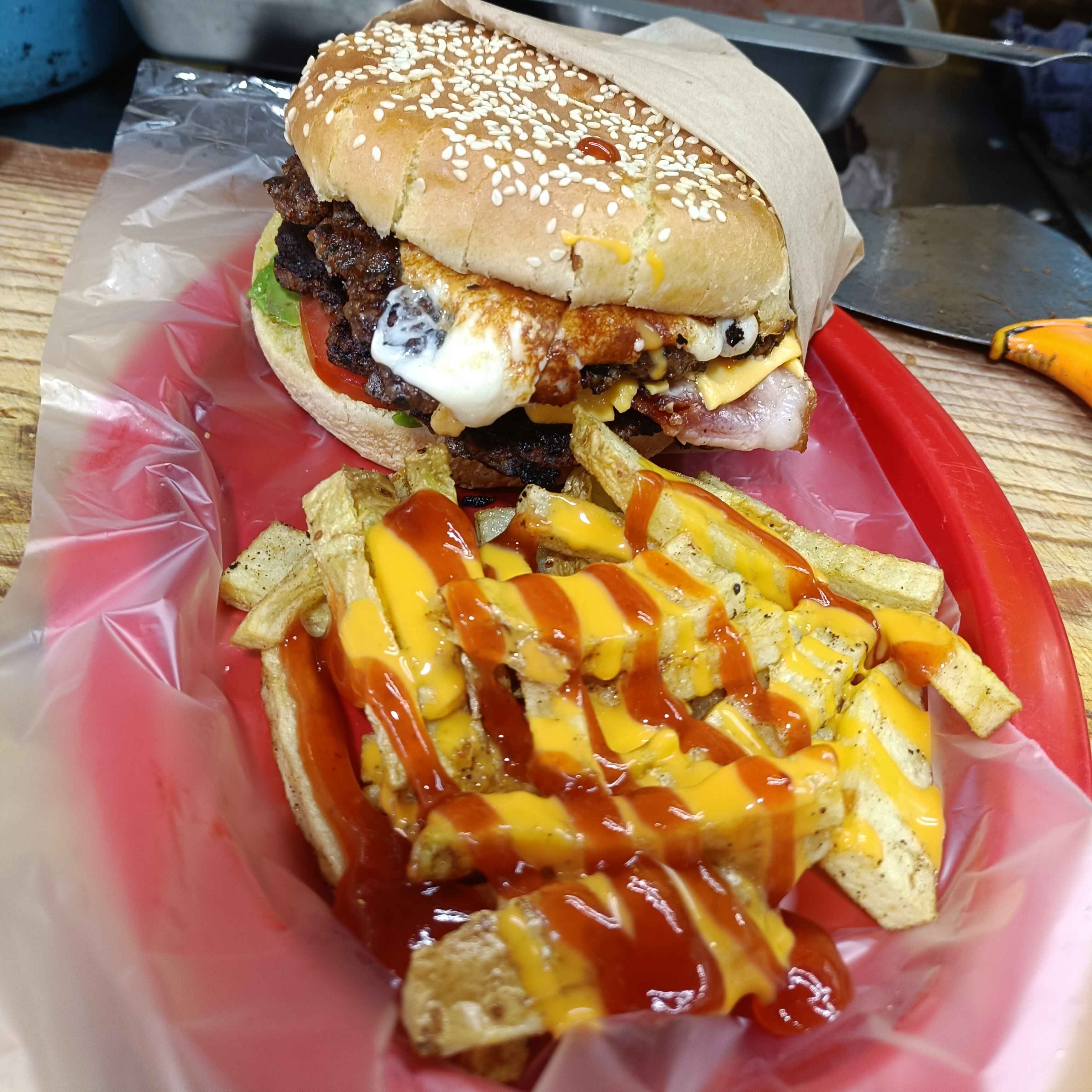 Doble carne, tocino, queso amarillo y quesillo lechuga jitomate