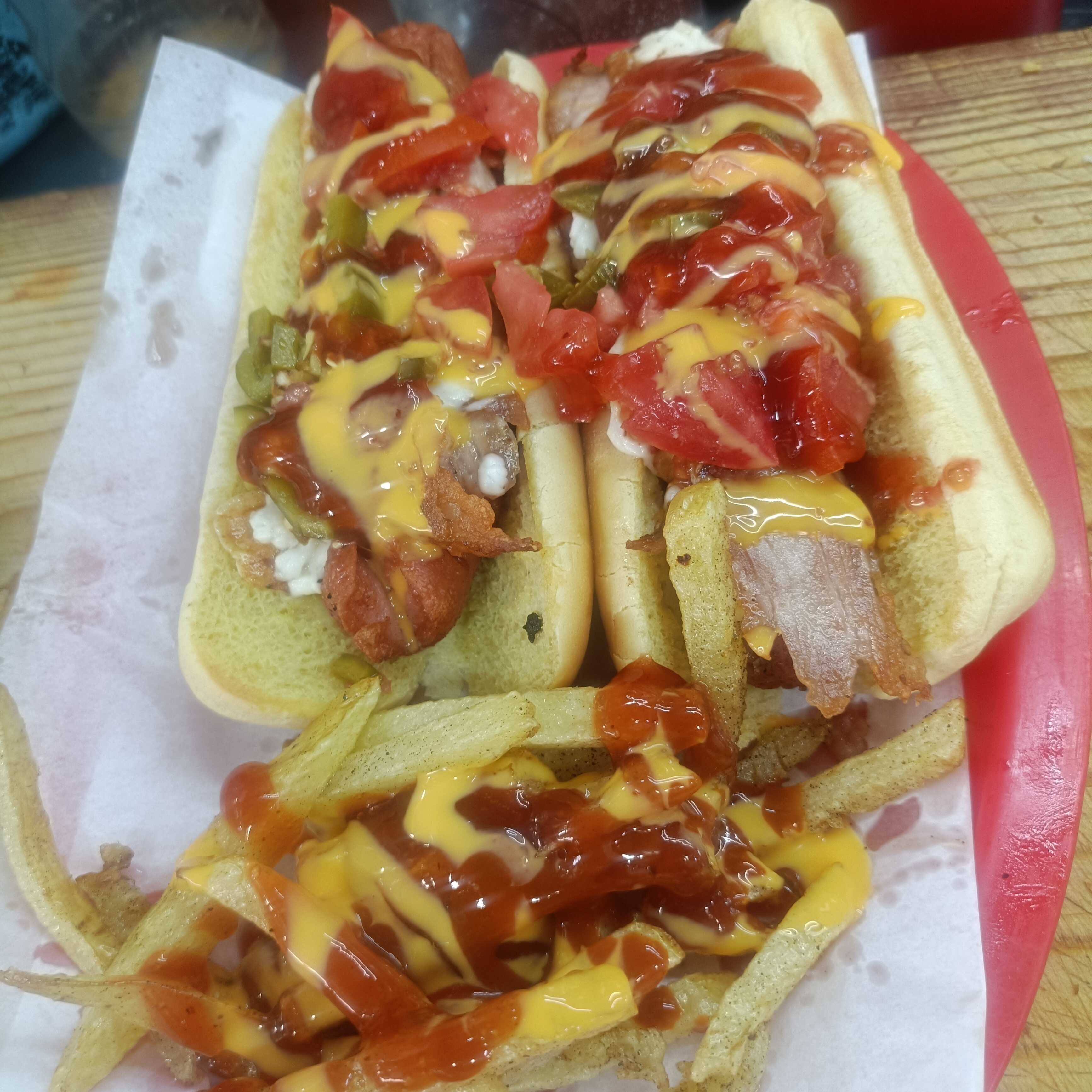 2 HOT DOGS CON TOCINO, QUESILLO Y PAPAS