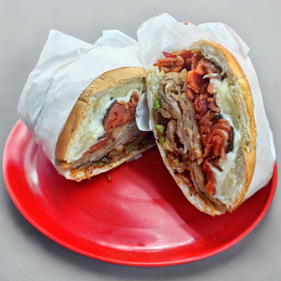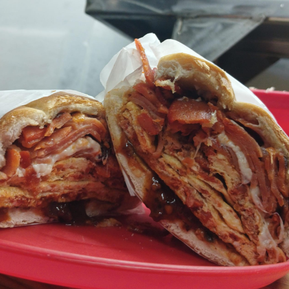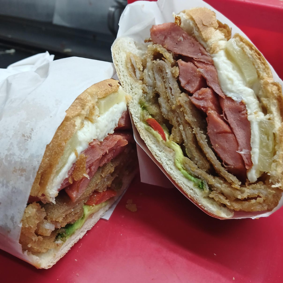La más completa de todas: milanesa, pierna, salchicha, jamón, chorizo, queso blanco, queso amarillo, huevo, quesillo y piña.