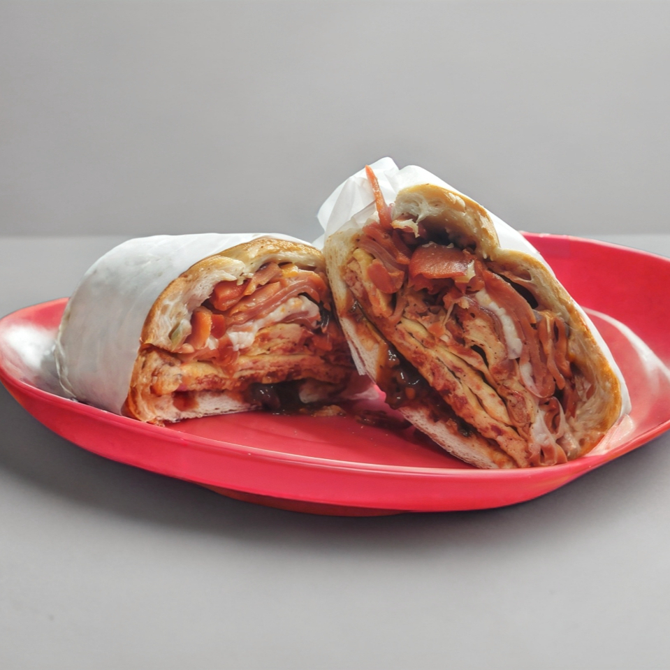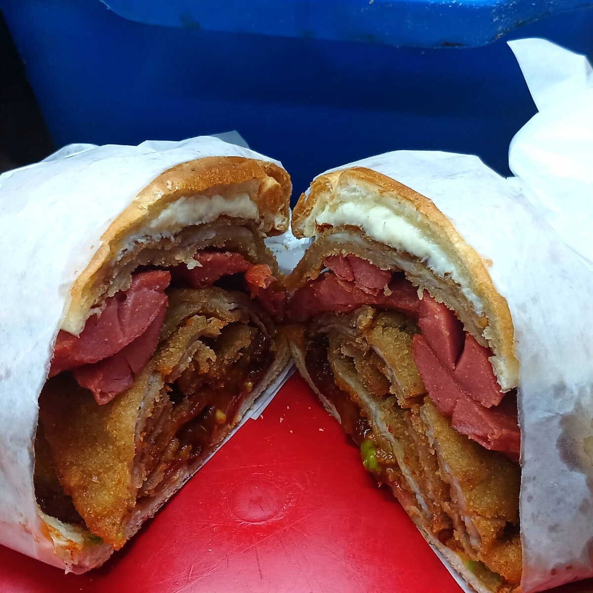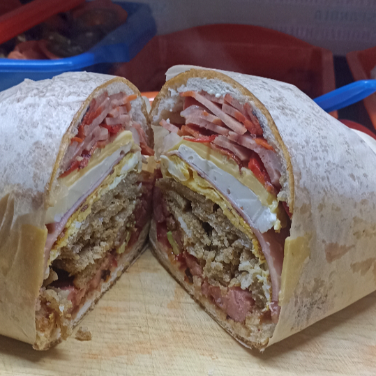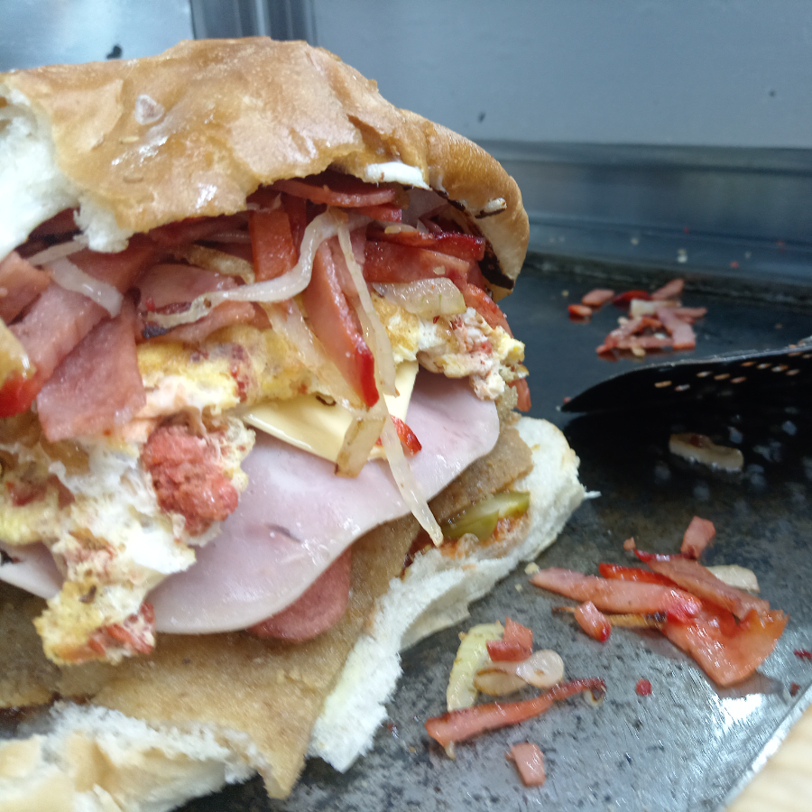 La clásica gigante con milanesa, pierna, jamón, queso amarillo, salchicha, huevo y queso blanco.