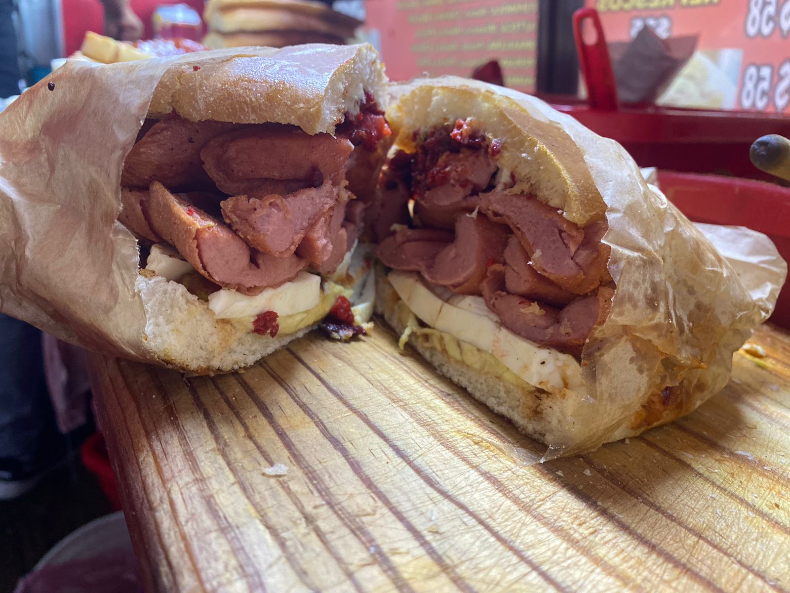 Salchicha, chorizo y queso amarillo.