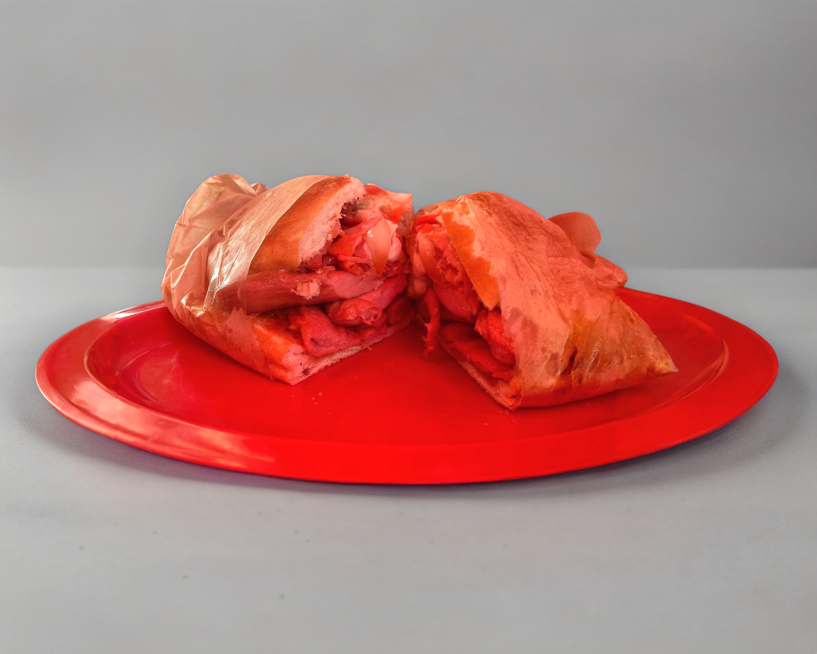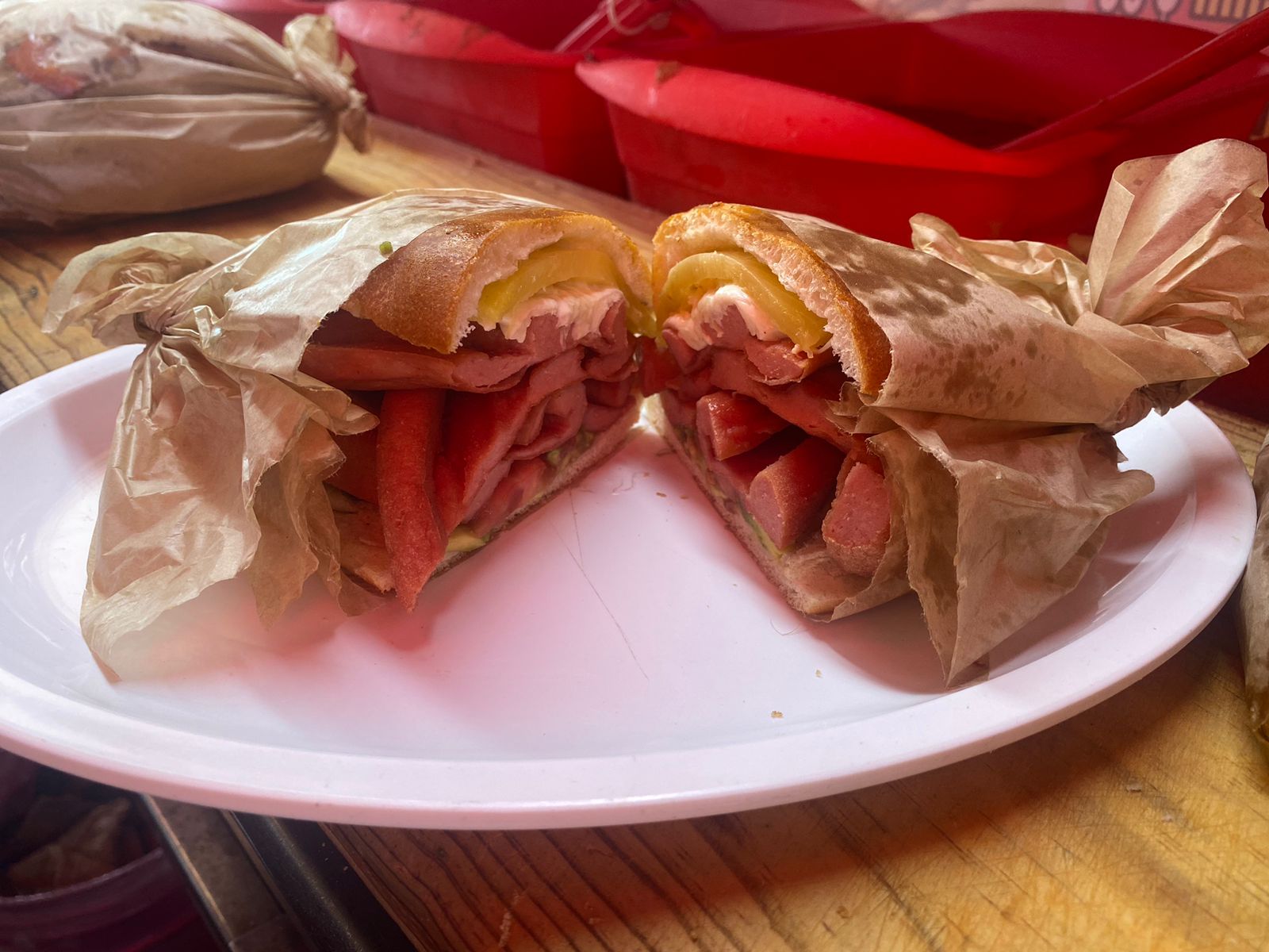 Pan telera, milanesa de cerdo 200 gramos aprox , salchicha, quesillo, chipotle y rajas. Se envia dividida en 2.