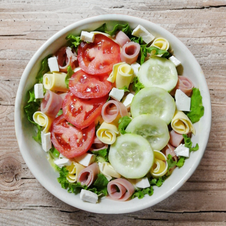 Mezcla de Lechuga, Jamón, Jitomate, Pepino, Queso Panela, Manchego y Parmesano