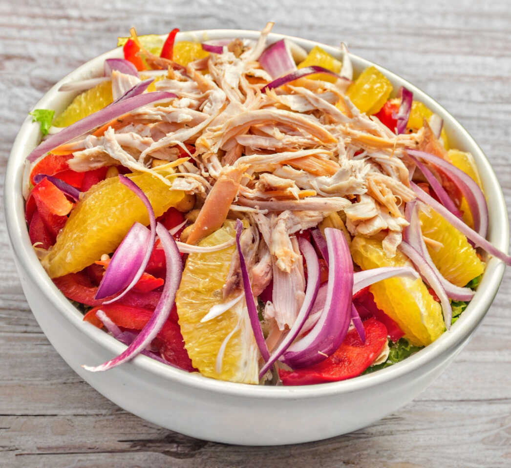 Mezcla de Lechuga, Suprema de Naranja, Pimiento, Nuez de la India, Cebolla, Pollo y Queso Parmesano