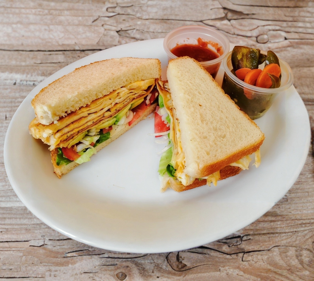 Una carne ,queso amarillo ,jitomate aguacate cebolla mayonesa.
